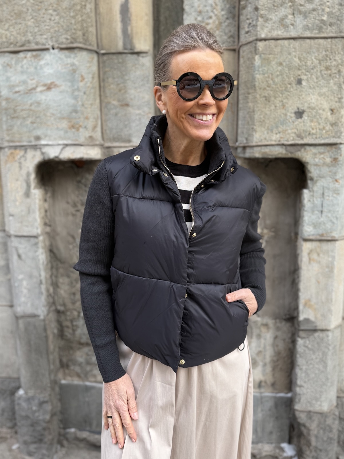 Harper pusakka neuloshihoilla on kerrassaan ylellisen tuntuinen pusakka! Pusakassa on polyesteri vanu sisällä. Hihat ja sisäkaulus ovat joustavaa neulosta. Edessä on sekä painonapit että kullanvärinen vetoketju. Kauluksen saa kuvan mukaisesti ihan ylös asti kiinni. Pusakan sisällä, helmassa on kiristysnauhat eli helman saa kiristettyä ja käännettyä pussille (katso kuva). Pusakan sivuissa on taskut. Pusakka ylettyy lantiolle. Minulla on pusakasta päällä koko 34. Pusakka on reiluhkoa kokoa ja hihat joustavat reilusti.