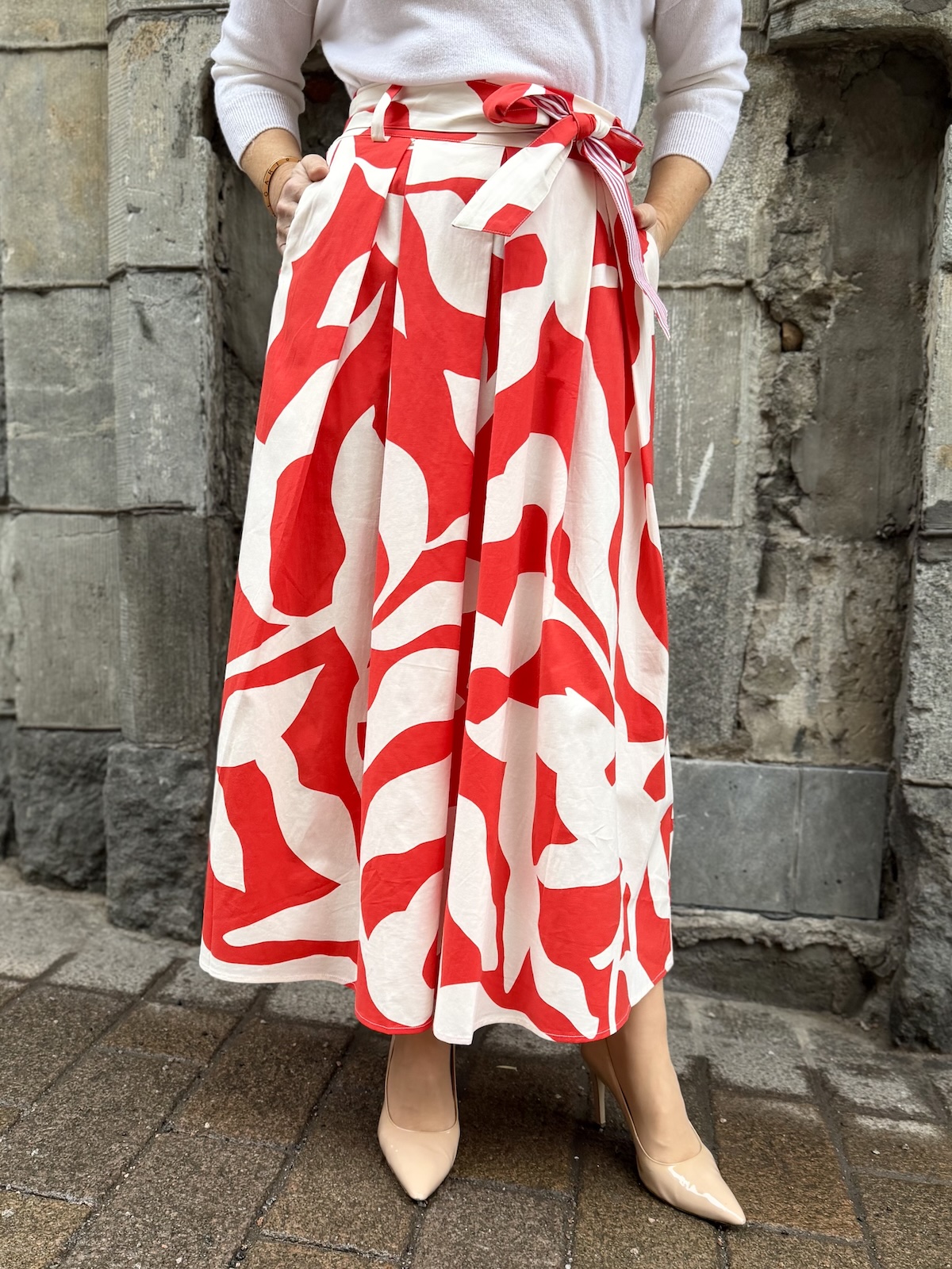 Kiara midihame on näyttävä. Hameen edessä on sileä vyötärönauha, mutta takaosassa vyötärönauhaa on kuminauha. Vyötärö joustaa reippaasti. Vyötärönauhassa on vyölenkit ja sidottava vyö. Hameen edessä on laskoksia ja hame levenee alaspäin, lähelle nilkkoja. Hameen sivuissa on taskut. Hame on reiluhkoa kokoa, suosittelemme siitä yhtä kokoa pienempää kuin normaalisti käyttää. Miinulla on hameesta päällä koko 34.