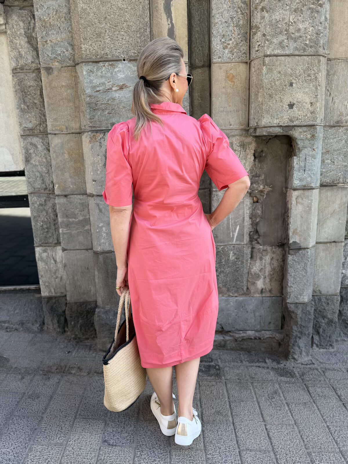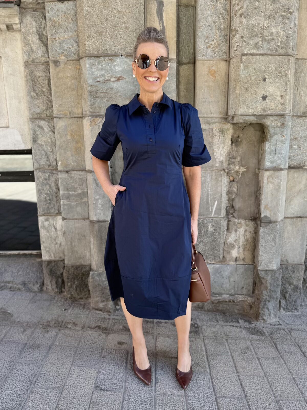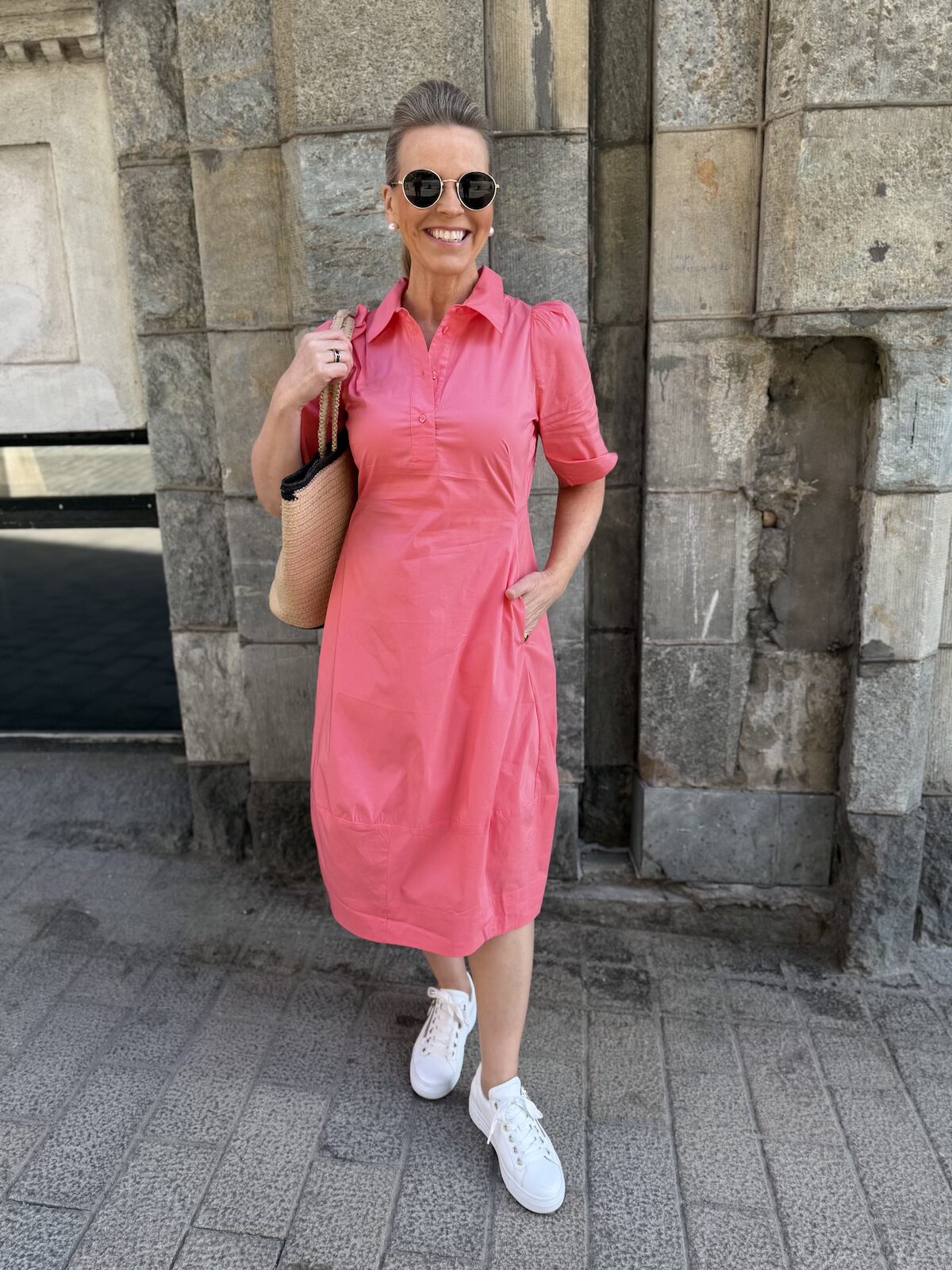 Tässä uudessa pallomekko versiossa on kaulukset ja edessä on muutama nappi. Hihat ovat löysähköt ja suora ja ne ylettyvät juuri kyynerpäiden yläpuolelle. Mekko on slimmattu vyötärön kohdasta ja helmaosa on pallomainen ja se loppuu reilusti polvien alapuolelle. Mekon sivuissa on taskut.