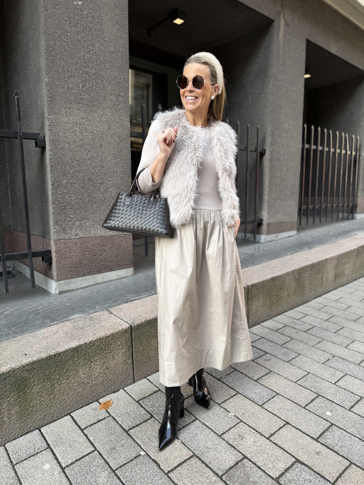 Elinalla on samansarjan mekko ja In Wearin luonnonvalkoinen neuletakki.