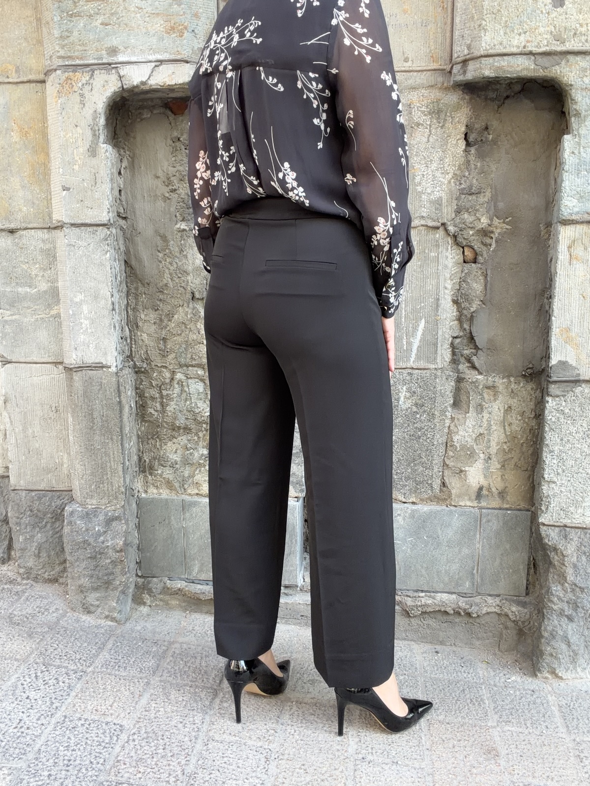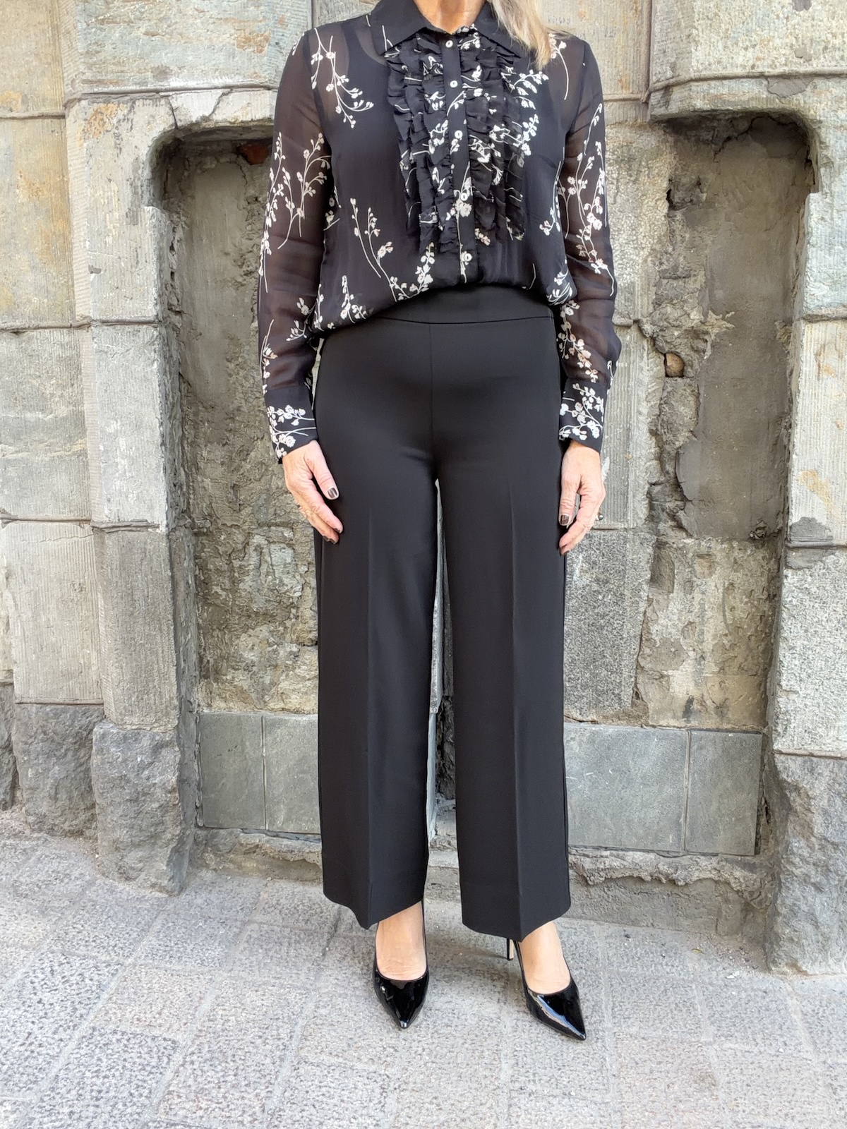 Zhen culottehousut ovat loistavat housut arkeen, mutta ne menevät myös pieneen menoon tai juhlaan. Housuissa on leveä vyötärönauha ja toisessa sivussa on piilovetoketju. Housut istuvat napakasti lantiosta ja vyötärö ylettyy reilusti navan päälle. Lahkeet ovat ihan suorat ja ne loppuvat noin nilkkaluiden kohdalle. Katalla on housuista päällä koko 34.