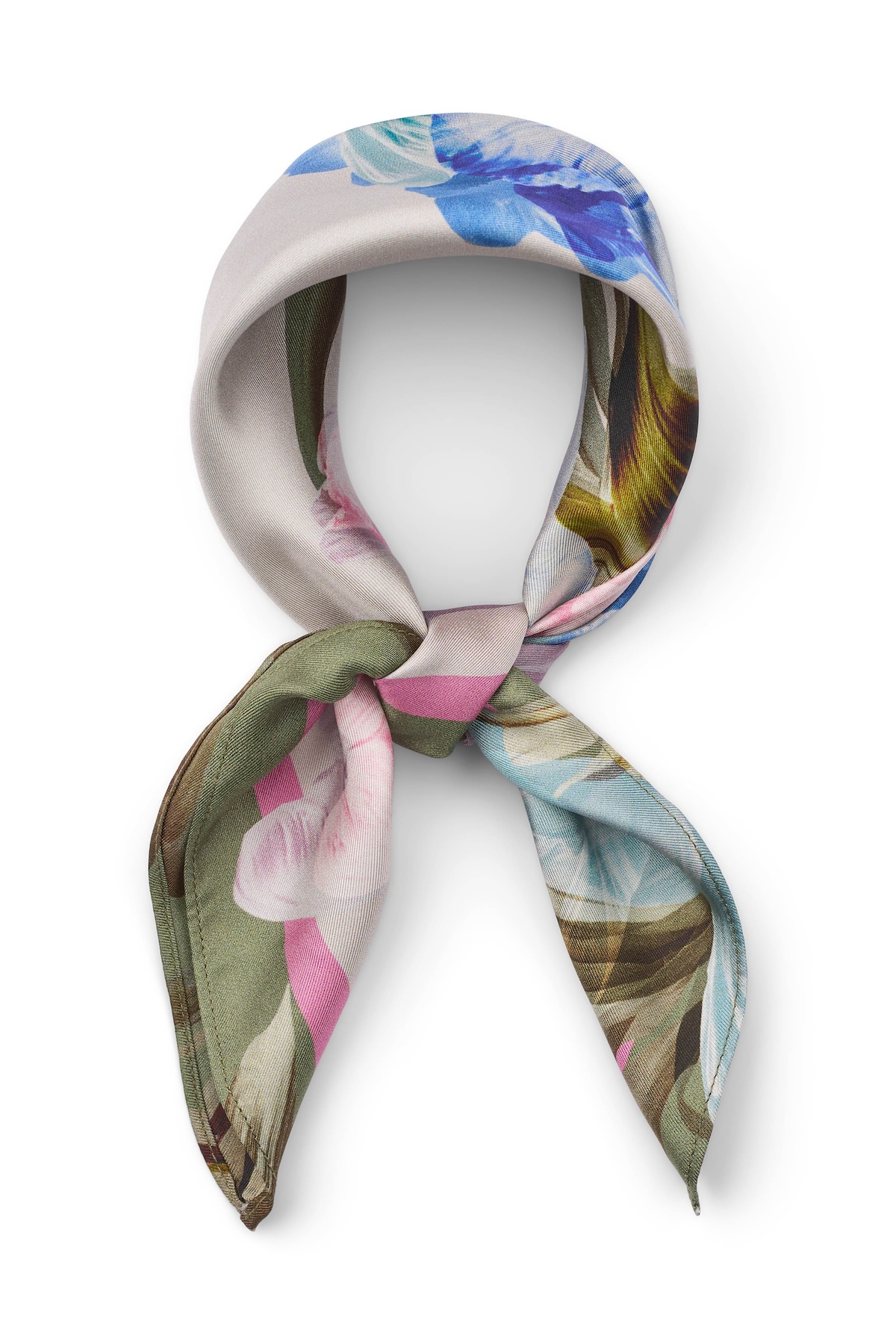 Pbo:n silkkihuivissa on kaunis kukkakuvio. Kuviosta löytyy myös rosan eri sävyjä, sinistä ja vihreää. Huivin koko on 50 x 50 cm.