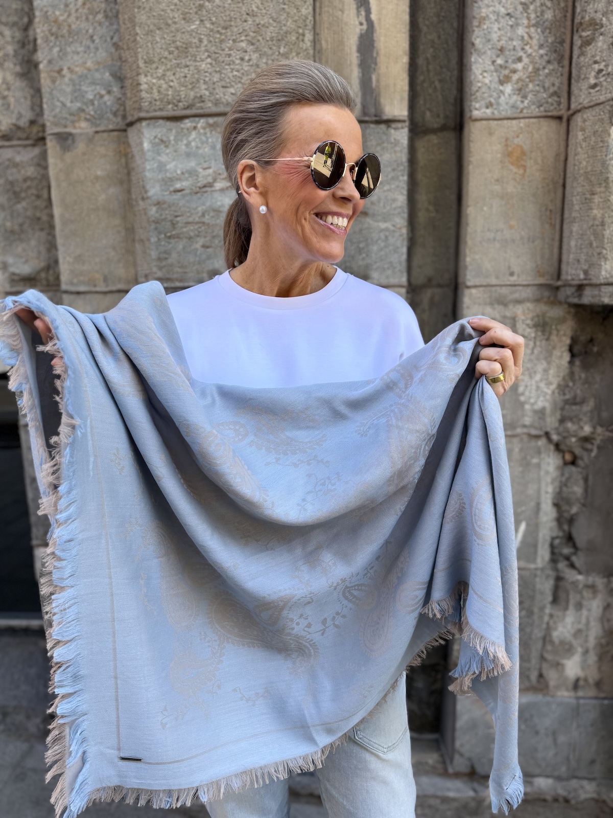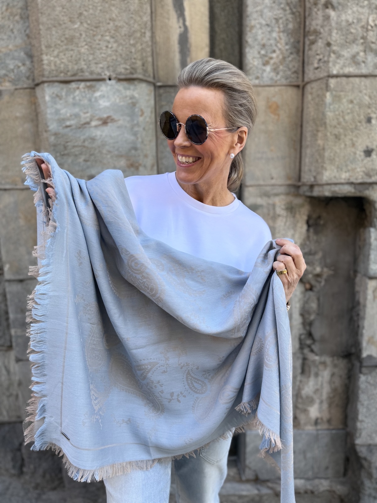 Veda on kaunis paisleykuvioinen huivi, joka on pehmoista ja miellyttävää materiaalia. Huivi on neliönmallinen ja koko on n. 120 x 120 cm.