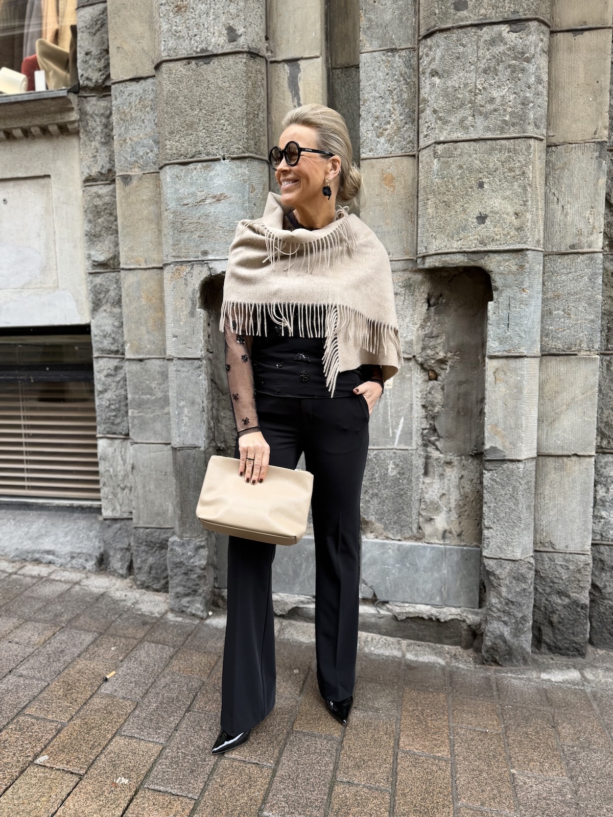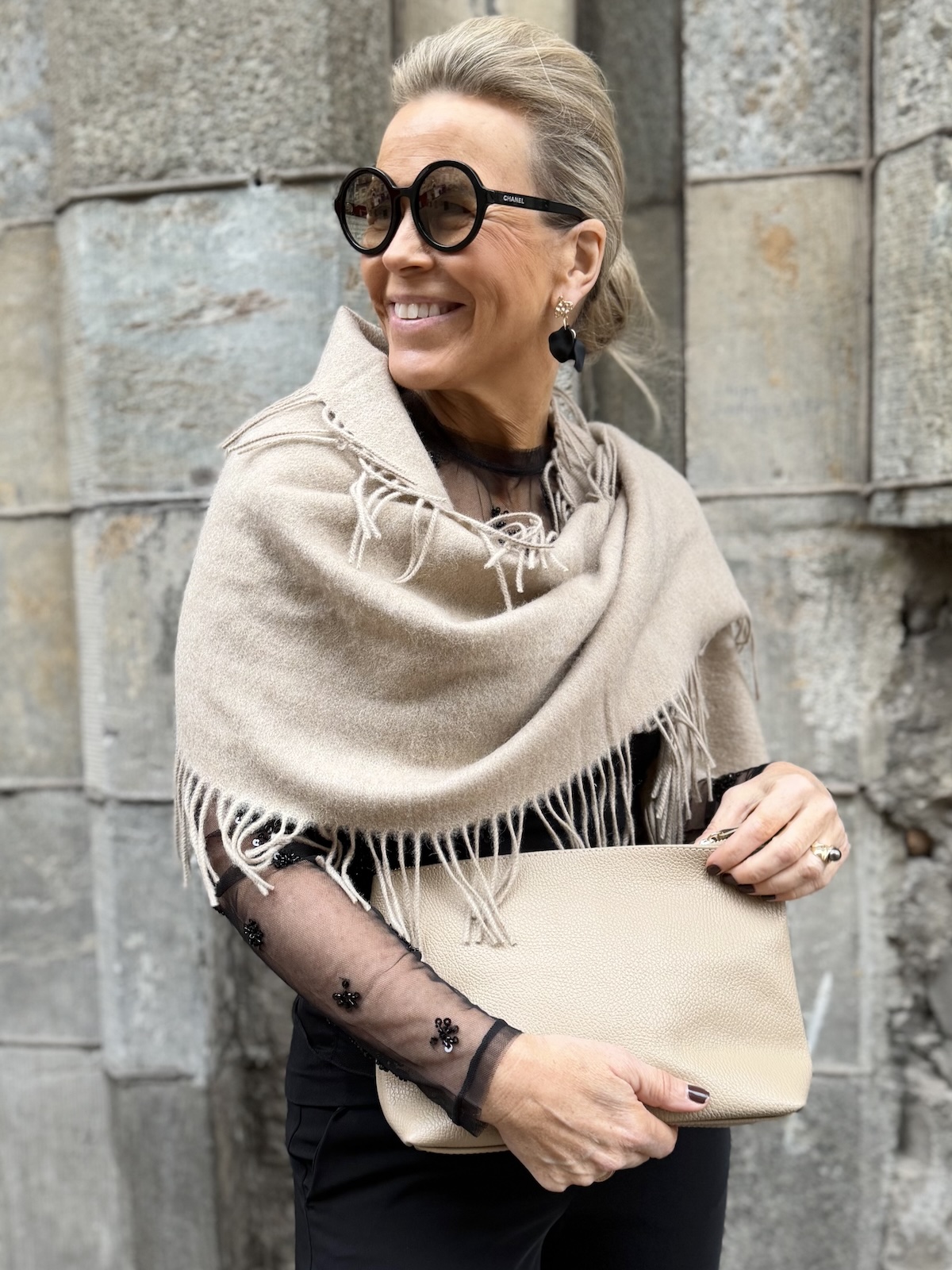 Virinisa on hauska villahuivi. Se on pitkähkö ja sen kummallakin puolella on hapsut. Huivin pituus on n. 152 cm ja leveys n. 40 cm.