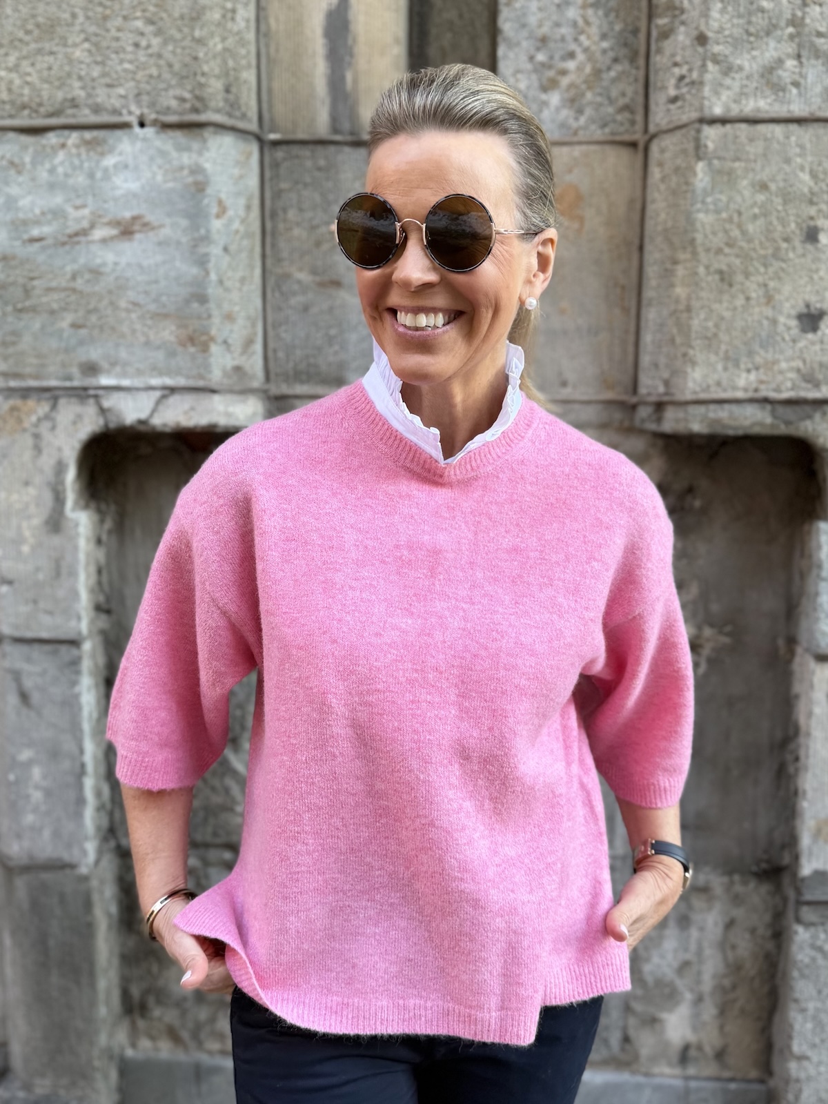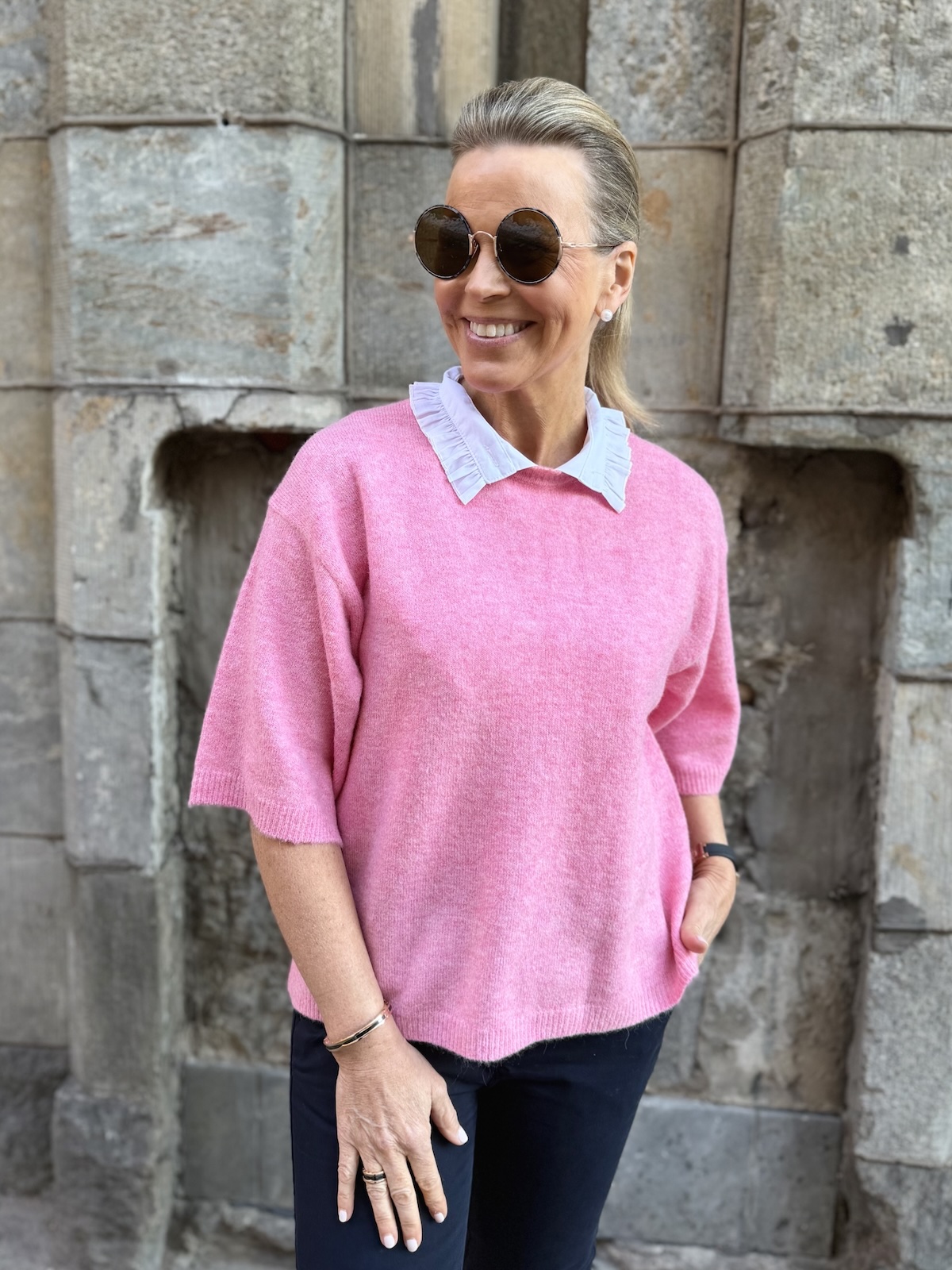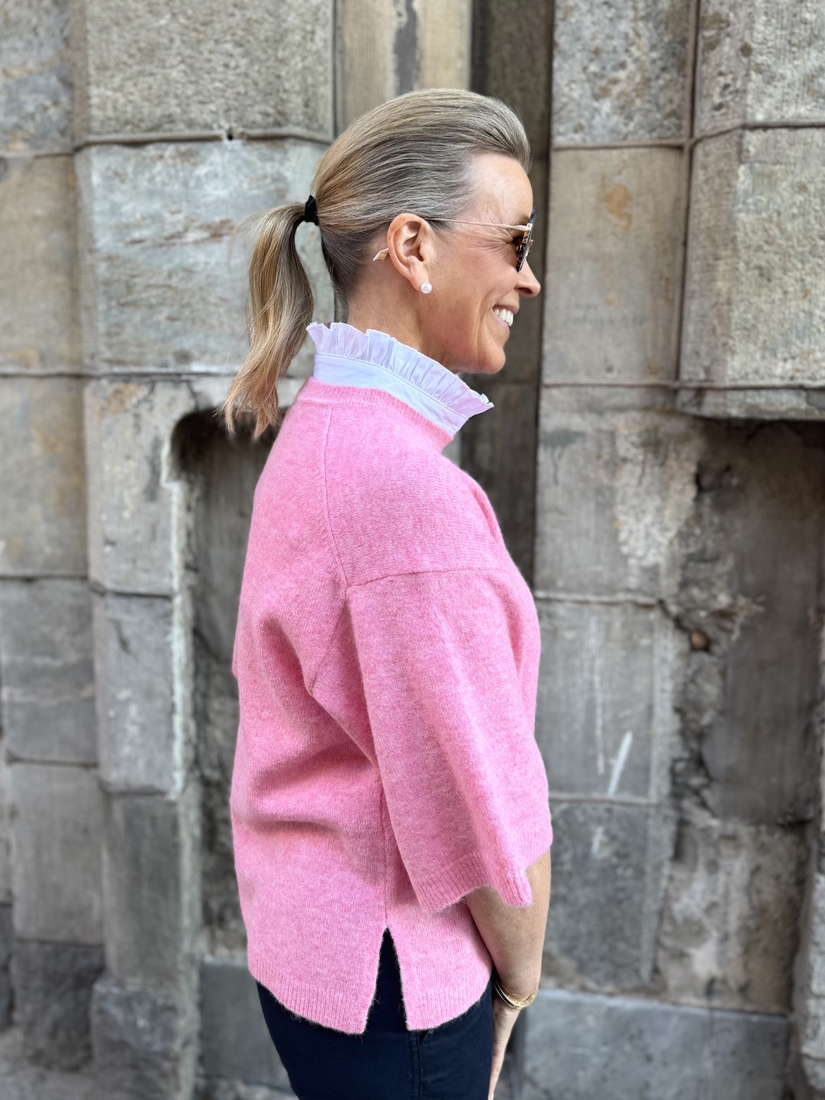 Irtokaulukset ovat loistava keksintö! Irtokauluksia voi pukea minkä asun alle tahansa! Tässä irtokauluksessa on pystykaulus, jonka reunassa on fyrrykantti. Kaulusta voi pitää pystyssä tai sen voi kääntää. Kuminauhoja, jotka ovat kainaloiden alla, voi säätää. Niiden tarkoitus on pitää kaulus paikoillaan eli kaulus ei nouse, kun liikkuu tai touhuaa. Kauluksen reunan voi edestä laittaa rintaliivien sisälle, jos neule on ohuehko ja kauluksen reuna näkyy. Irtokauluksen päälle voi pukea myös topin, tämä myös ehkäisee läpinäkyvyyden, jos päällinen paita on ohut.