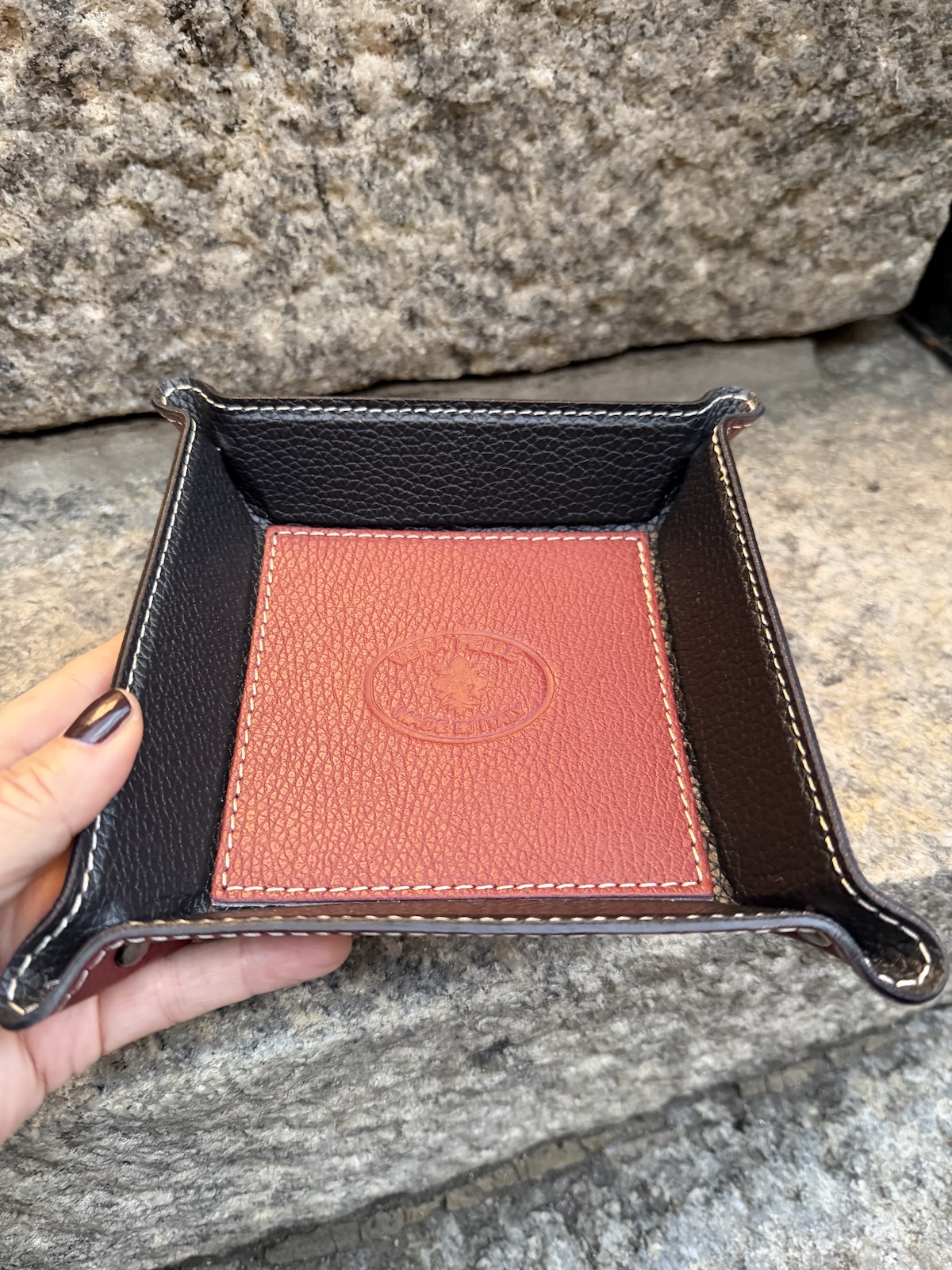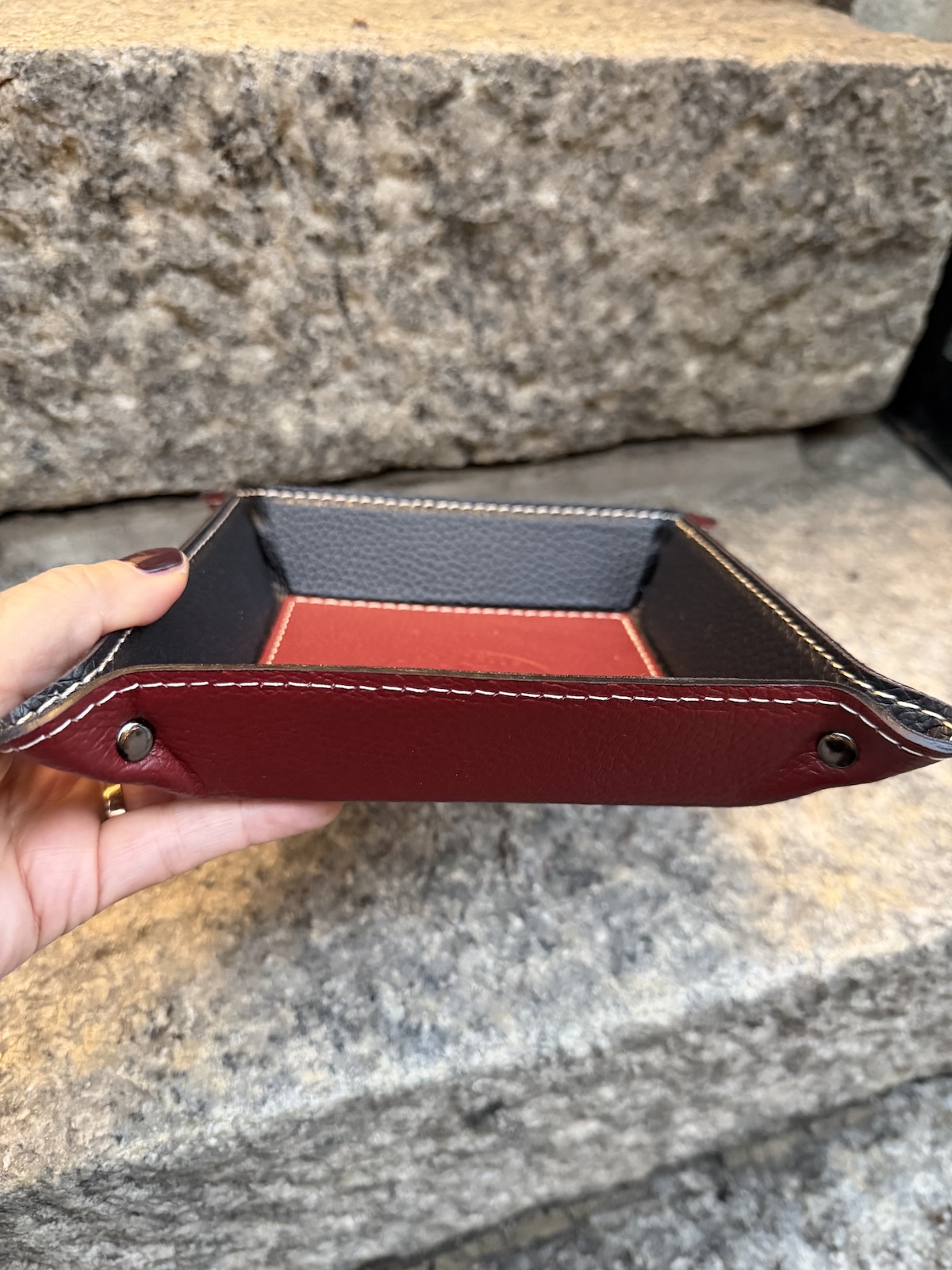 Nahkainen lokerikko on tyylikäs ja kätevä. Se voi olla eteisen pöydällä, yöpöydällä tai missä tahansa pöydällä ja siihen voi laittaa korut, avaimet, kännykän yms. pientä tavaraa kun tulee kotiin. Lokerikon koko on 16 x 16 cm ja reunojen korkeus on 3,5 cm. Lokerikko on tukevaa nahkaa.
