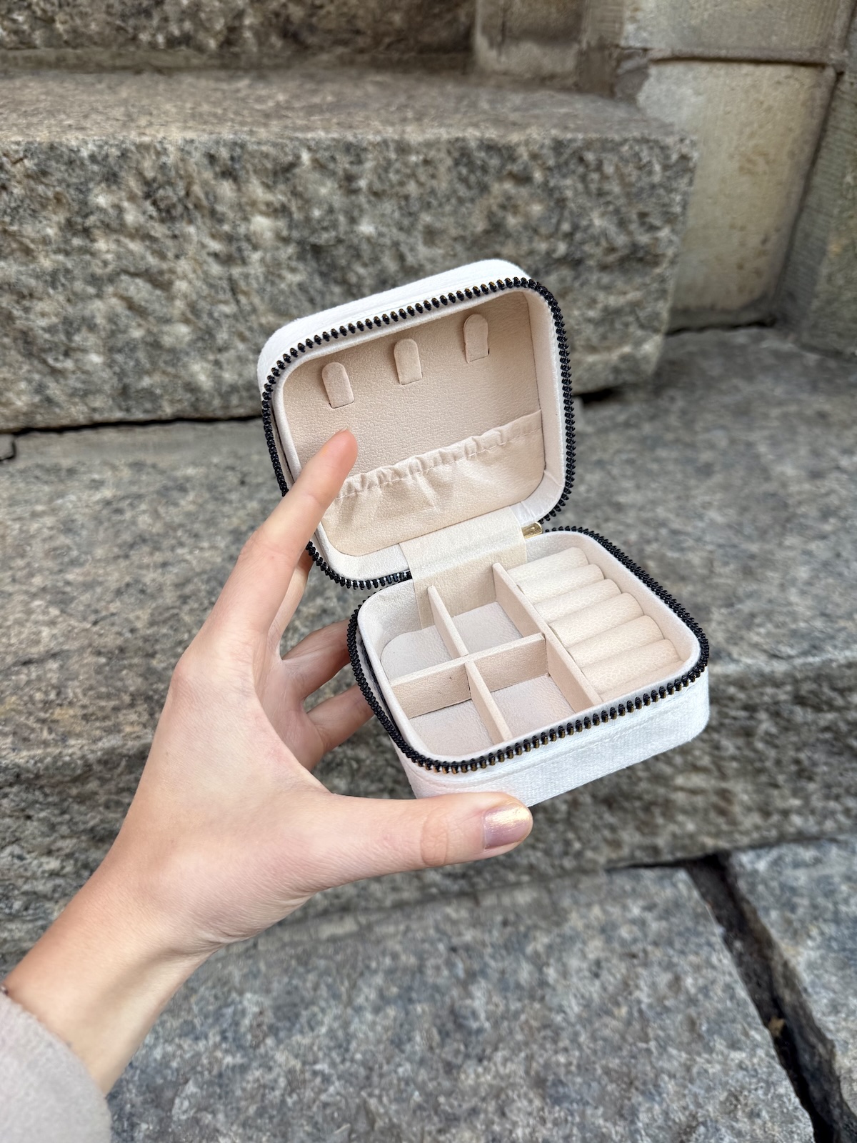 Samettinen korurasia on kaunis ja söpö. Se toimii kotona pöydällä ja se on myös helppo pakata matkalle mukaan. Korut pysyvät järjestyksessä ja tallessa korurasiassa. Rasiaa kiertää vetoketju. Korurasian koko on 10 x 10 cm ja korkeus on 5 cm.