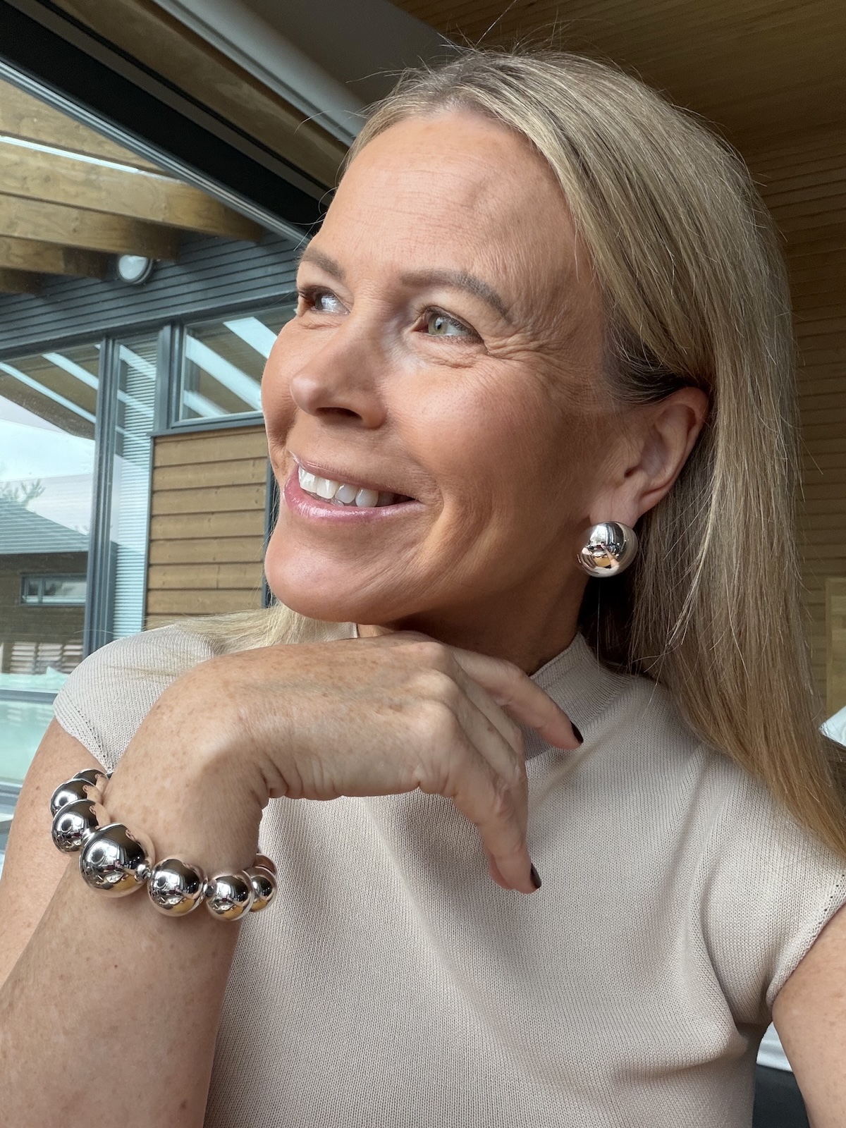 Bead käsikorussa on hopeavärisiä palloja. Käsikorussa on joustava kuminauha eli se on helppo pujottaa ranteeseen. Yhdistä käsikoruun saman sarjan korvakorut.