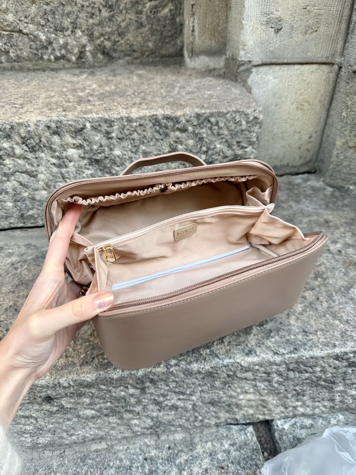 BOW:n meikkilaukku on tilava ja erityisesti siksi hyvä, että se aukeaa kokonaan. Meikkilaukusta on helppo ottaa tavaroita, kun kaikki näkee kerralla. Meikkilaukun sisällä on muutamia taskuja ja keskellä on vetoketjutasku. Vetoketjuja on kaksi (molemmat vedetään keskelle kiinni) ja meikkilaukussa on myös kantokahva. Meikkilaukun koko on 10 x 24 cm.