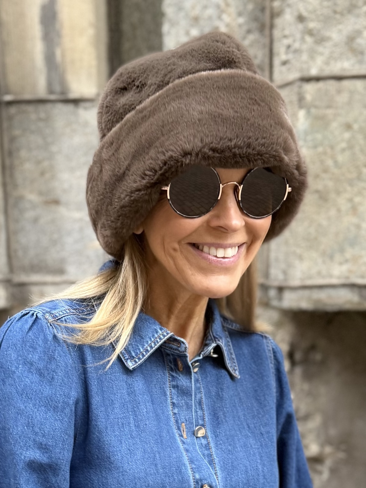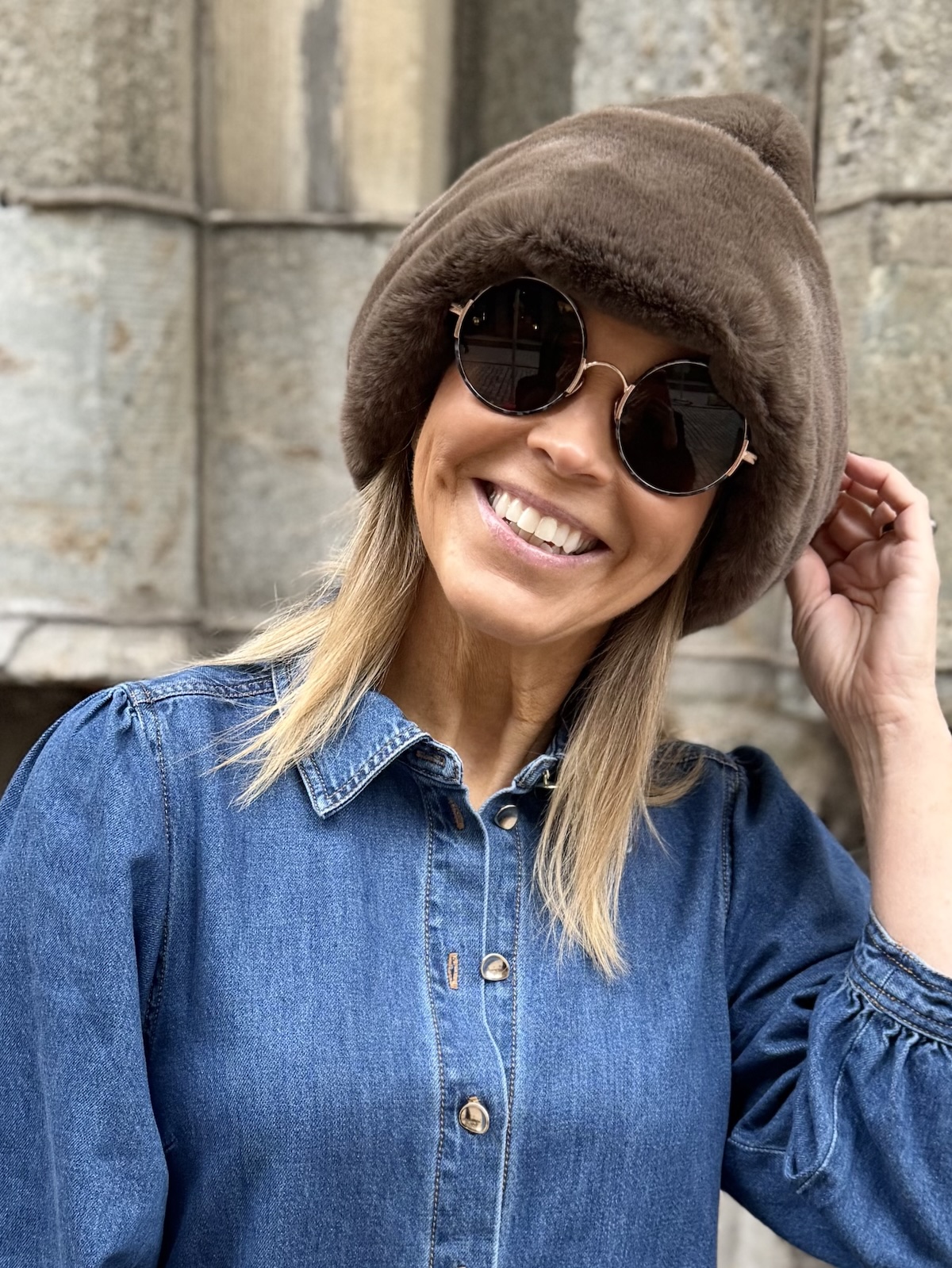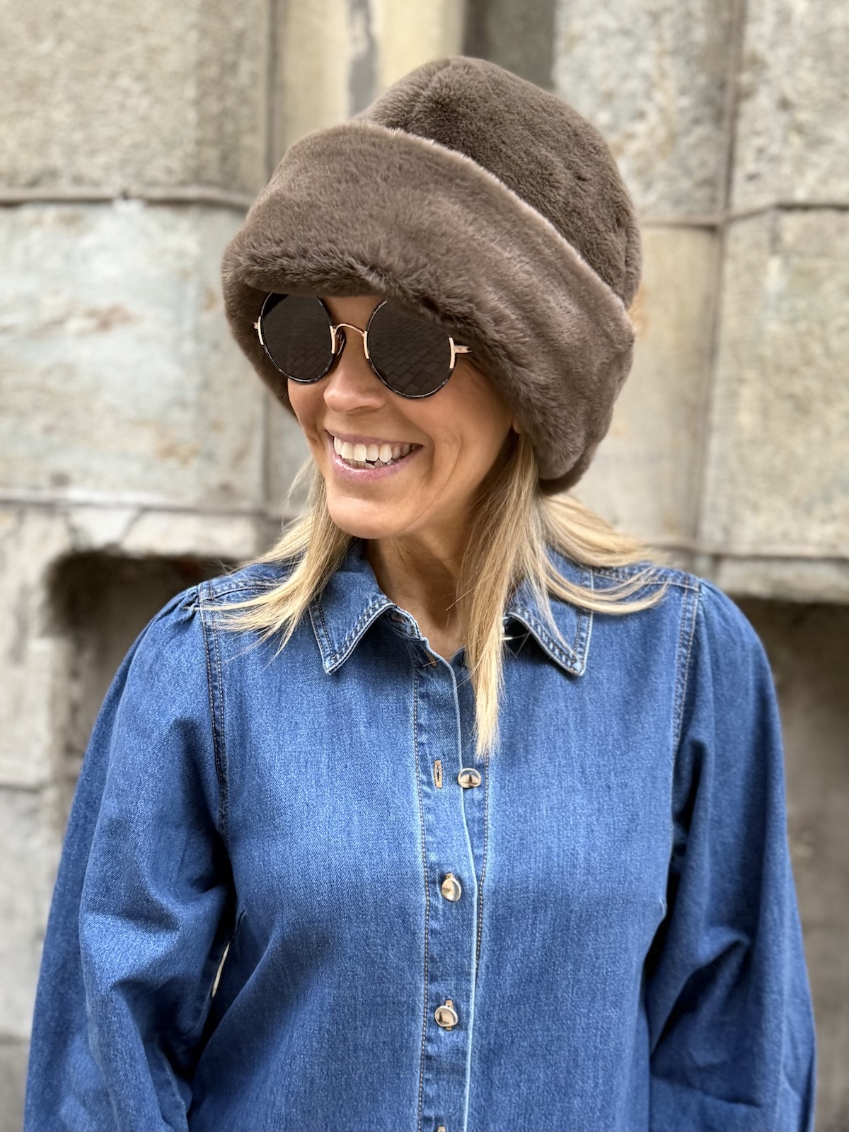 Dayn tekoturkishattu on lyhyttä tekoturkiskarvaa. Hatun reunan saa käännettyä ja hatussa on vuori. Hattua löytyy kaksi kokoa ja Katalla on päässä koko 56.