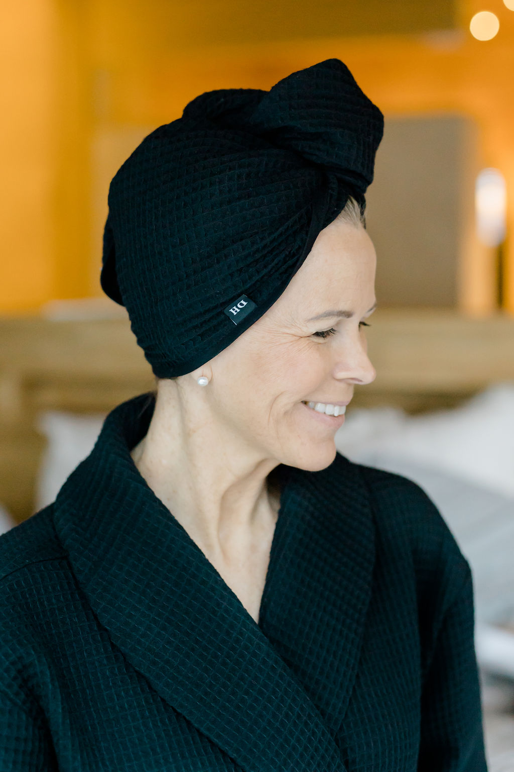 Hiuspyyhe on 100% puuvillaa. Hiusten pesun jälkeen tai saunaan mentäessä on hiuspyyhe helppo laittaa päähän. Hiuspyyhe imee ylimääräiset vedet pois hiuksista ja saunassa pyyhe suojaa hiuksia kuumuudelta.