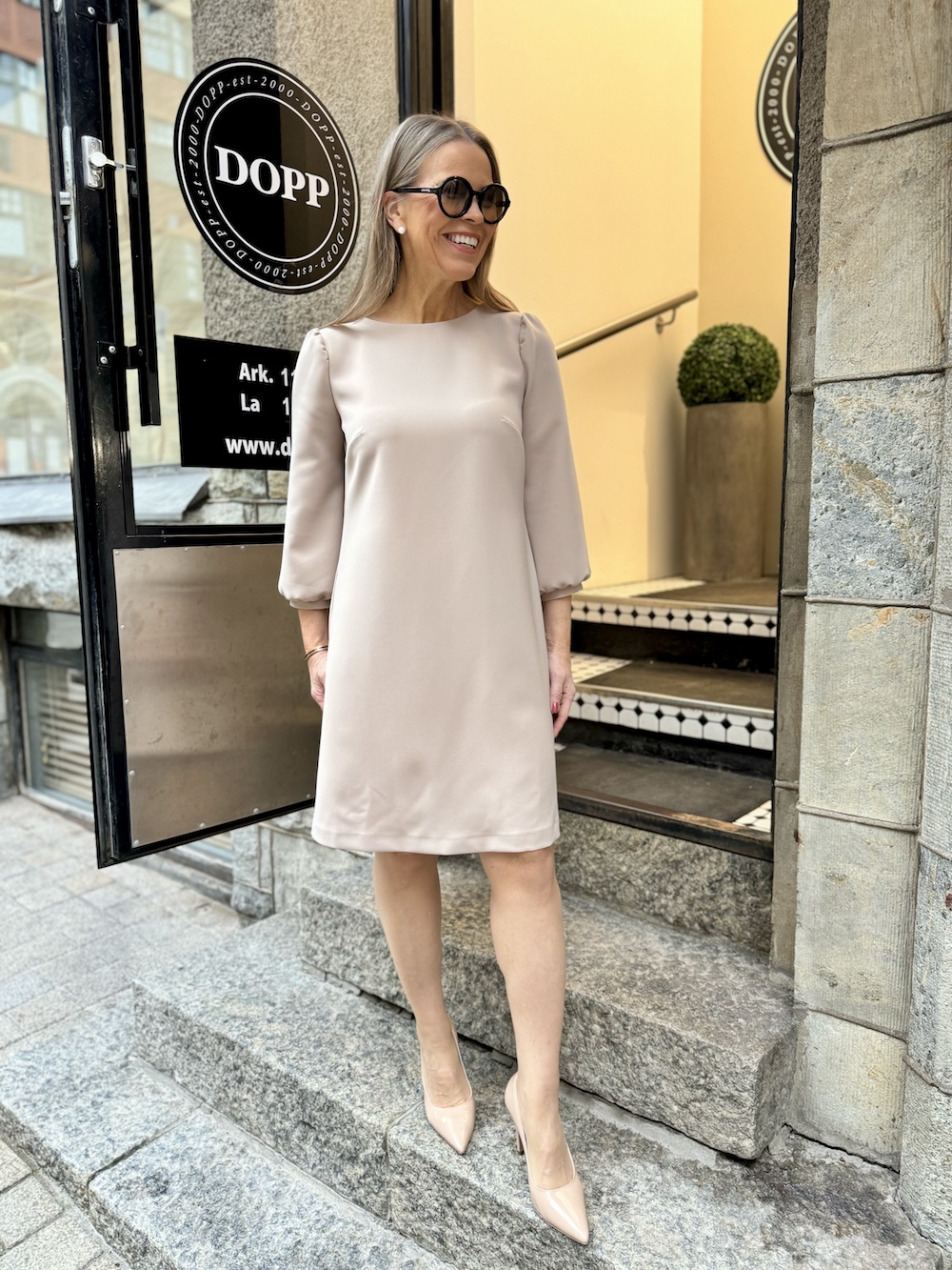 Doppwoman Olivia mekko on suosittu mekkomalli ja se kuuluu DW juhlamallistoomme. Mekossa on O-kaula-aukko ja vajaamittaiset, hieman pussimaiset hihat. Hihasuissa on pieni kantti. Mekko on istuva rinnan kohdalta ja linjakas vyötärön kohdalta, jonka jälkeen se levenee kevyesti alaspäin. Vartalo saa mekossa kauniin linja. Mekon selkäosassa on pitkä vetketju eli mekko puetaan alakautta päälle. Katalla on mekosta päällä koko S. Mekko vastaa normaalia kokoa.