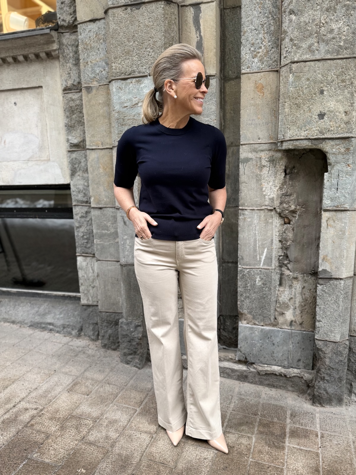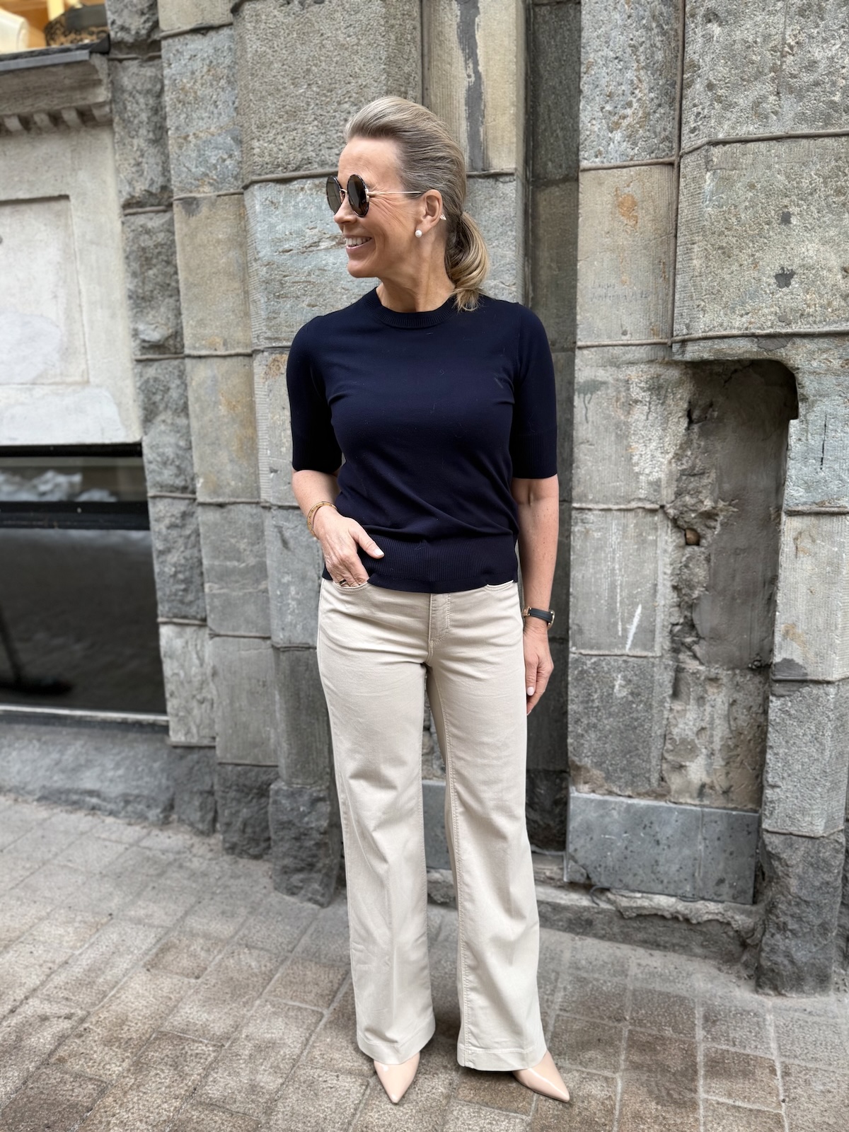 Dream Wide farkut ovat tyylikkäät arkifarkut myös työkäyttöön! Dream Wide farkuissa on ohuehko ja joustava materiaali. Materiaali on ohkaisempaa laatua kuin normaali farkkukangas. Vyötärö nousee navan 1-2 cm navan yläpuolelle ja farkut ovat istuvat lantion kohdalta. Lahkeet ovat suorat ja leveähköt, jo ylhäältä reisistä saakka. Katalla on farkuista päällä koko 34/32″ korkokenkien kanssa. Tennareilla hänelle riittää pituus 30″. Farkuissa on konjakin väriset tikkaukset.
