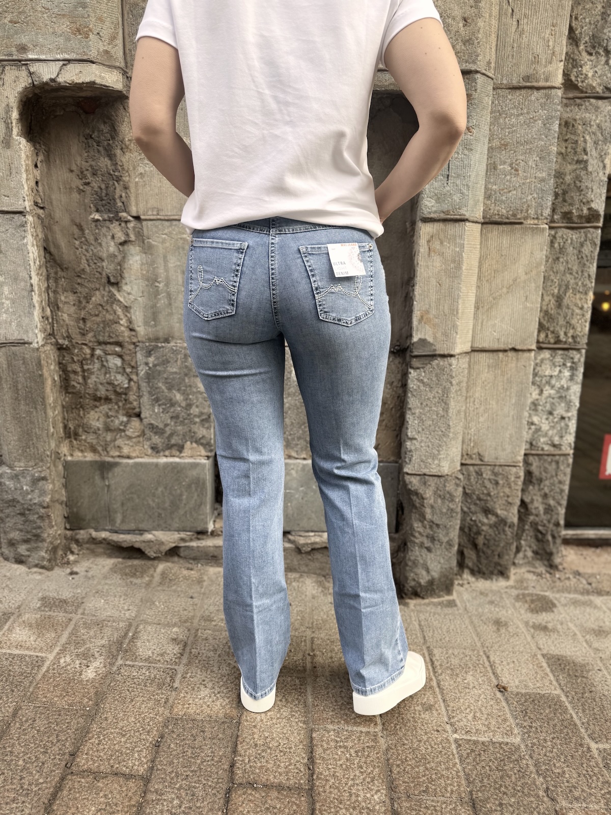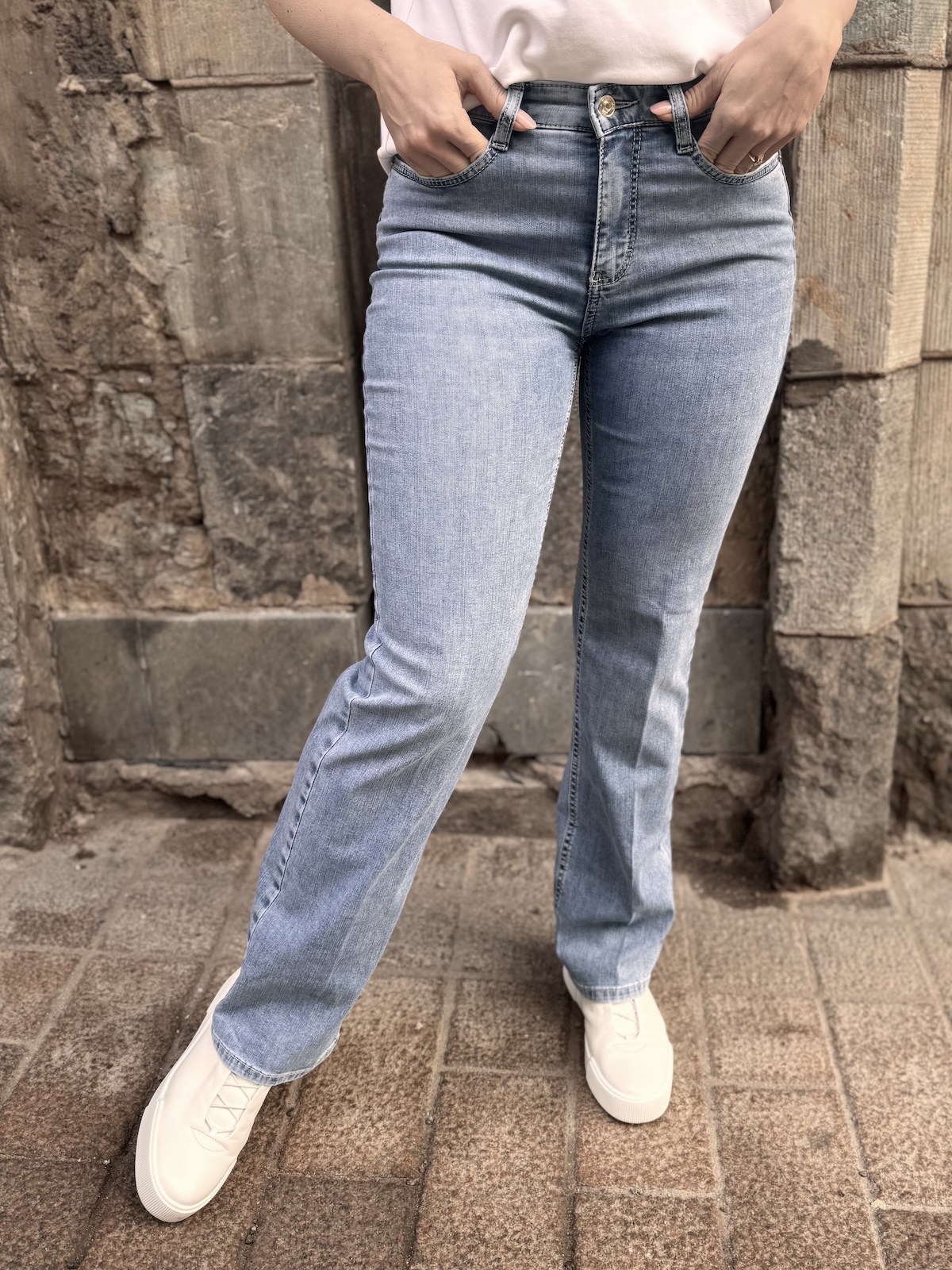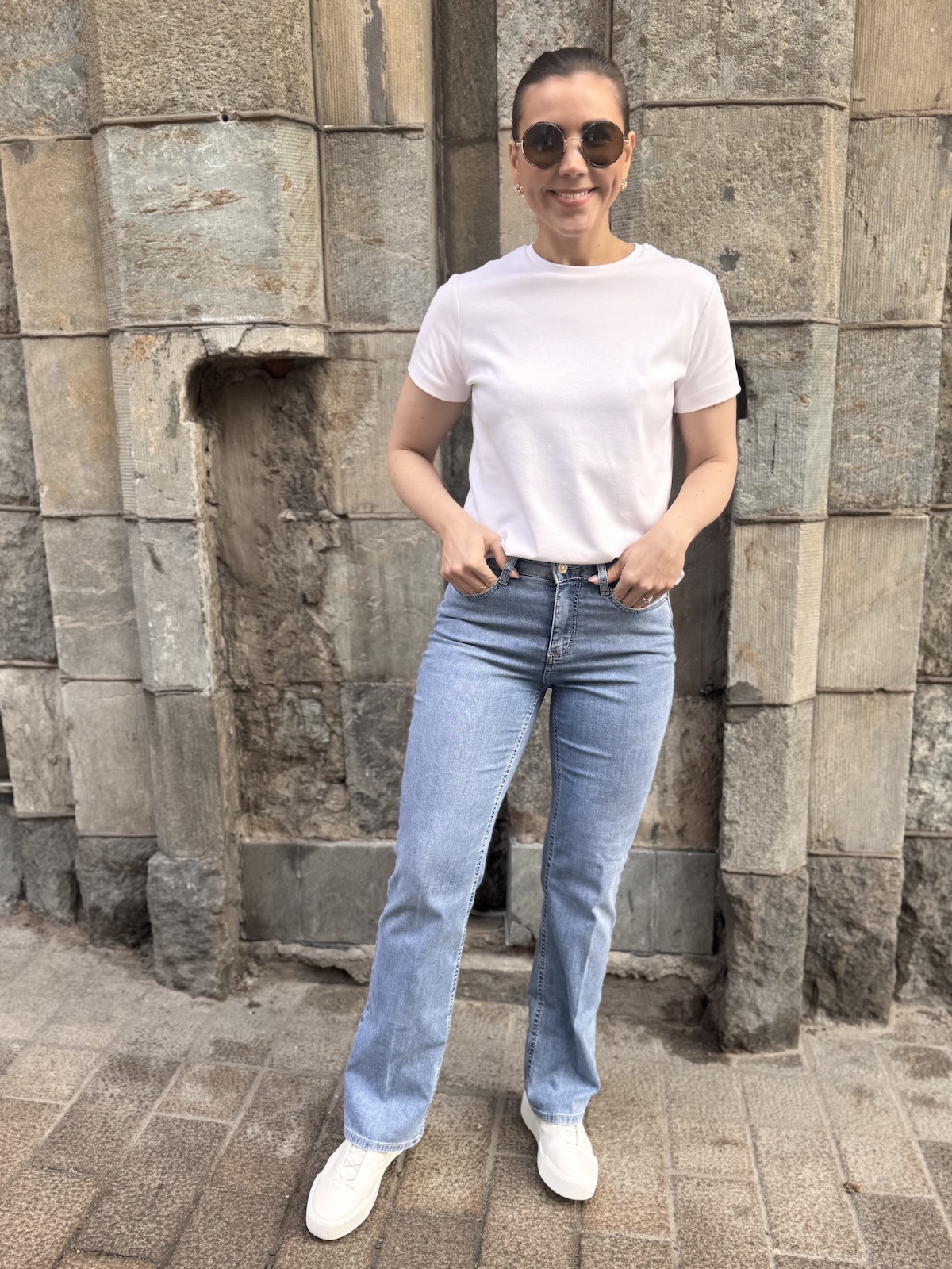 Laura farkut ovat hieman ohkaisempaa farkkua ja ihanan joustavat ja notkeat päällä. Farkkujen vyötärö ylettyy navan päälle. Farkut ovat istuvat ylhäältä, lantiosta ja reisistä. Lahje levenee kevyesti alaspäin. Pepputaskut ovat hyvällä kohdalla. Gabilla on farkuista päällä koko 36/32″. Laura farkuista ei ole valmistettu 34″ pituutta. Kata käyttää Laura farkuista kokoa 34/30″. Gabi on 170 cm pitkä.