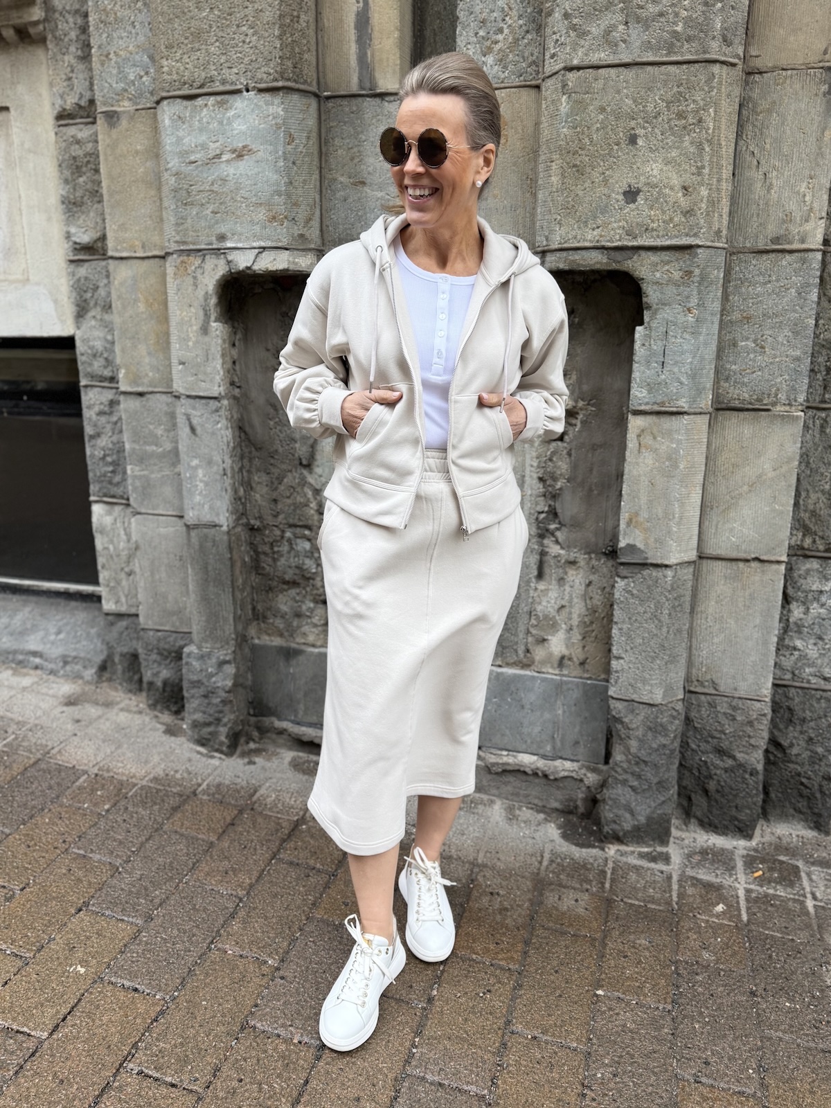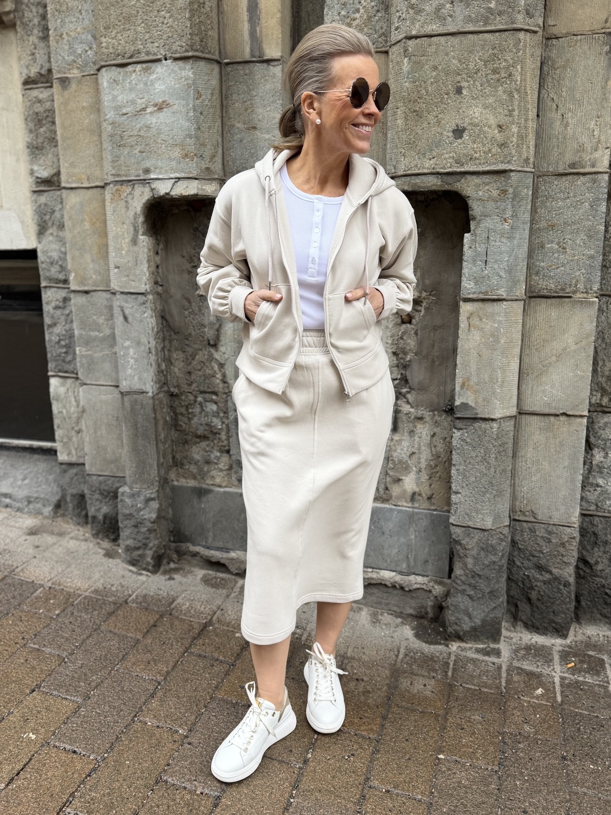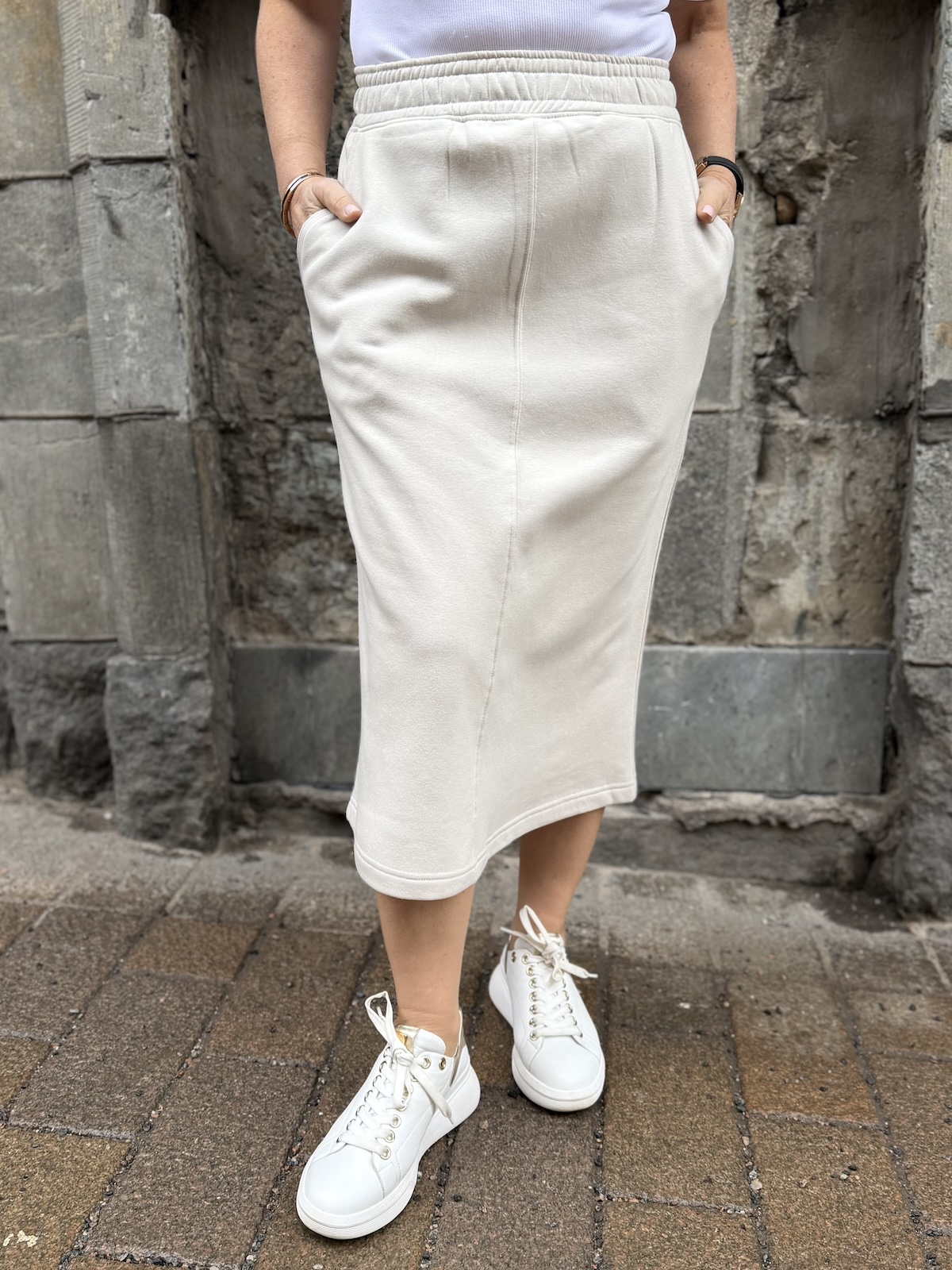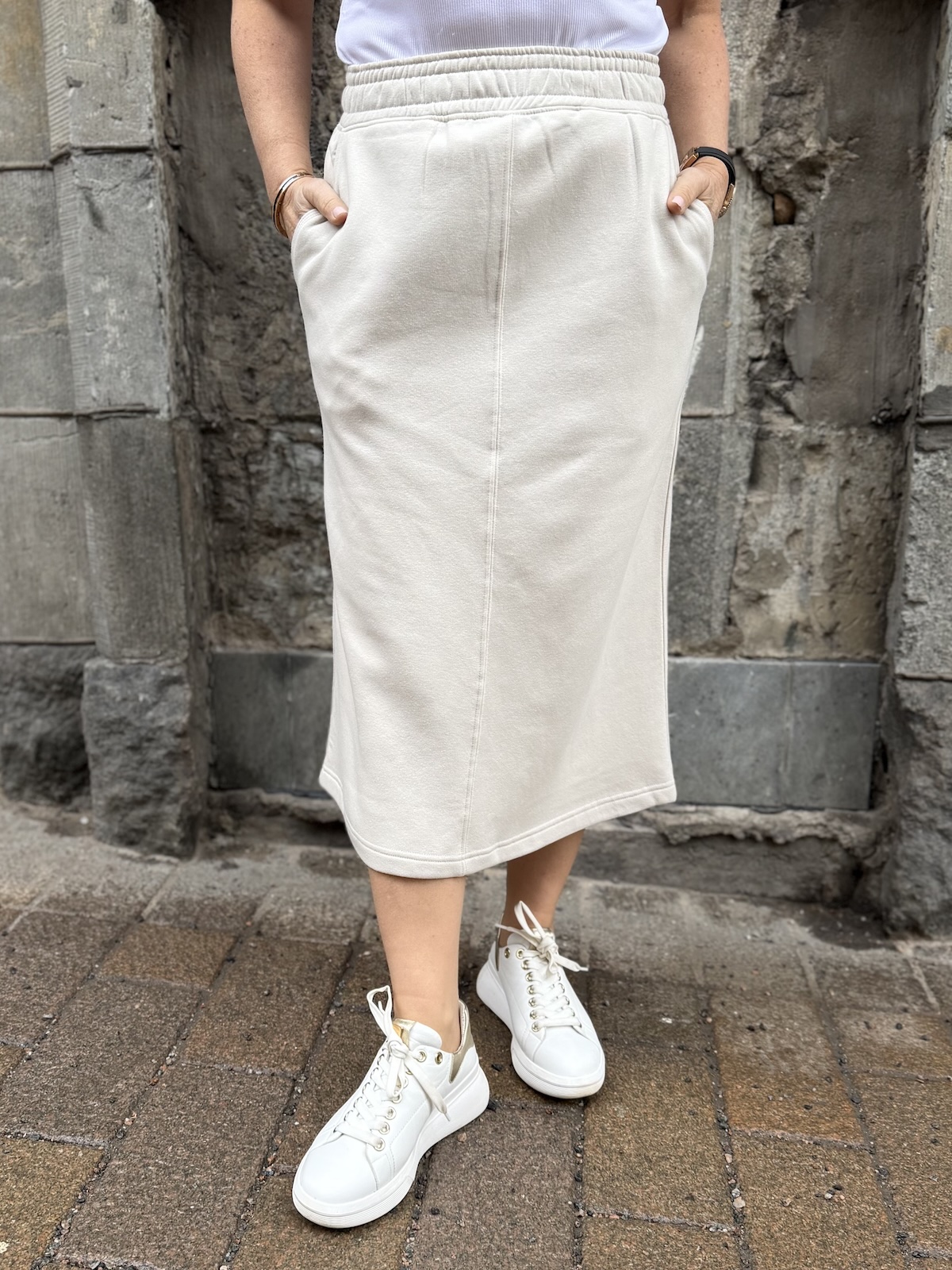 Alfine collegehame on rento, käyttöhame. Vyötäröllä on leveä kuminauha vyötärö ja hameen sivuissa on taskut. Hame on suorahko alas saakka ja se loppuu pohkeiden alapuolelle. Takana on halkio. Katalla on hameesta päällä koko S. Vyötärö venyy alla olevaan mittaan noin 5 cm.