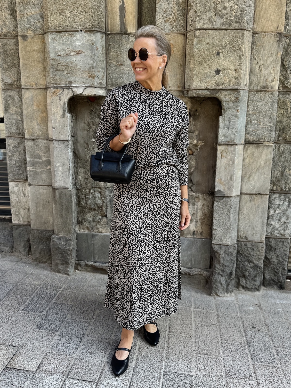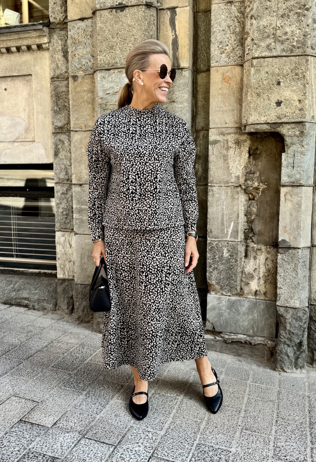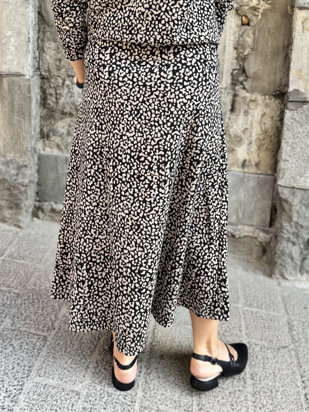 Bopha mihihame on joustavaa ja pehmoista materiaalia eli hyvin vastaavaa kuin ”Pumpulia iholle” oleva materiaali on. Hameessa on vyötäröllä leveä kuminauha ja malliltaan hame on alaspäin levenevä ja se loppuu lähelle nilkkoja. Minulla on hameesta päällä koko XS.