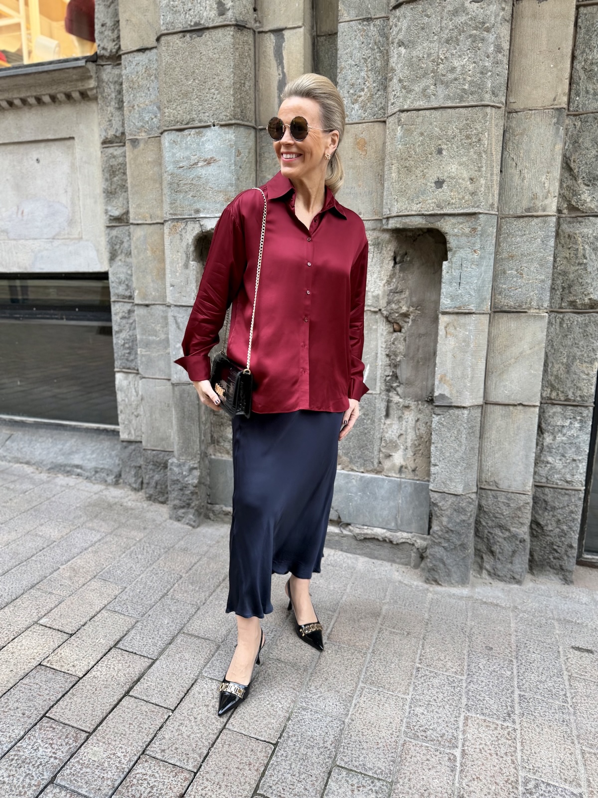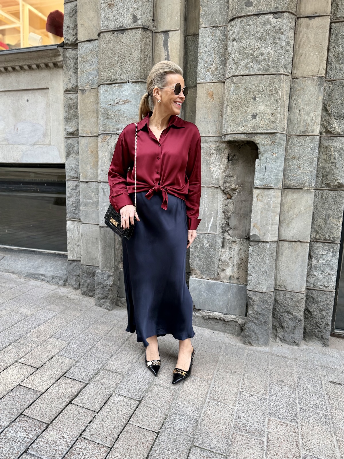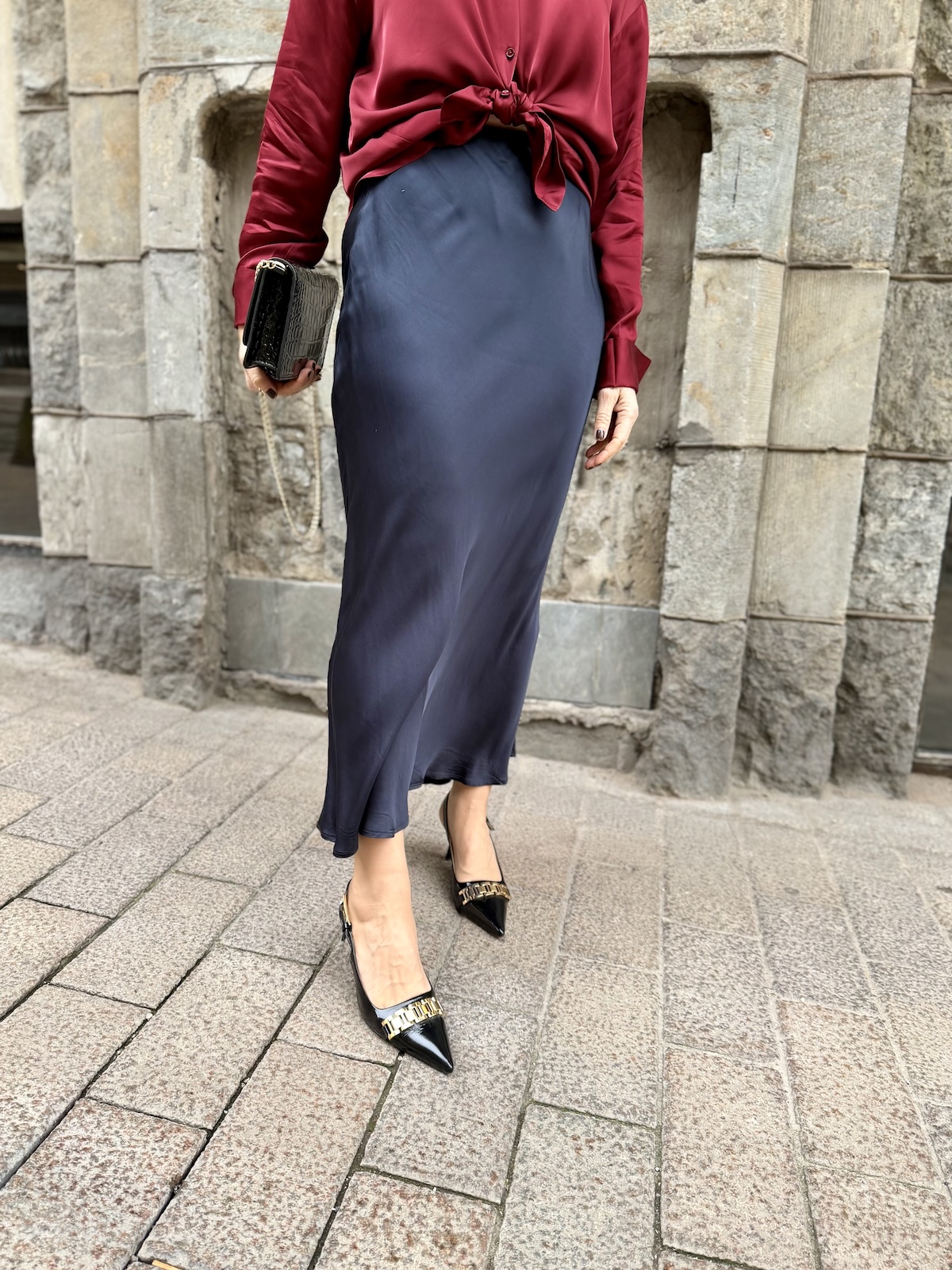 Laurina satiininen midihame; tummansininen