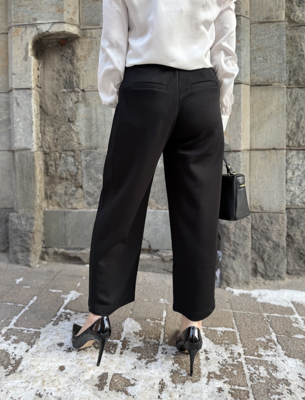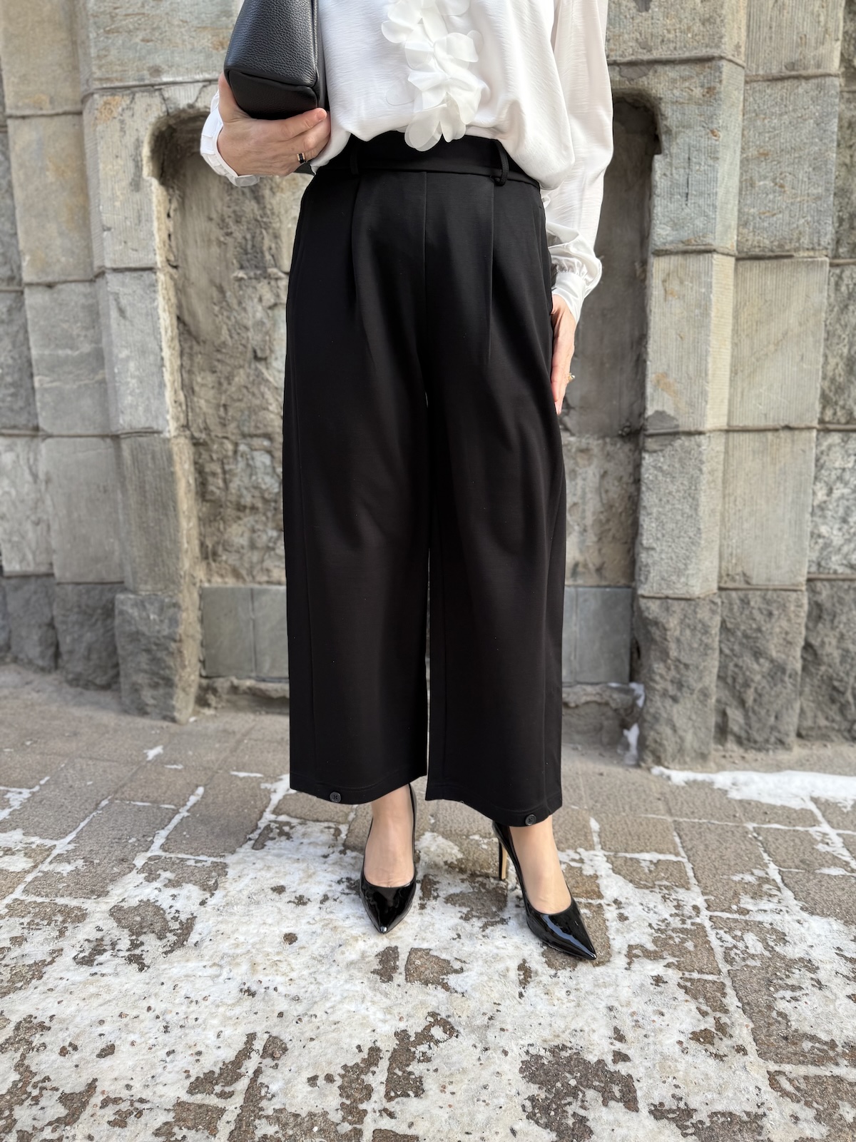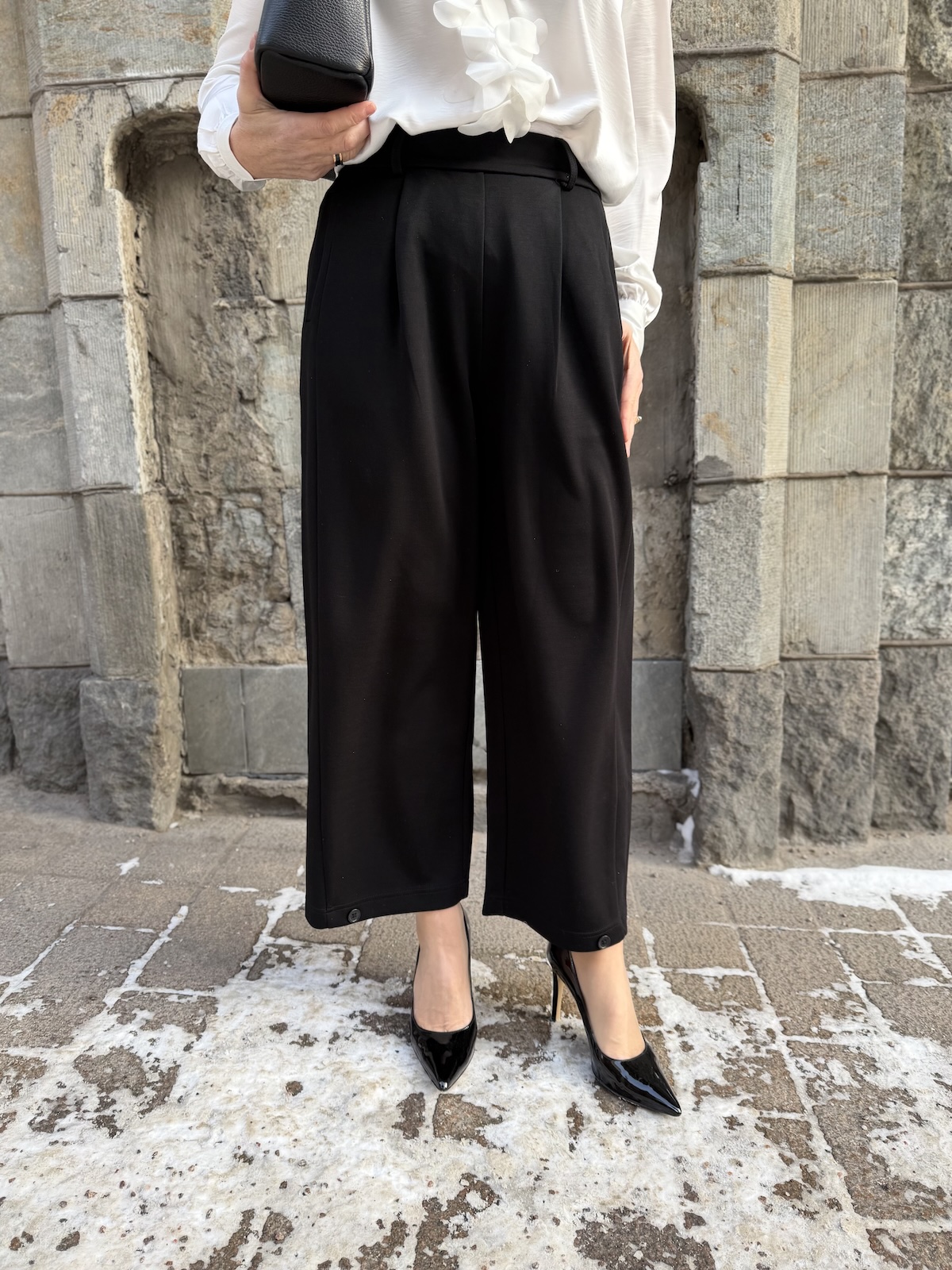 Buka housut ja jakku ovat aivan ihanaa materiaali! Ne joustavat ja tuntuvat ihanilta päällä. Housujen vyötärö tulee vyötärön kapeimmalle kohtaa. Housuissa on kuminauha vyötärö, joka on edestä ihan suora ja rypytys on selkäpuolella. Edessä on kahdet laskokset, vyölenkit ja sivuissa on taskut. Taskut on ommeltu tehtaalla kiinni, mutta ne voi itse varovasti avata, jos haluaa. Takana on viirutaskut. Lahkeet ovat leveähköt ja suorat ja ne loppuvat noin nilkkaluiden kohdalle. Lahkeissa on yksi nappi eli laittamalla napin kiinni, saa housujen lahkeista kapeammat ja pussimaiset. Katan vasen lahje on napilla kiinni ja oikea on suora. Katalla on housuista päällä koko XS. Housujen lantion kohdalla on reilusti tilaa, vyötärön mitta määrittelee housujen koon. Vyötärö venyy alla olevaan mittaan noin 8-10 cm.