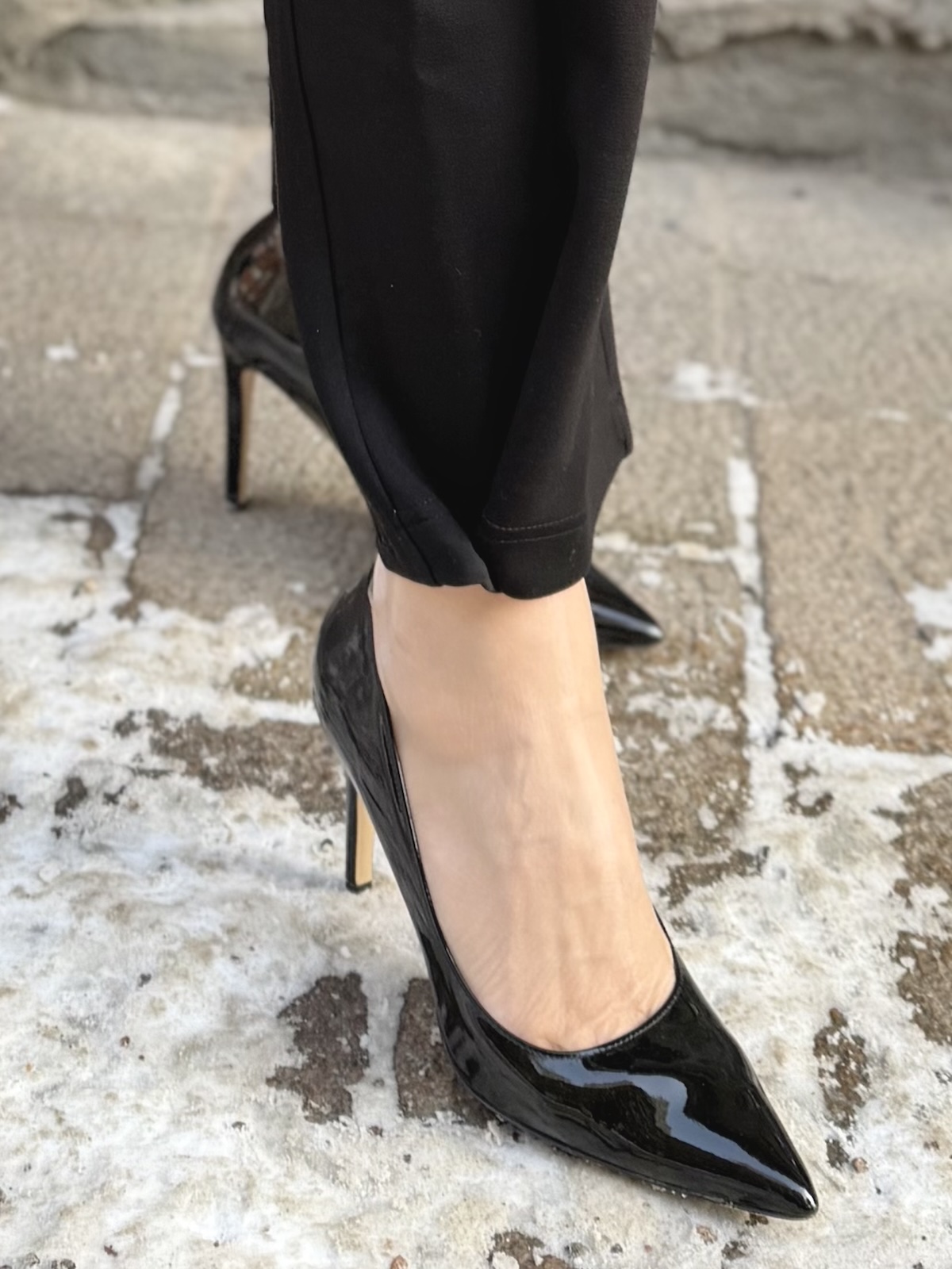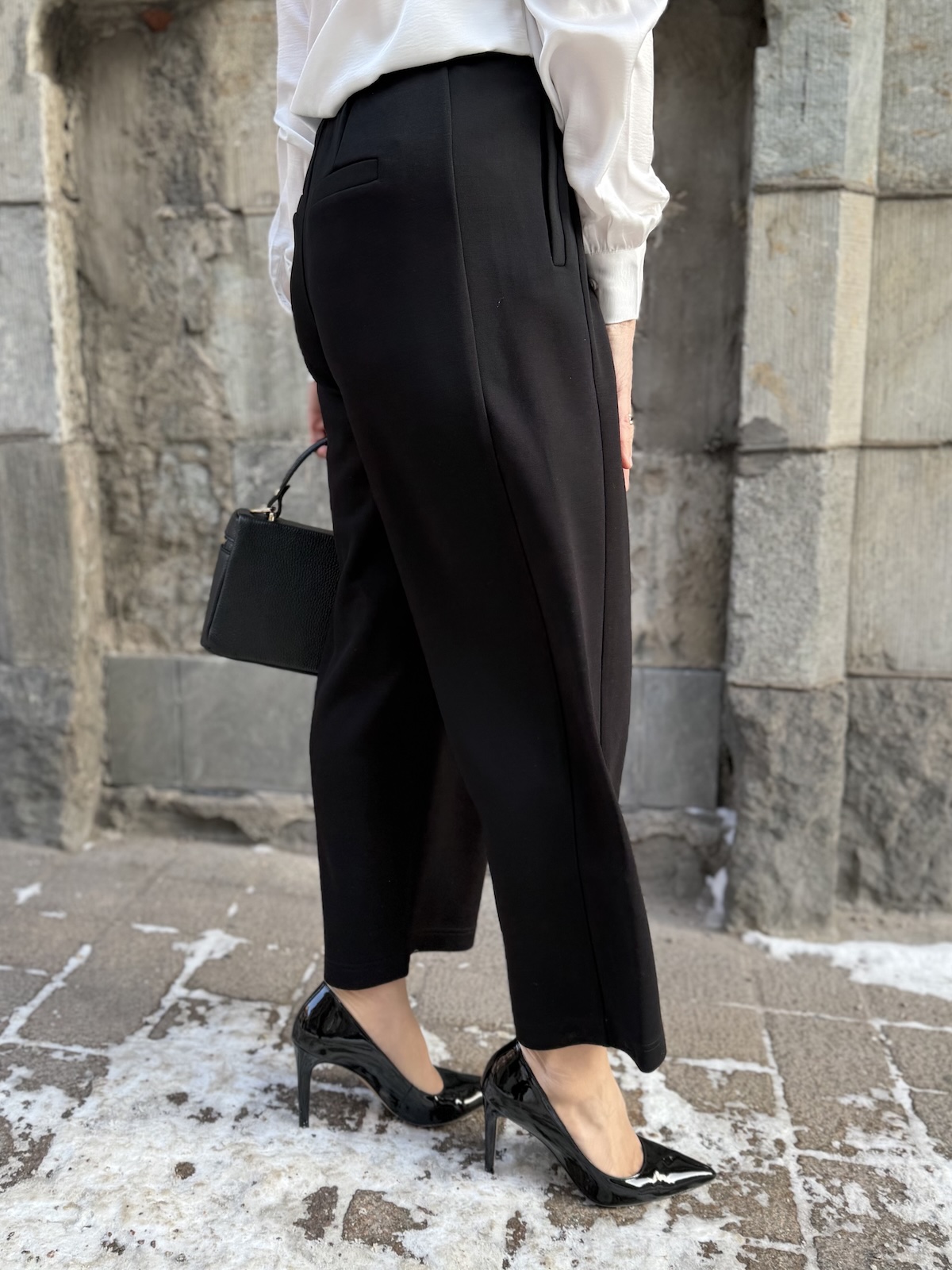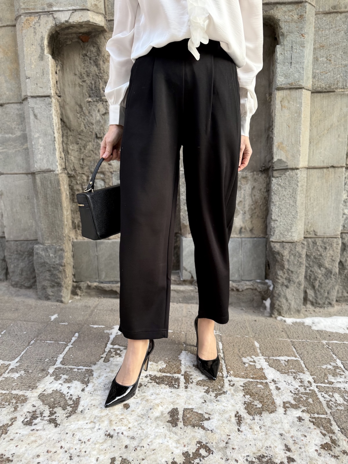 Buka housut ja jakku ovat aivan ihanaa materiaali! Ne joustavat ja tuntuvat ihanilta päällä. Housujen vyötärö tulee vyötärön kapeimmalle kohtaa. Housuissa on kuminauha vyötärö, joka on edestä ihan suora ja rypytys on selkäpuolella. Edessä on kahdet laskokset, vyölenkit ja sivuissa on taskut. Taskut on ommeltu tehtaalla kiinni, mutta ne voi itse varovasti avata, jos haluaa. Takana on viirutaskut. Lahkeet ovat leveähköt ja suorat ja ne loppuvat noin nilkkaluiden kohdalle. Lahkeissa on yksi nappi eli laittamalla napin kiinni, saa housujen lahkeista kapeammat ja pussimaiset. Katan vasen lahje on napilla kiinni ja oikea on suora. Katalla on housuista päällä koko XS. Housujen lantion kohdalla on reilusti tilaa, vyötärön mitta määrittelee housujen koon. Vyötärö venyy alla olevaan mittaan noin 8-10 cm.