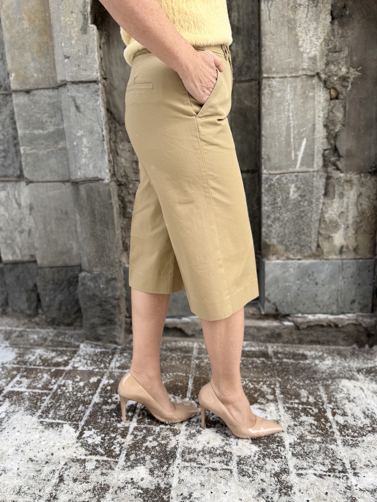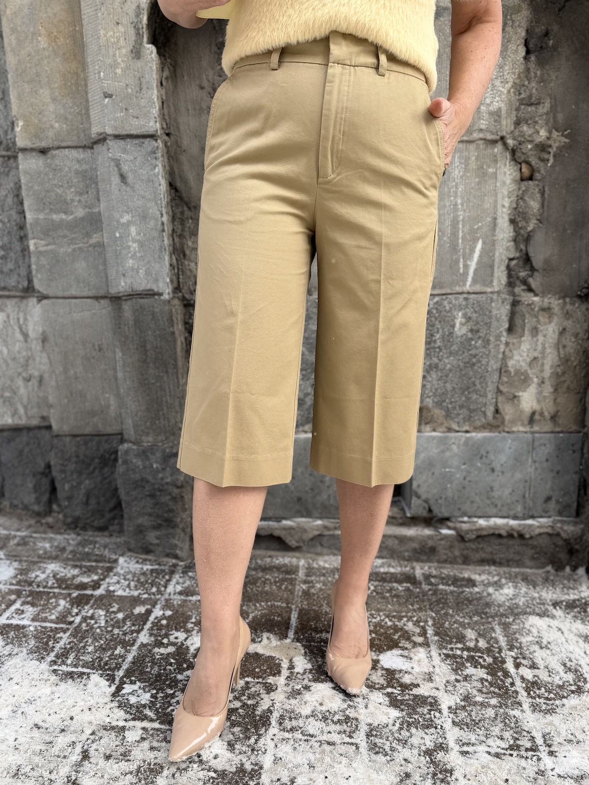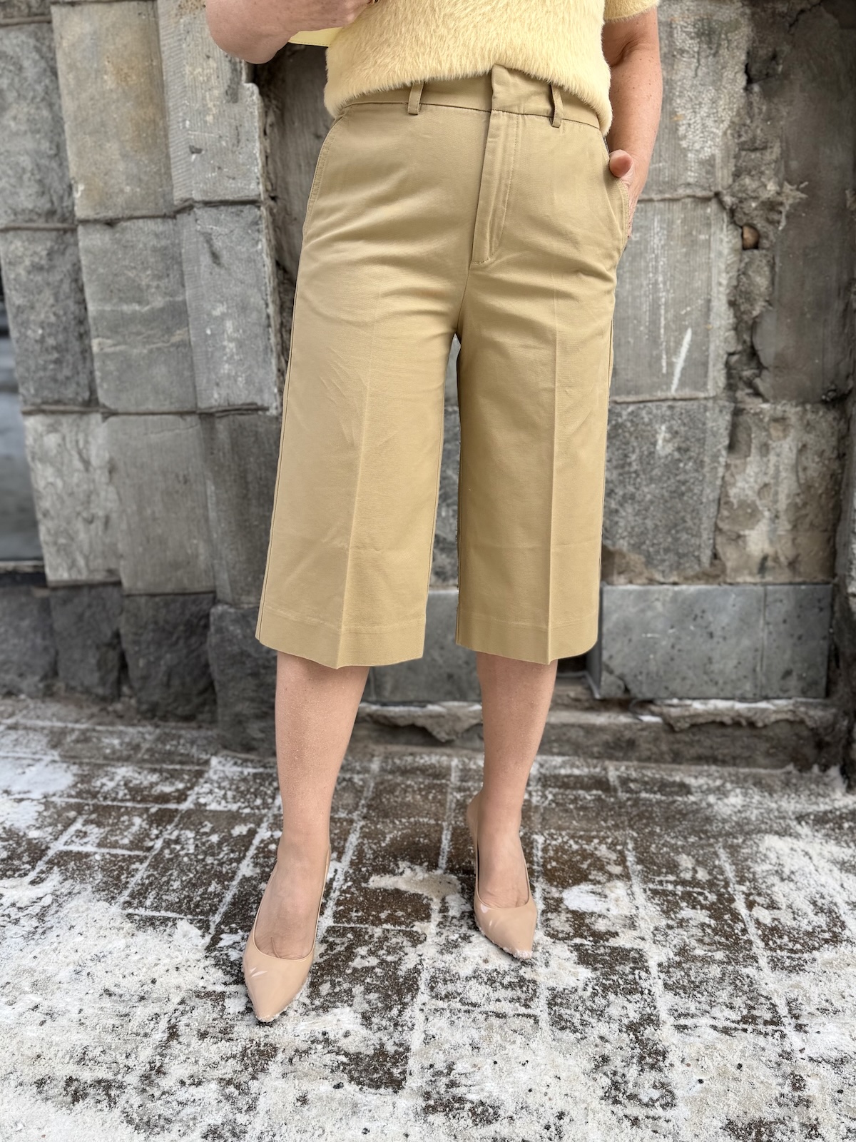 Bermuda shortsit ovat tämän kevään trendivaate. Nämä ovat puuvillaa ja malliltaan rennot. Vyötärö ylettyy navan päälle ja housujen sivuissa on taskut. Housut ovat istuvat ylhäältä lahkeet ovat ihan suorat ja ne ylettyvät polvien alapuolelle. Housujen takana on viirutaskut. Housut istuvat loistavasti, Katalla on päällä koko 34.