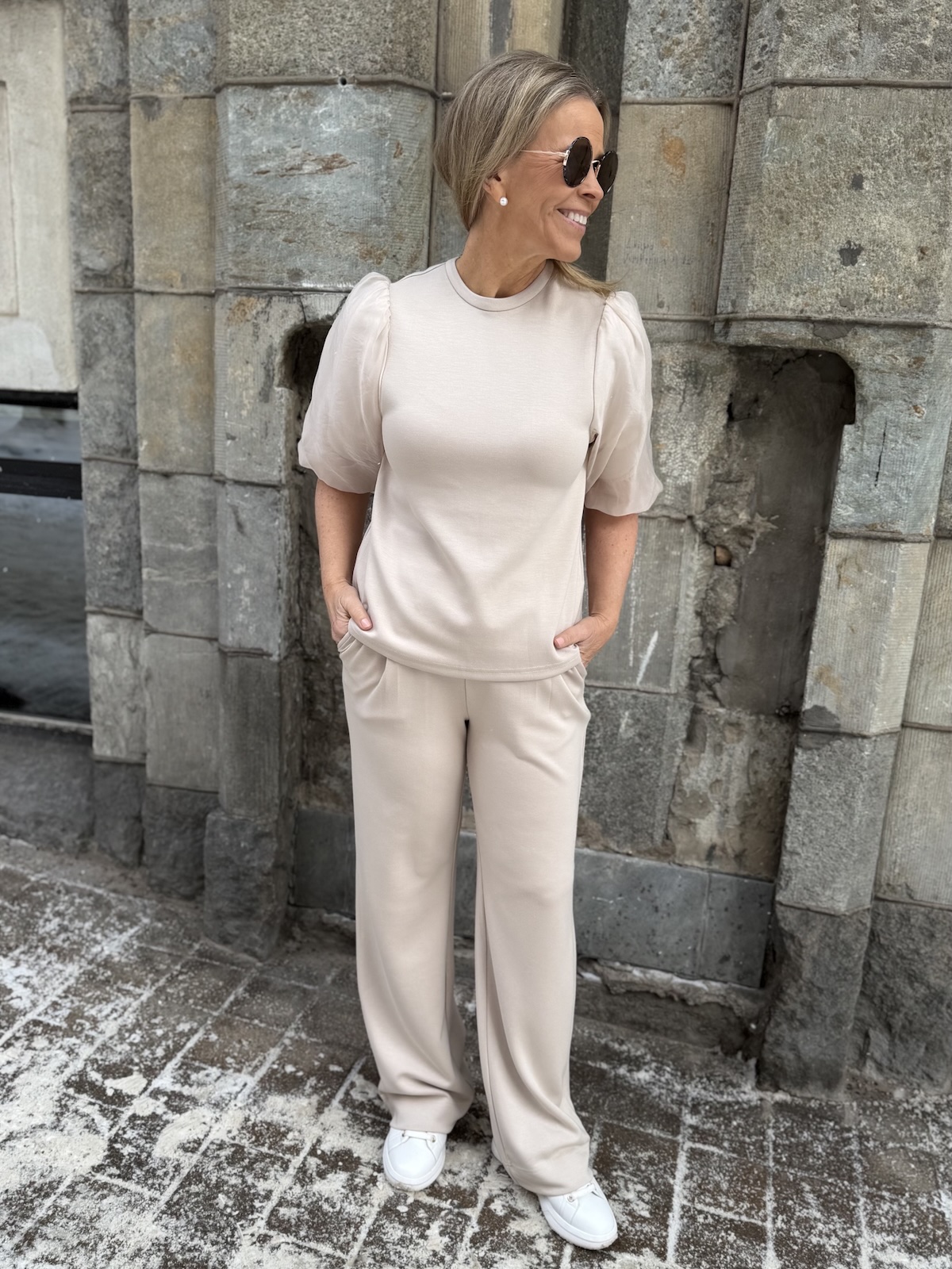 Marigold kuuluu ihanaan ”Pumpulia iholle” olevaan sarjaan. Housuissa on leveä kuminauhavyötärö. Edessä on pari vekkiä ja sivuissa on taskut. Lahkeet ovat ihan suorat ja täyspitkät. Takana ei ole taskuja. Katalla on housuista päällä koko S (mustista housuista minulla on päällä koko XS). Yhdistä housut saman sarjan Marigold paitaan ja saat tyylikkään setin.