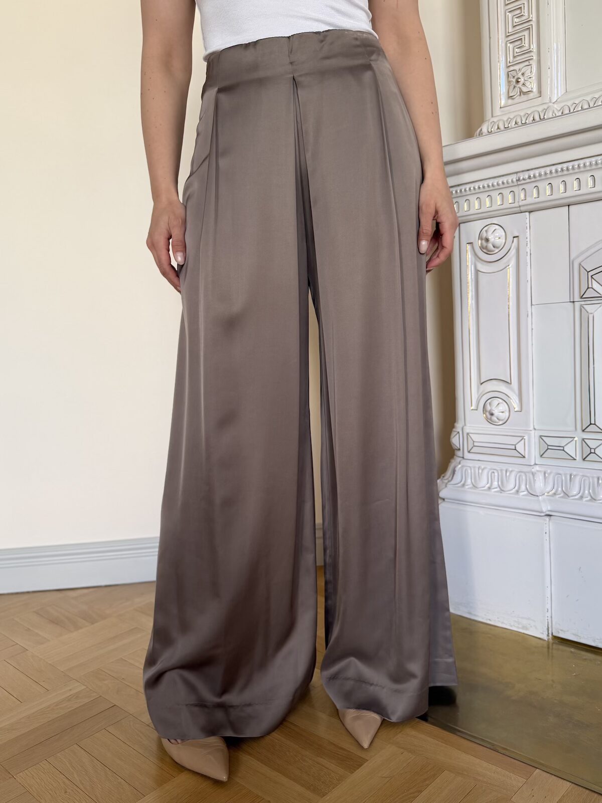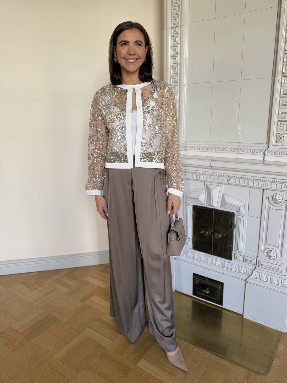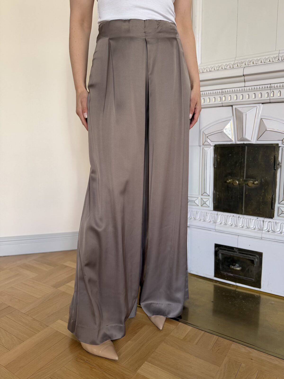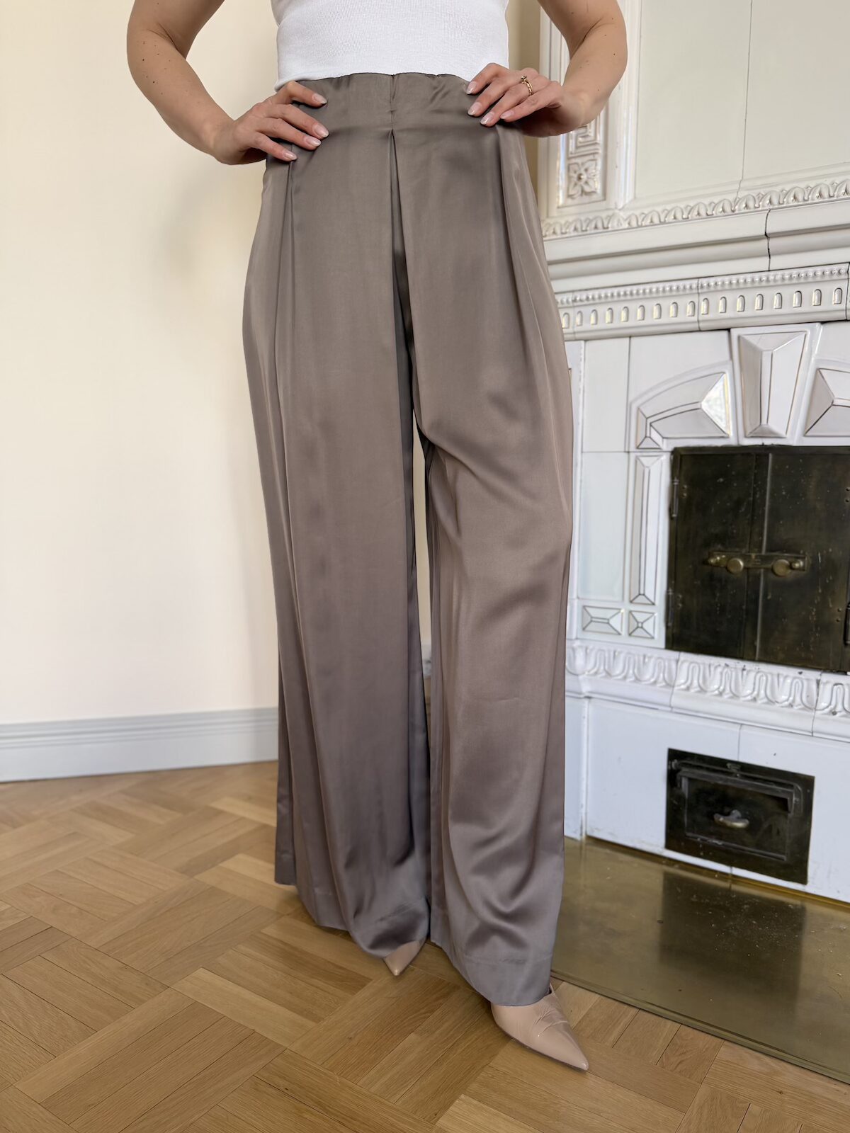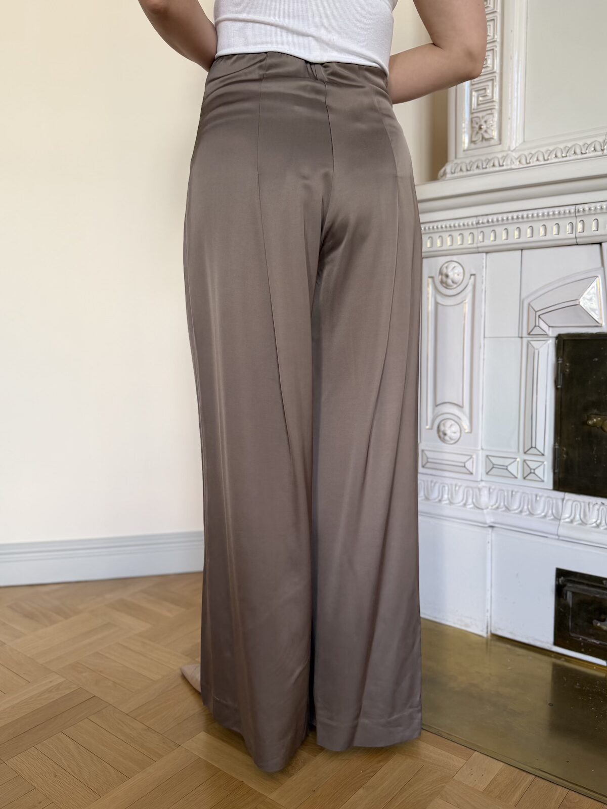 Nämä housut ovat kerrassaan UPEAT! housujen vyötärö ylettyy ylös, vyötärön kapeimaan kohtaan. Vyötärönauha on leveä. Housujen sivussa on vetoketju ja edessä on laskokset jotka antavat leveyttä housujen lahkeille. Lahkeet ovat täyspitkät. Gabilla on housuista päällä koko 36 ja hän on 170 cm pitkä.