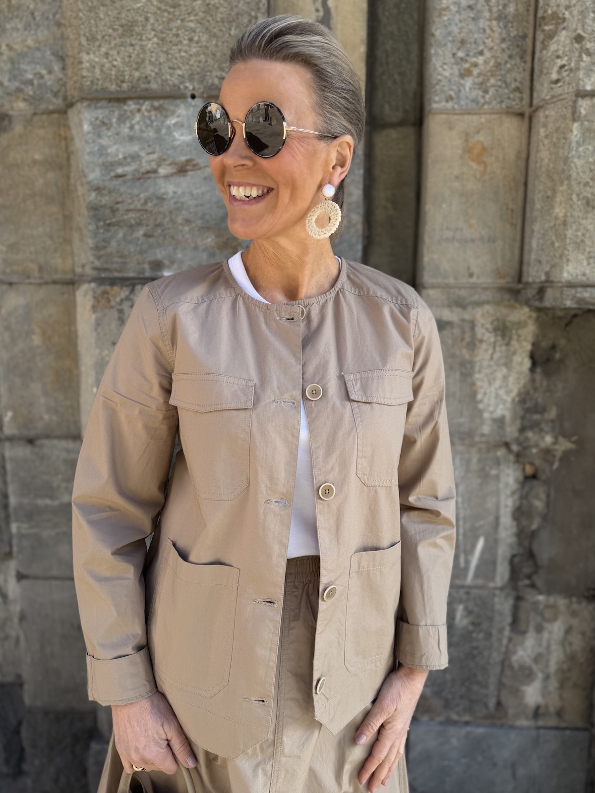 Azira on vuoreton puuvillainen pusakka/jakku. Pusakassa on O-kaula-aukko ja edessä on napit. Hihat ovat täyspitkät ja hihansuissa on kantit ja nappi. Pusakassa on rintataskut, jotka ovat huomaamattomat sekä kaksi paikkataskua. Malliltaan pusakka on suora ja se loppuu lantiolle. Katalla on pusakasta päällä koko 34. Pusakka on yhden koon reilumpaa kokoa kuin normaalisti.