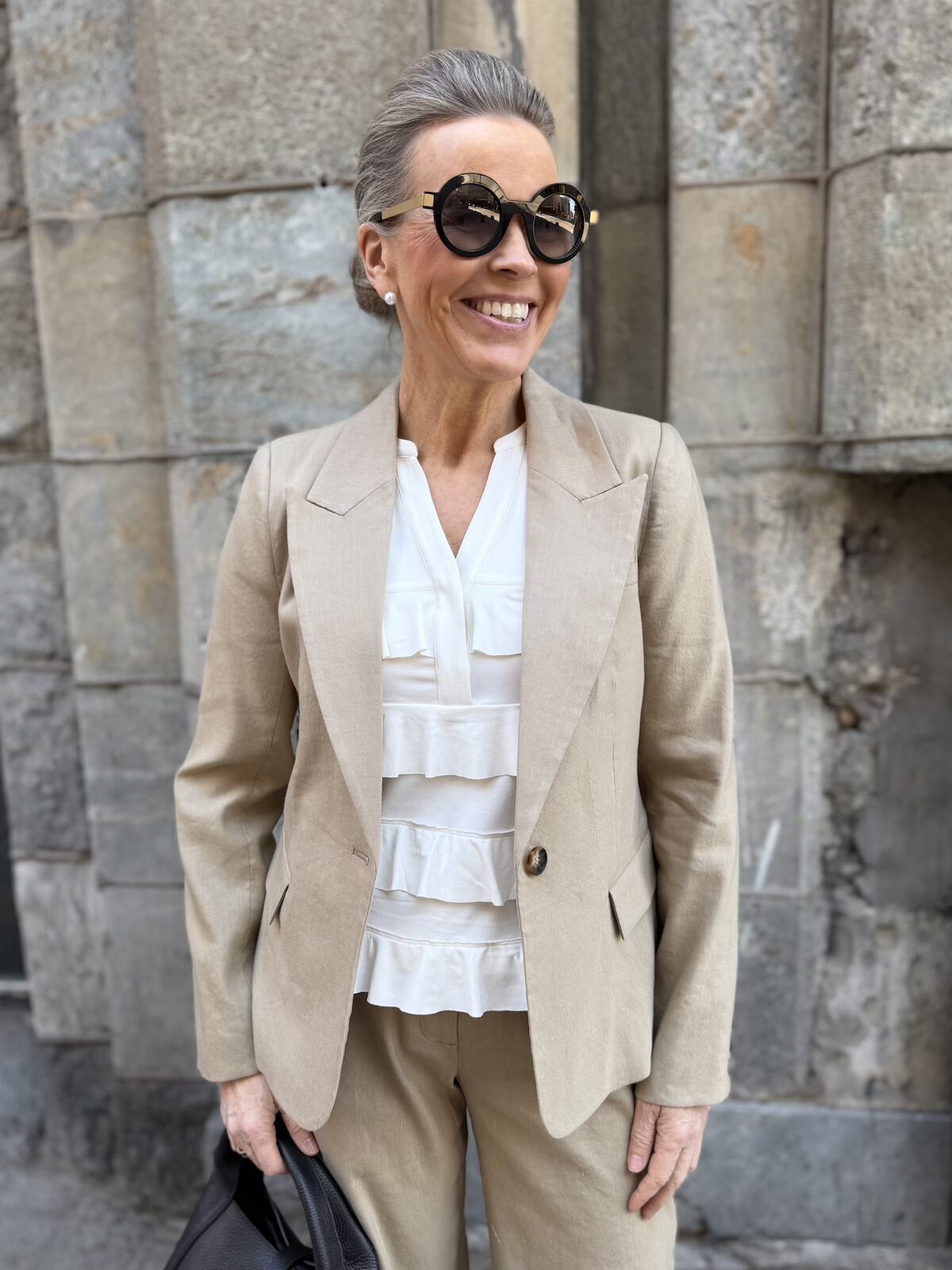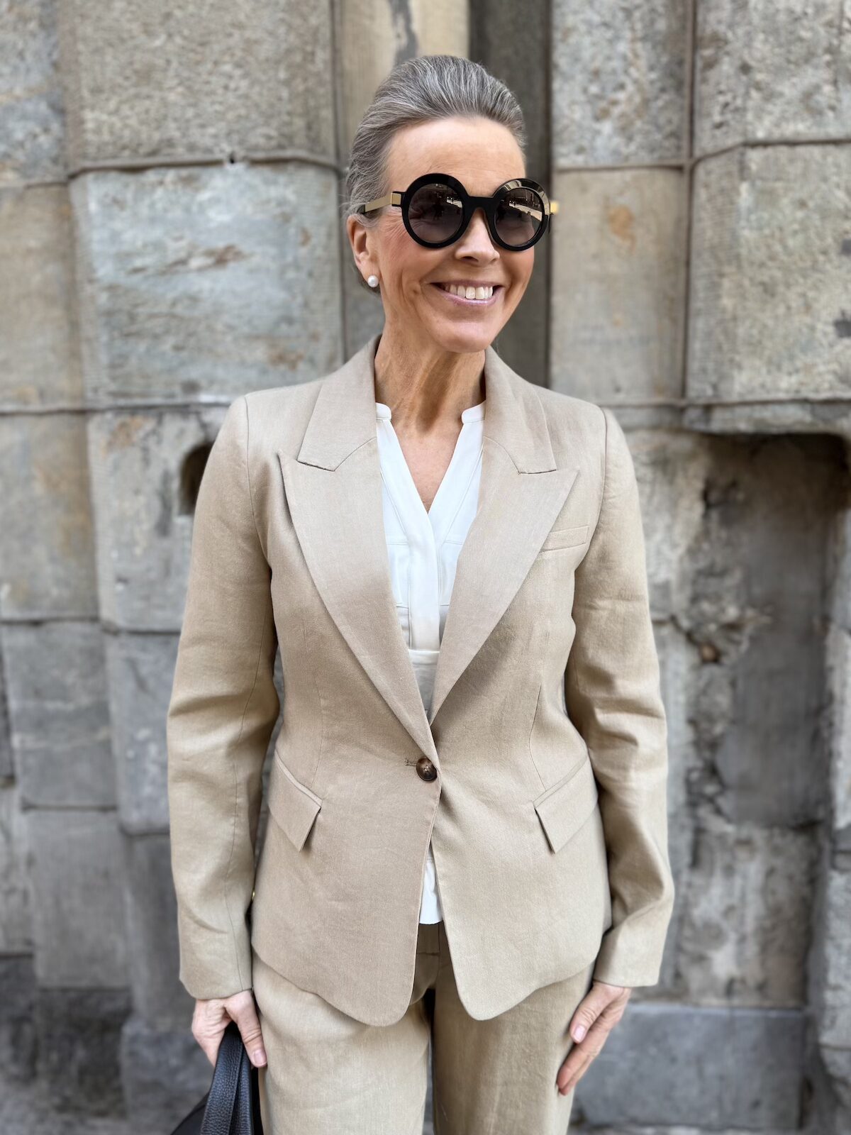 Bani pellavasekoite jakku on ihanan mallinen. Jakun edessä on yksi nappi ja jakussa on myös vuori. Jakku on slimmattu ja se ylettyy lantiolle. Katalla on jakusta päällä koko 34. Jakku vastaa normaalia kokoa.