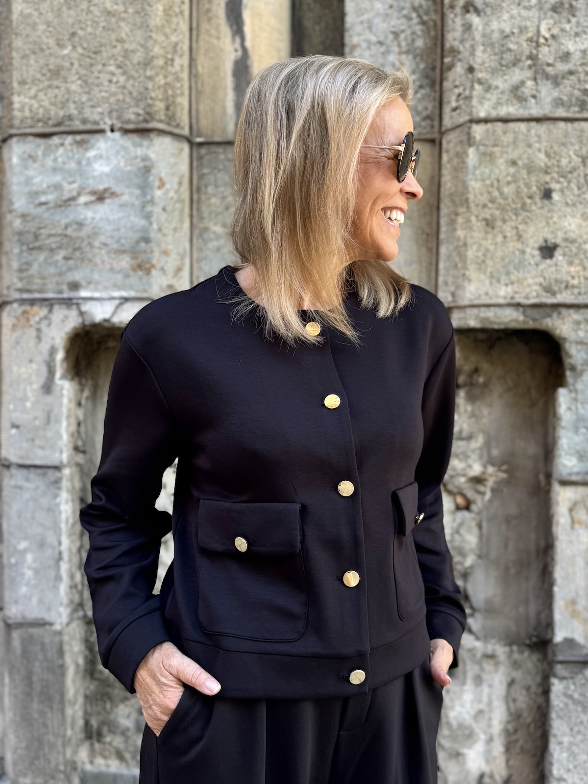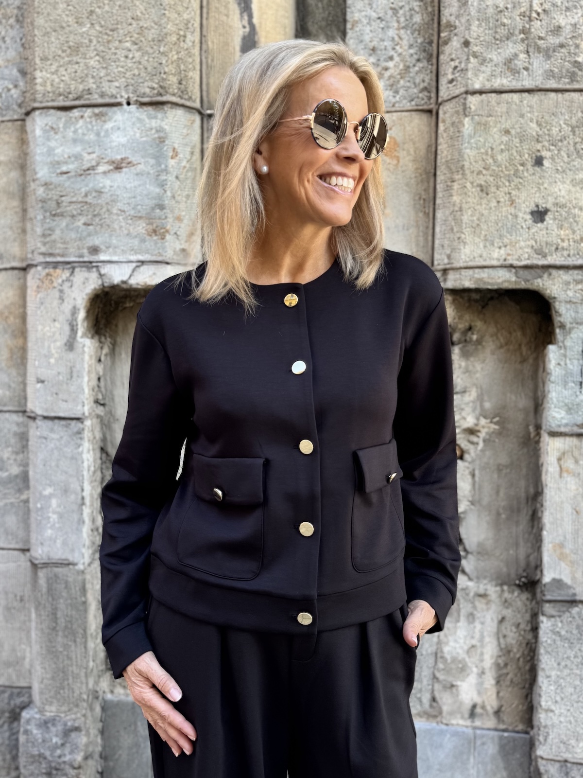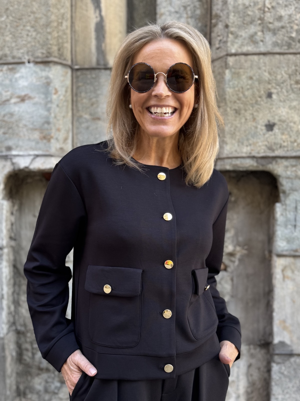 Gida Vincent jakku on super ihana. Se kuuluu myös ”Pumpulia iholle” olevaan sarjaan. Jakussa on O-kaula-aukko ja täyspitkät hihat. Sama kantti toistuu sekä hihansuissa että jakun helmassa. Edessä on sileät, pyöreät kullanväriset napit. Edessä on taskut napeilla. Malliltaan jakku on suora ja se loppuu juuri lonkkaluiden alapuolelle. Katalla on jakusta päällä koko S. Jakku on yhden koon isompaa kuin normaalisti.