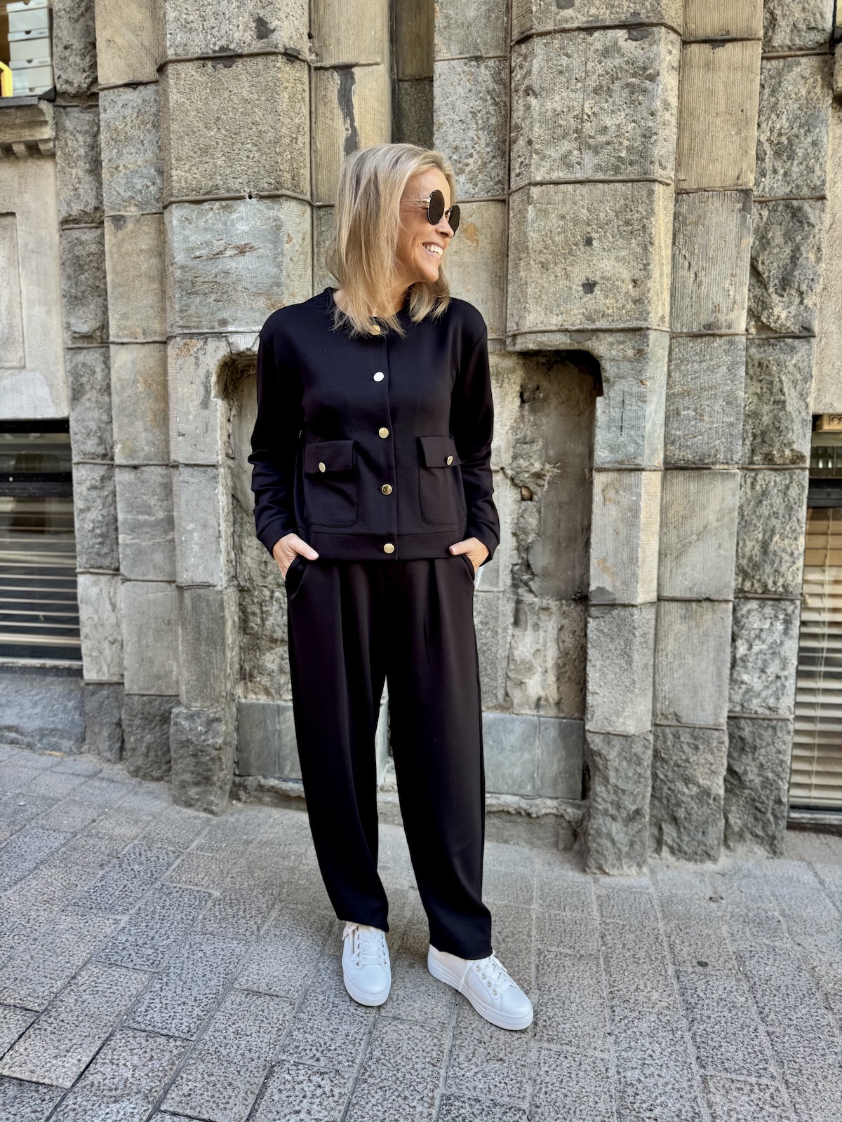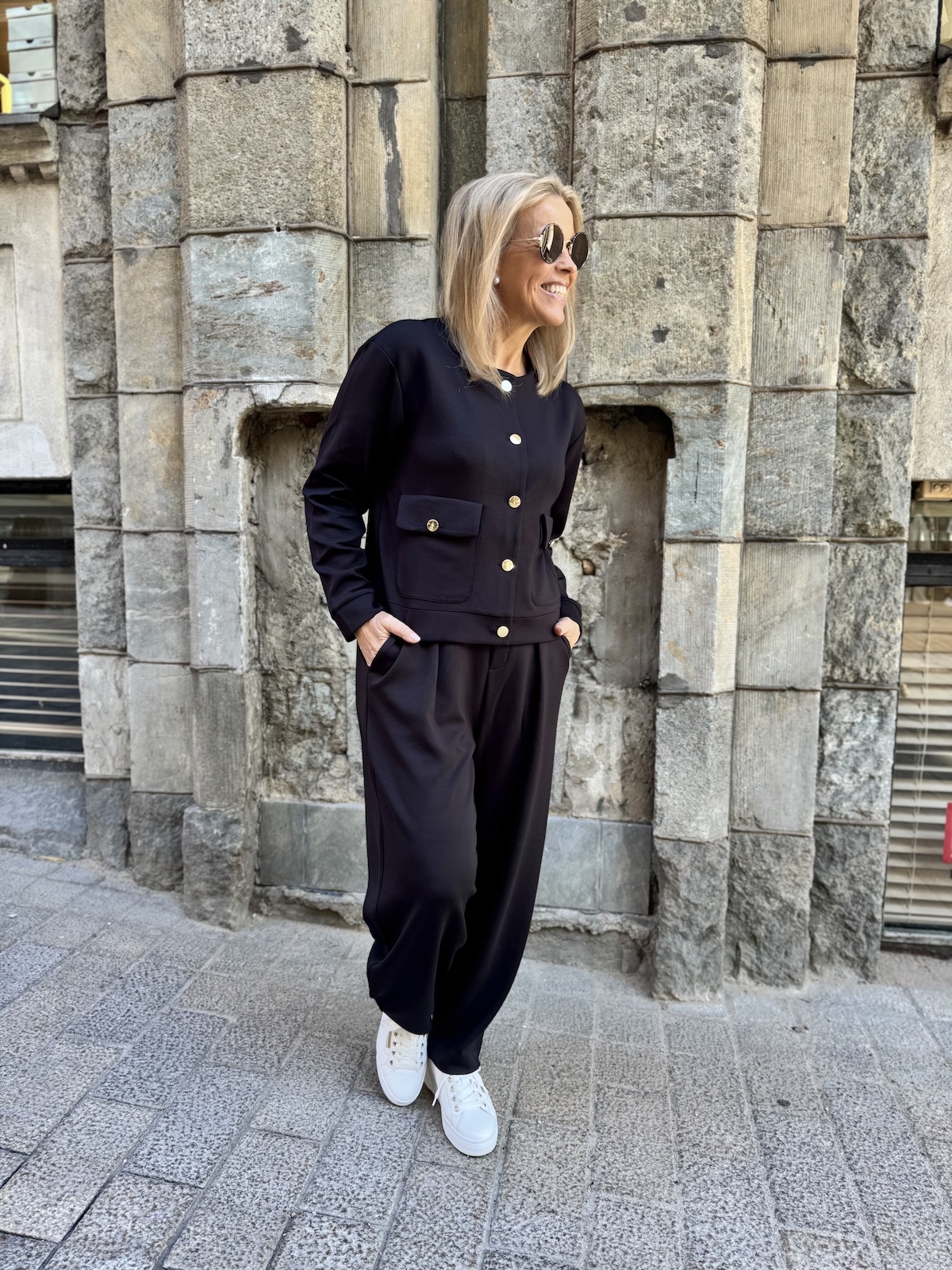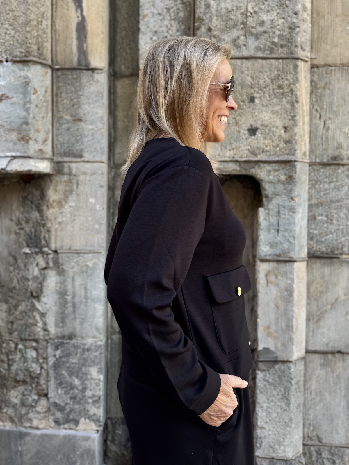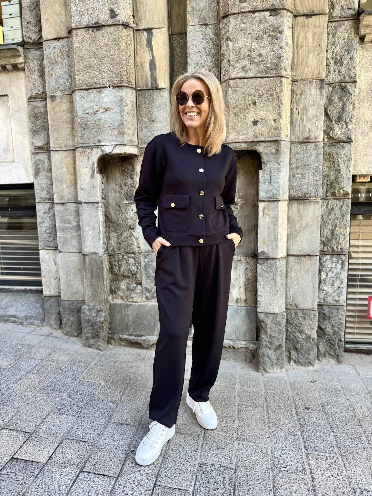 Gida Vincent jakku on super ihana. Se kuuluu myös ”Pumpulia iholle” olevaan sarjaan. Jakussa on O-kaula-aukko ja täyspitkät hihat. Sama kantti toistuu sekä hihansuissa että jakun helmassa. Edessä on sileät, pyöreät kullanväriset napit. Edessä on taskut napeilla. Malliltaan jakku on suora ja se loppuu juuri lonkkaluiden alapuolelle. Katalla on jakusta päällä koko S. Jakku on yhden koon isompaa kuin normaalisti.