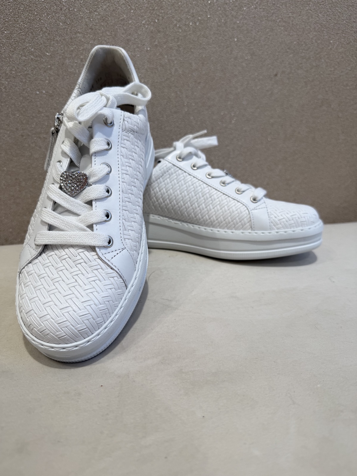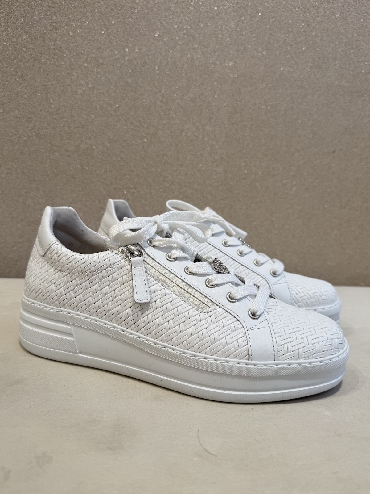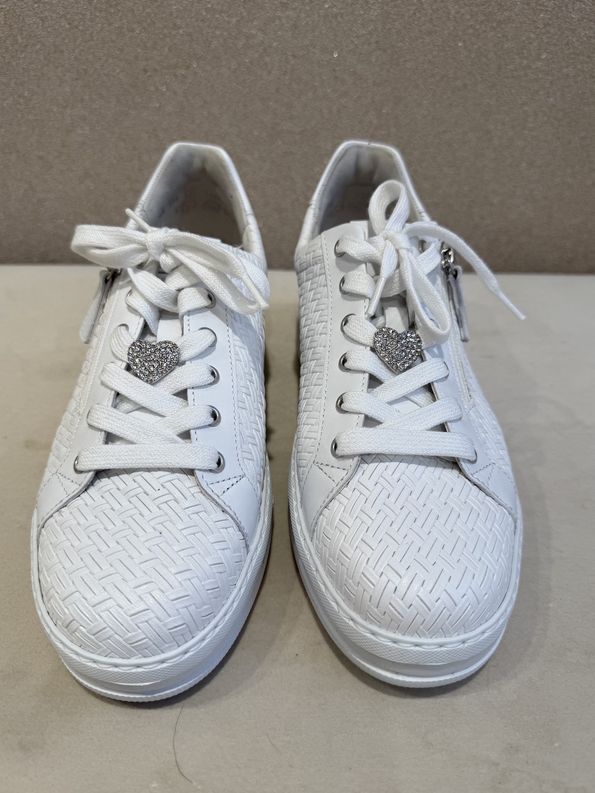 Myla tennarit ovat tyylikkäät ja sellaiset, jotka voi pukea myös hameiden ja mekkojen kanssa. Tennareissa on sekä vetoketju että nauhat edessä. Nauhoissa on myös kaunis sydän 🙂 Tennareissa on kaunis punottu kuosi. Pohja on muutaman sentin korkea ja ne ovat loistavat jalkaan.