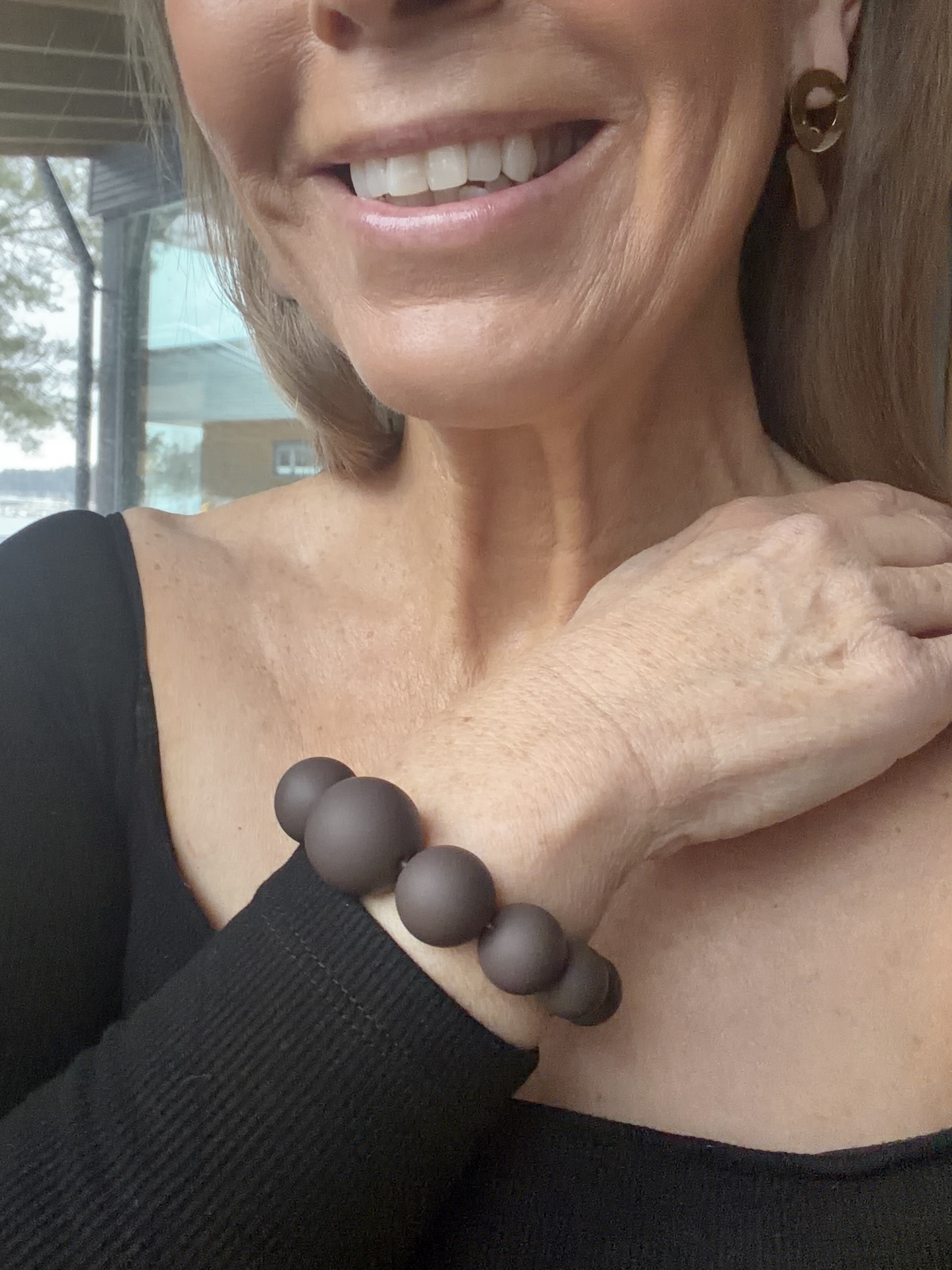 Bead on herkullinen ja helppo käsikoru. Korussa on eri kokoisia, kumin tuntuisia palloja ja käsikoru on kuminauhavenykkeellä eli helppo laittaa ja ottaa pois kädestä.
