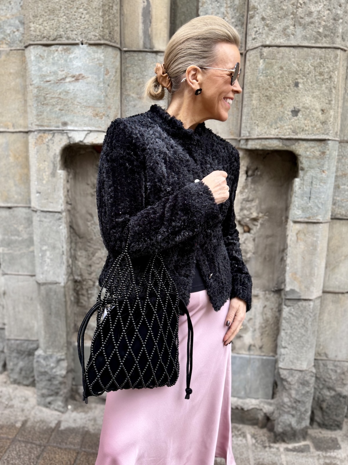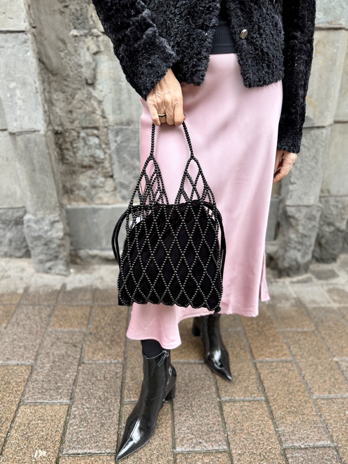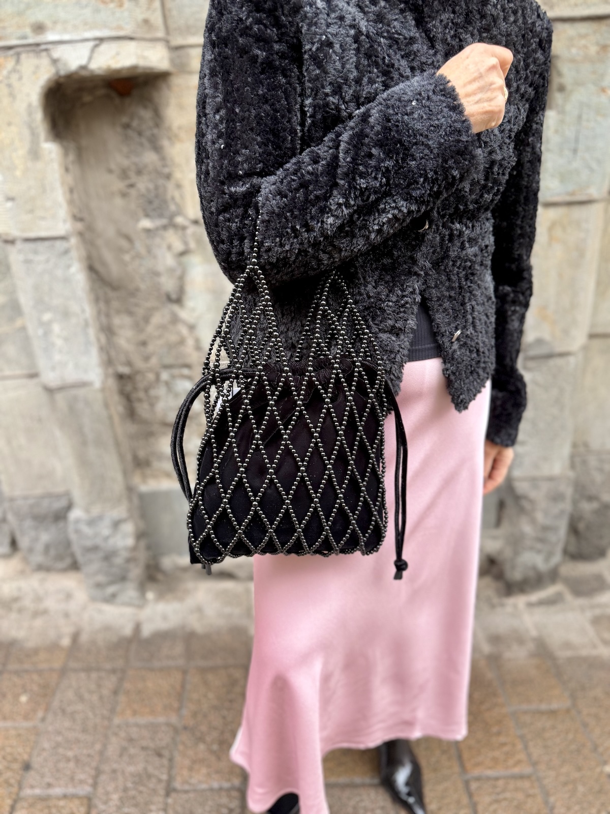 Dayn musta helmipussukka on hauska! Pussukassa on kaksi laukkua. Päällinen on rakennettu mustista helmistä ja sen sisällä on musta samettinen pussukka. Pussukan saa vedettyä kiinni nauhoilla. Laukun koko on n. 26 x 26 cm.