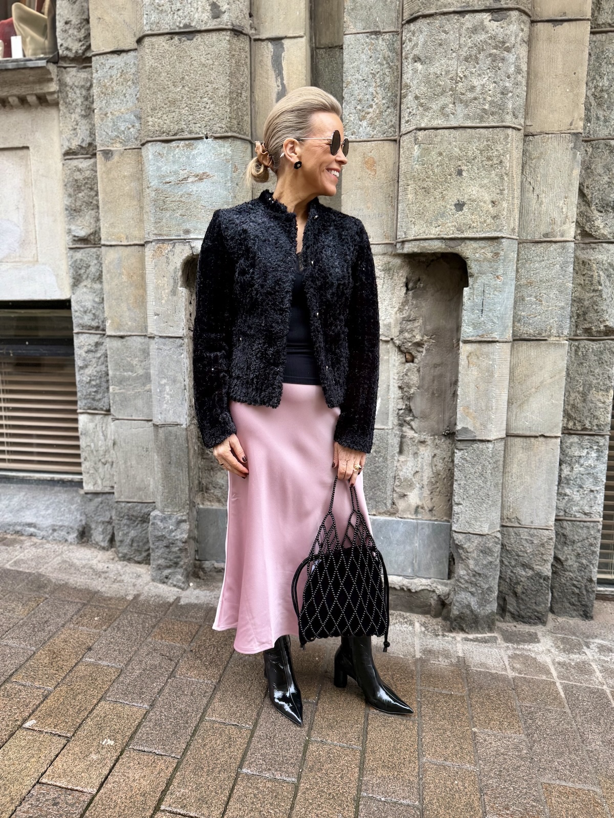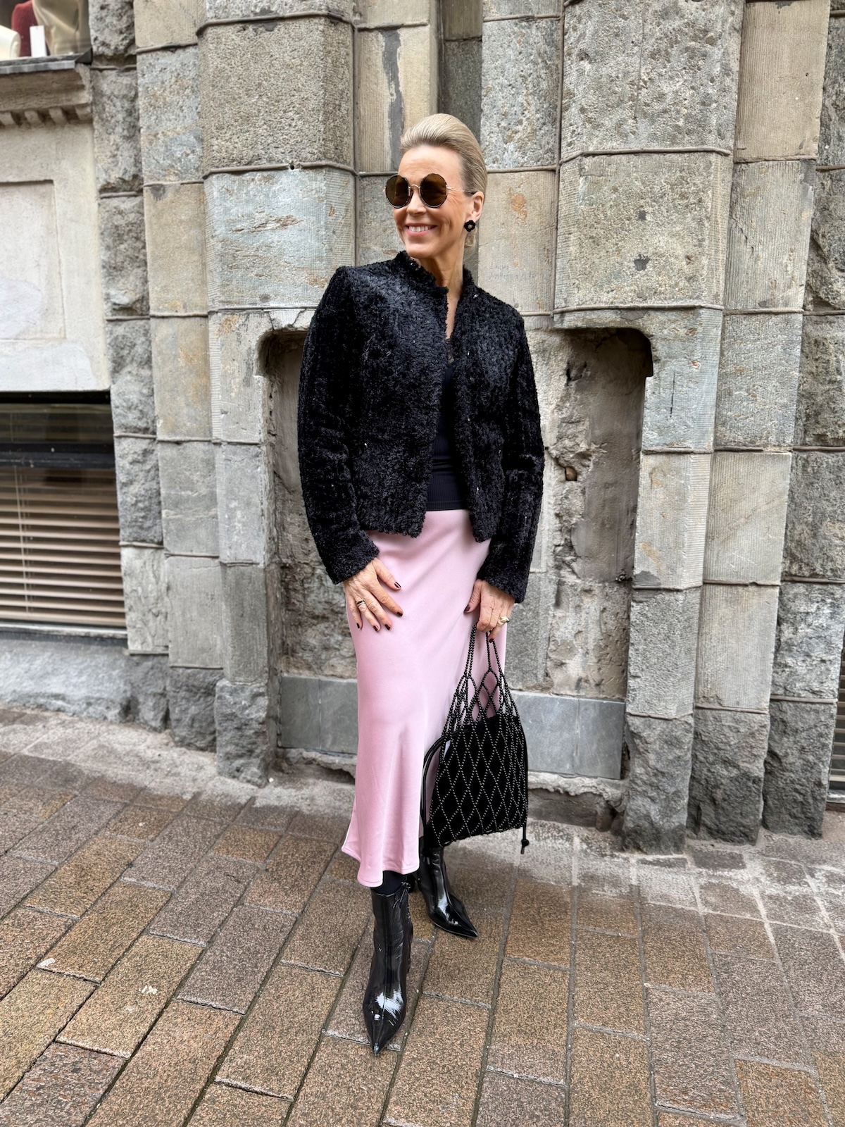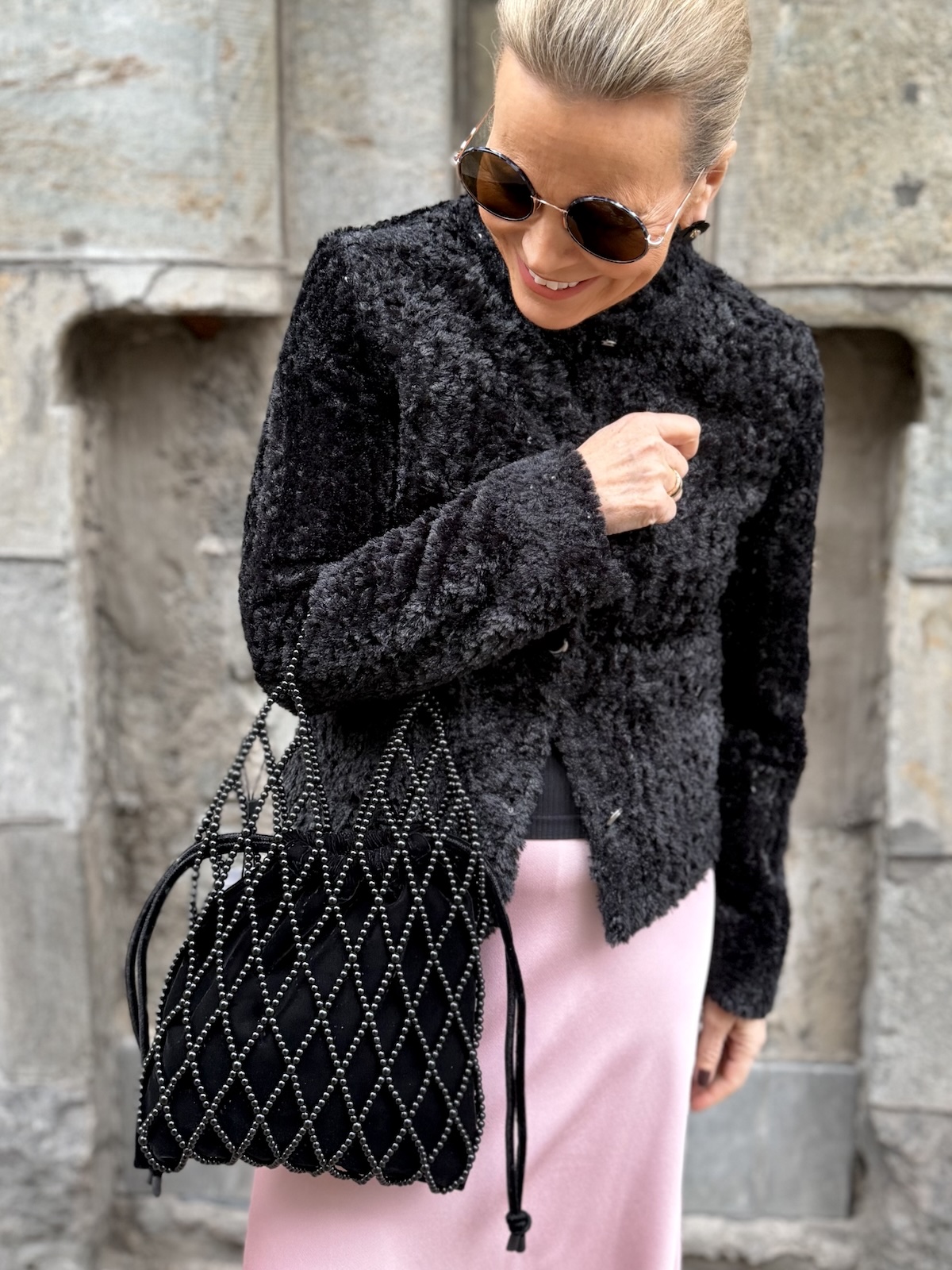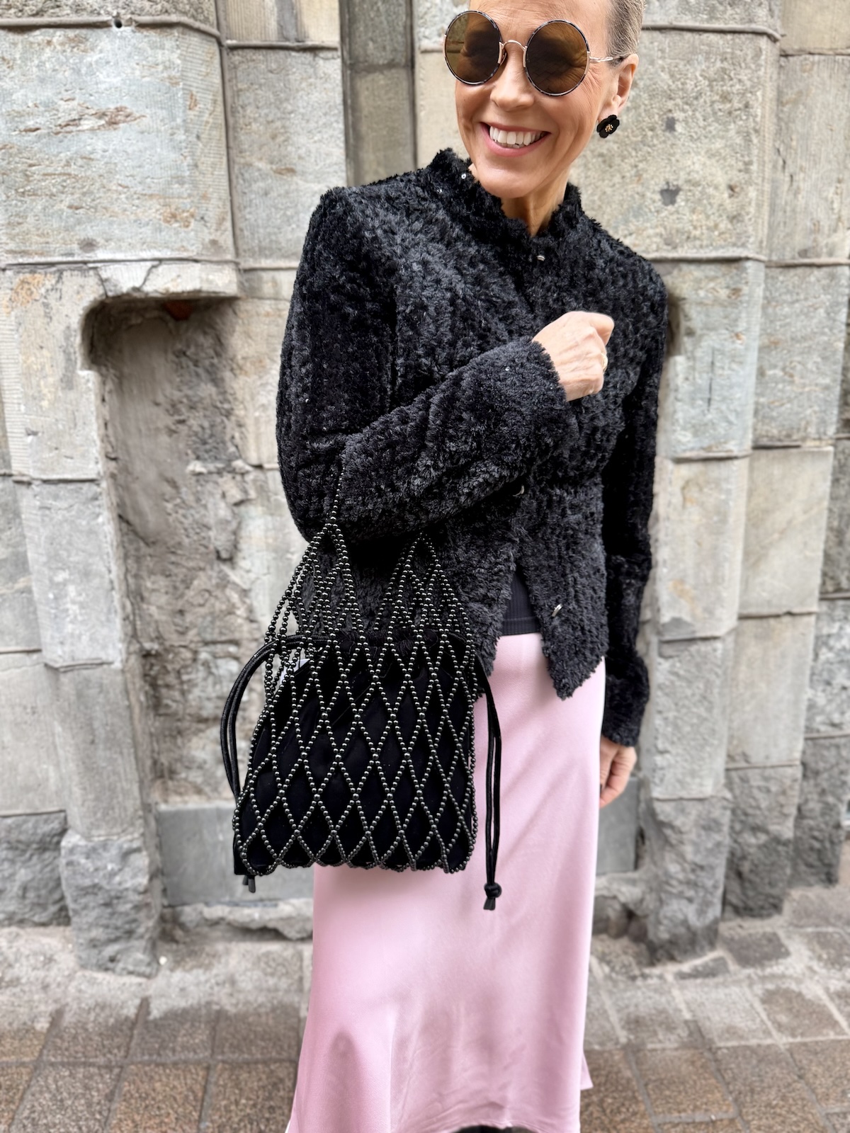Dayn musta helmipussukka on hauska! Pussukassa on kaksi laukkua. Päällinen on rakennettu mustista helmistä ja sen sisällä on musta samettinen pussukka. Pussukan saa vedettyä kiinni nauhoilla. Laukun koko on n. 26 x 26 cm.