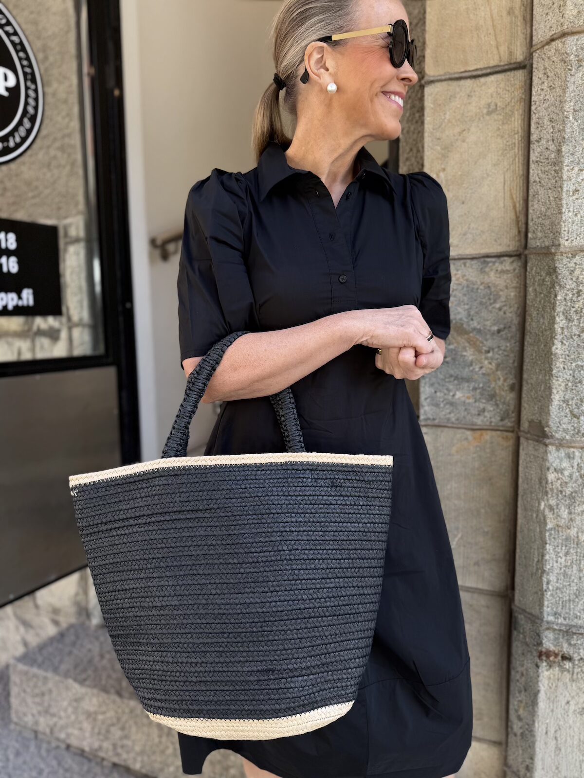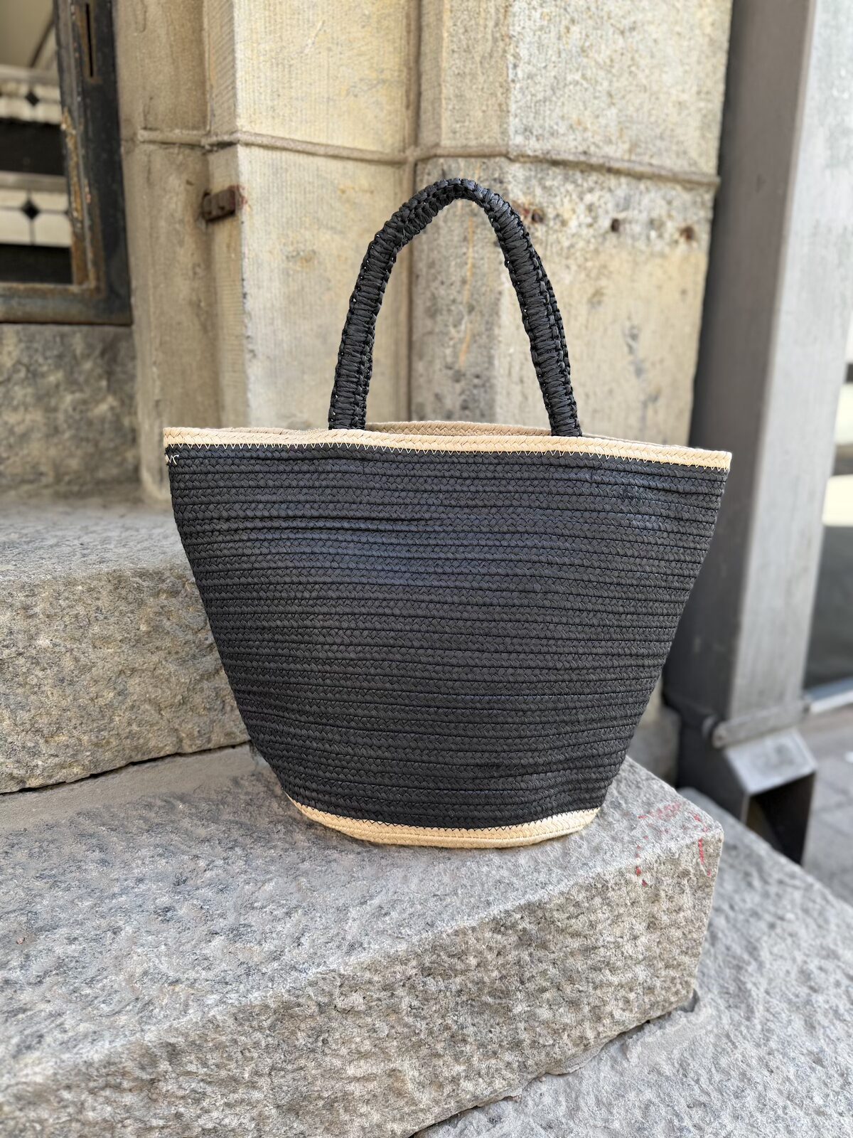 Bigge on kaunis korikassi, jossa on kaksivärinen väritys. Pääväri on musta ja tehostevärinä on klassinen beigen sävy. Kassin sisällä ei ole taskuja. Kassia voi kantaa kädessä tai olkapäällä. Kassin koko on: ylhäältä suuaukosta 45 cm, pohjasta 30 cm. Kassin leveys on pohjasta on 13 cm ja korkeus 32 cm. Kantohihnojen pituus on n. 44 cm.
