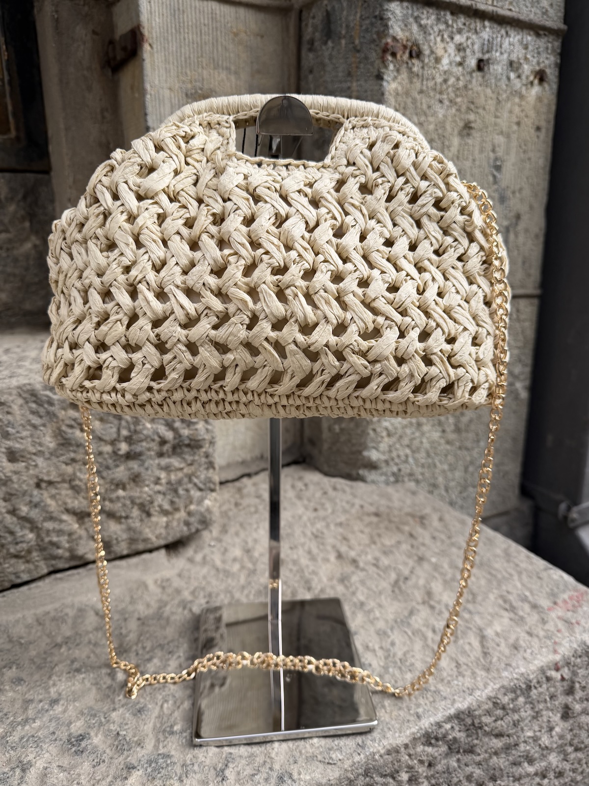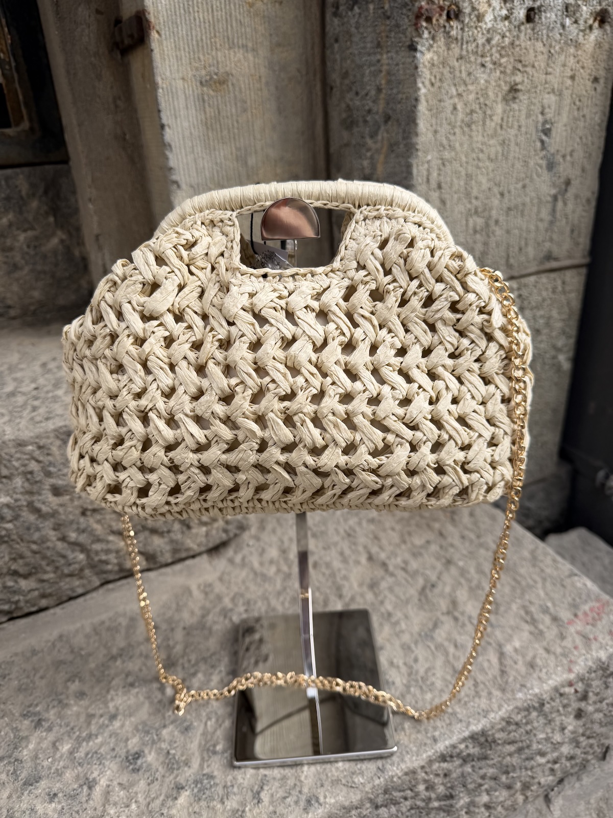 Birgit koriclutch on pehmoinen ja loistava kesälaukku. Clutchissa on käsikahva ja mekanismi, jolla se on helppo avata. Sisällä on kangasvuori ja clutchiin kuuluu kullanvärinen ketjuhihna. Laukun koko on n. 30×18 cm ja hihnan pituus on n. 110 cm.