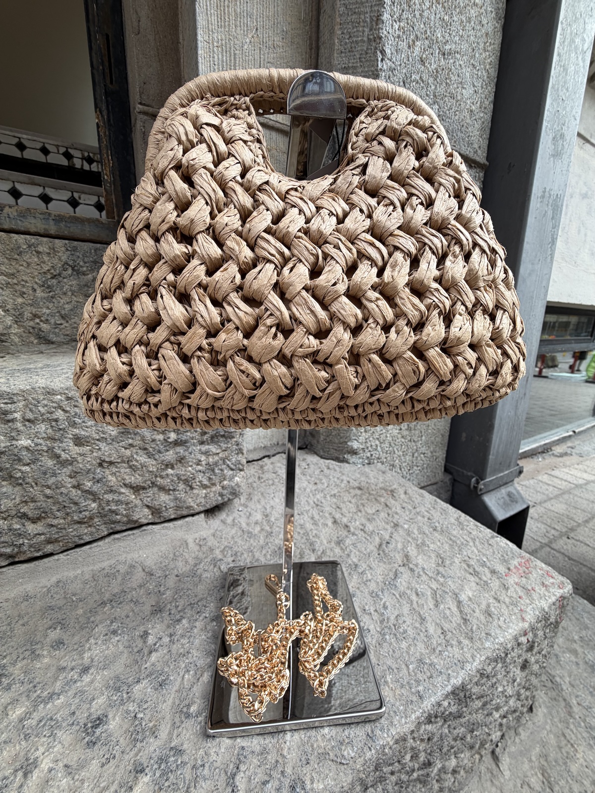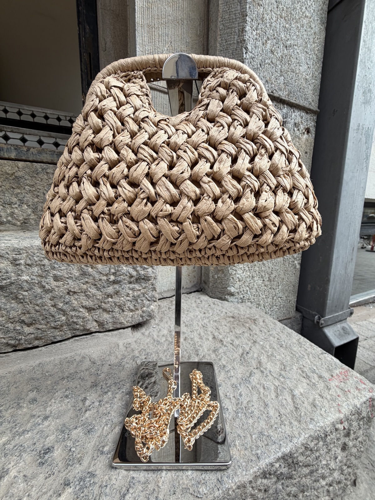 Birgit koriclutch on pehmoinen ja loistava kesälaukku. Clutchissa on käsikahva ja mekanismi, jolla se on helppo avata. Sisällä on kangasvuori ja clutchiin kuuluu kullanvärinen ketjuhihna. Laukun koko on n. 30×18 cm ja hihnan pituus on n. 110 cm.