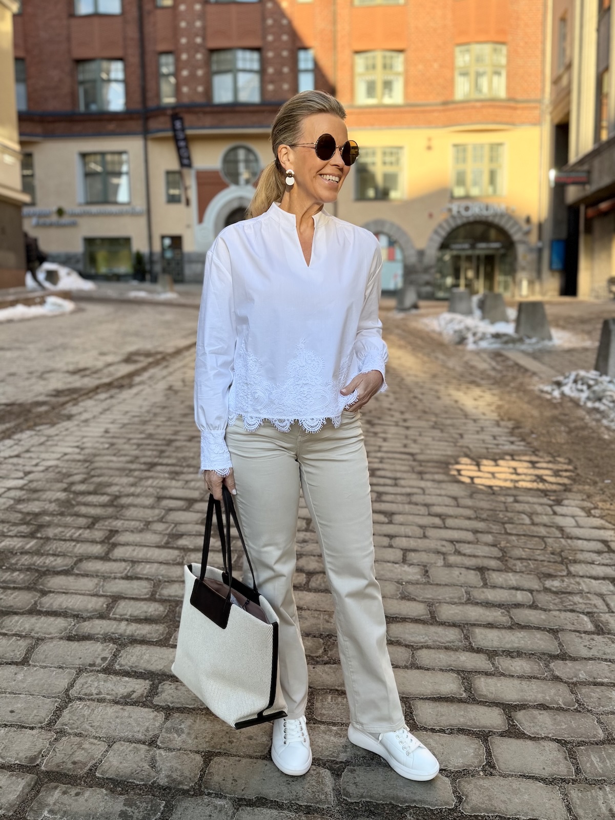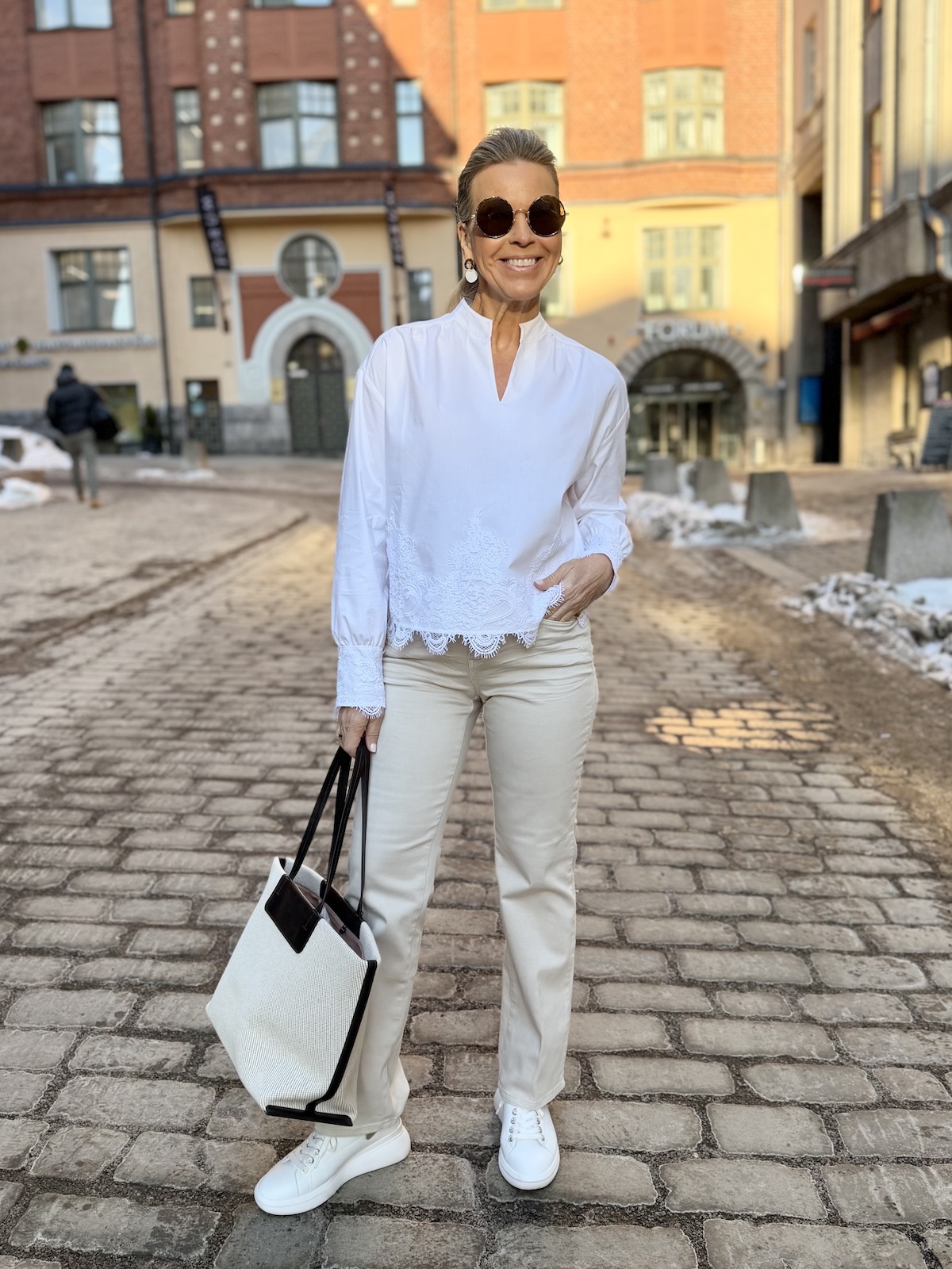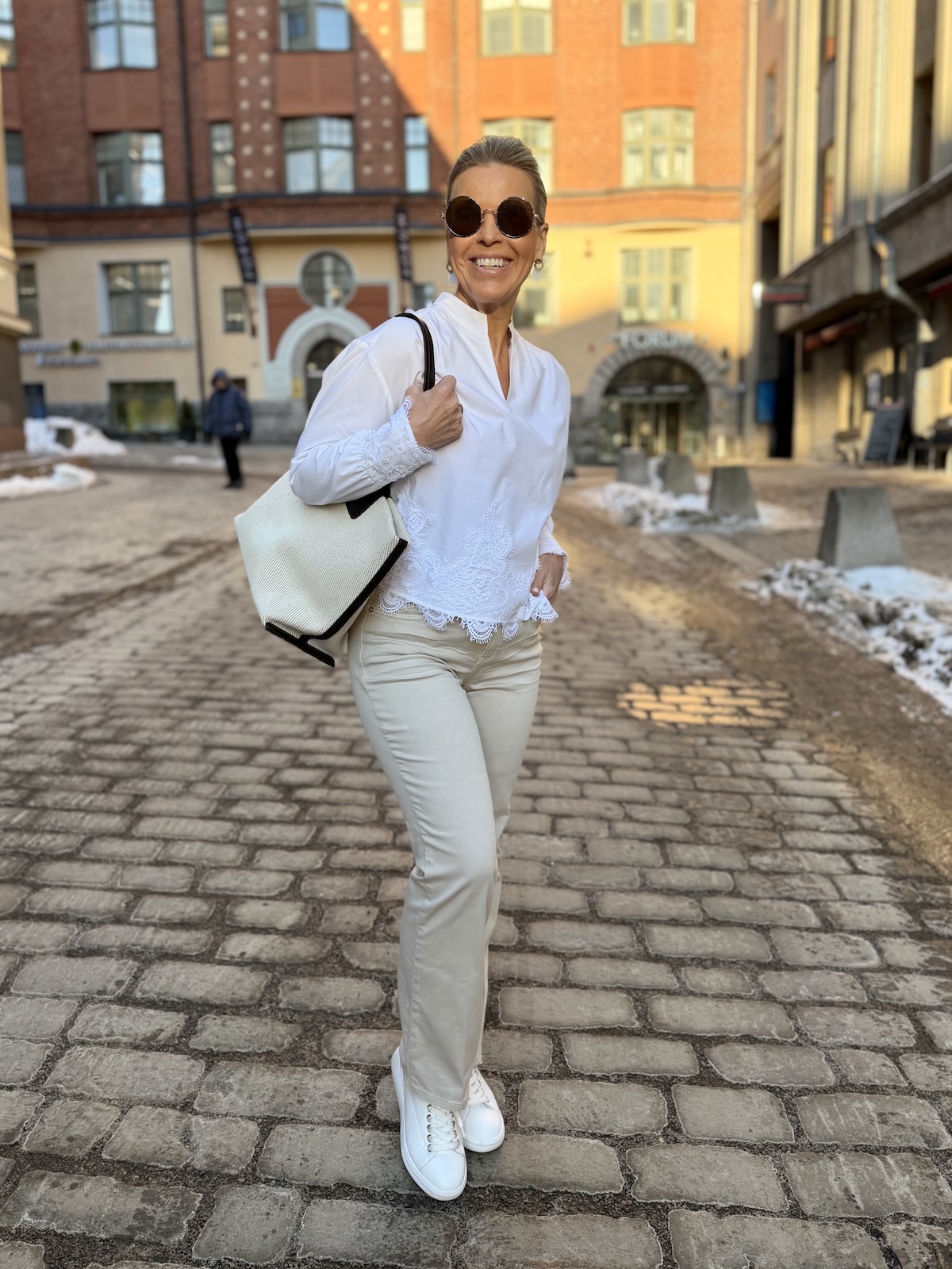 Dayn kangaskassi on kaunis. Päälloinen on ohuen ohutta raitasta beige/vaaleaa kangasta. Laukun sisällä on vaalea vuori ja yksi vetoketjullinen tasku ja yksi avotasku. Laukussa on ruskeat nahkaiset olkahihnat. Laukun saa mukavasti olalle. Laukun koko on n. 39 x 44 cm. Pohjan leveys on n. 14 cm. Olakhihnojen pituus on n. 60 cm.