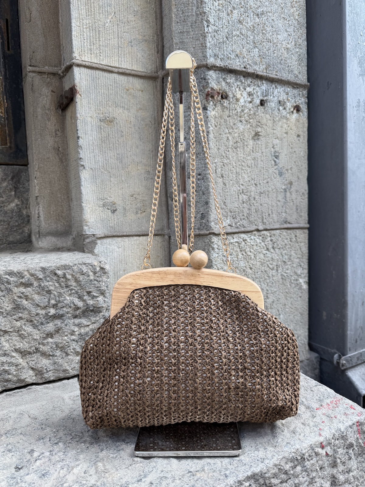 Fress koripussukka on kaunis ja sopii myös rennompaan menoon, koska lukko on puuta. Pussukan sisällä on ruskea puuvilla vuori ja yksi avotasku. Pussukasta saa irti kullanvärisen ketjuhihnan jonka pituus on n. 126 cm.