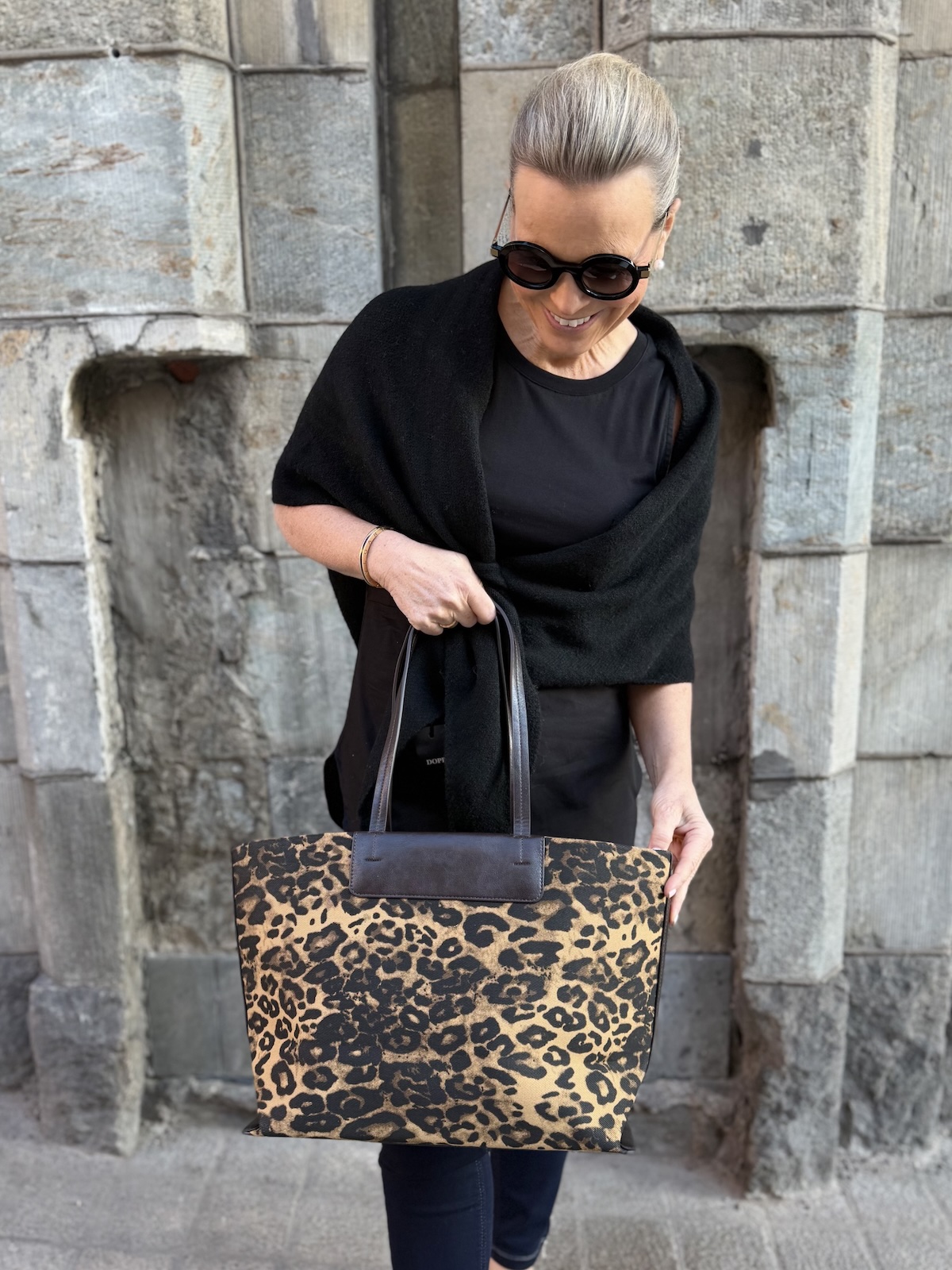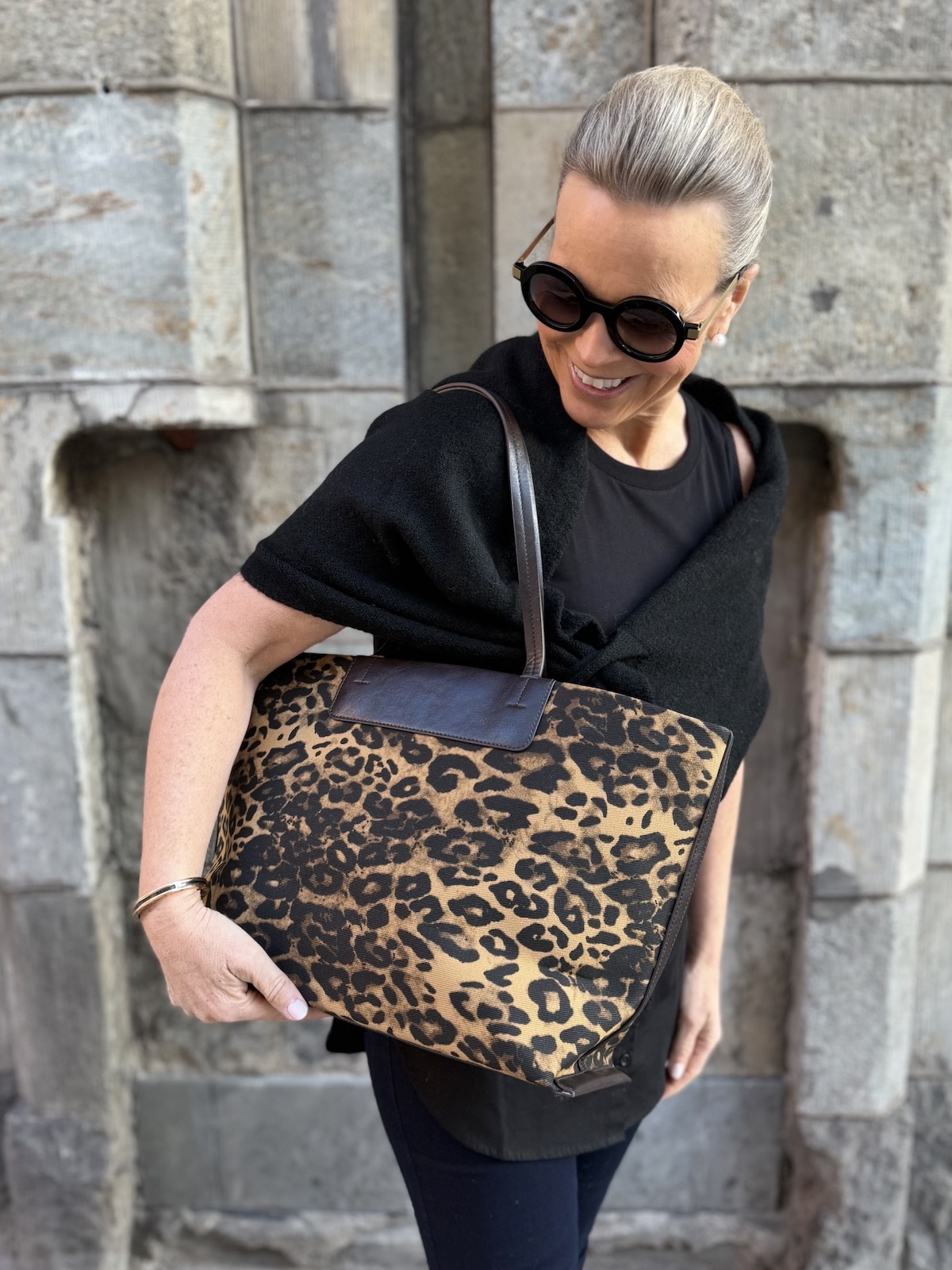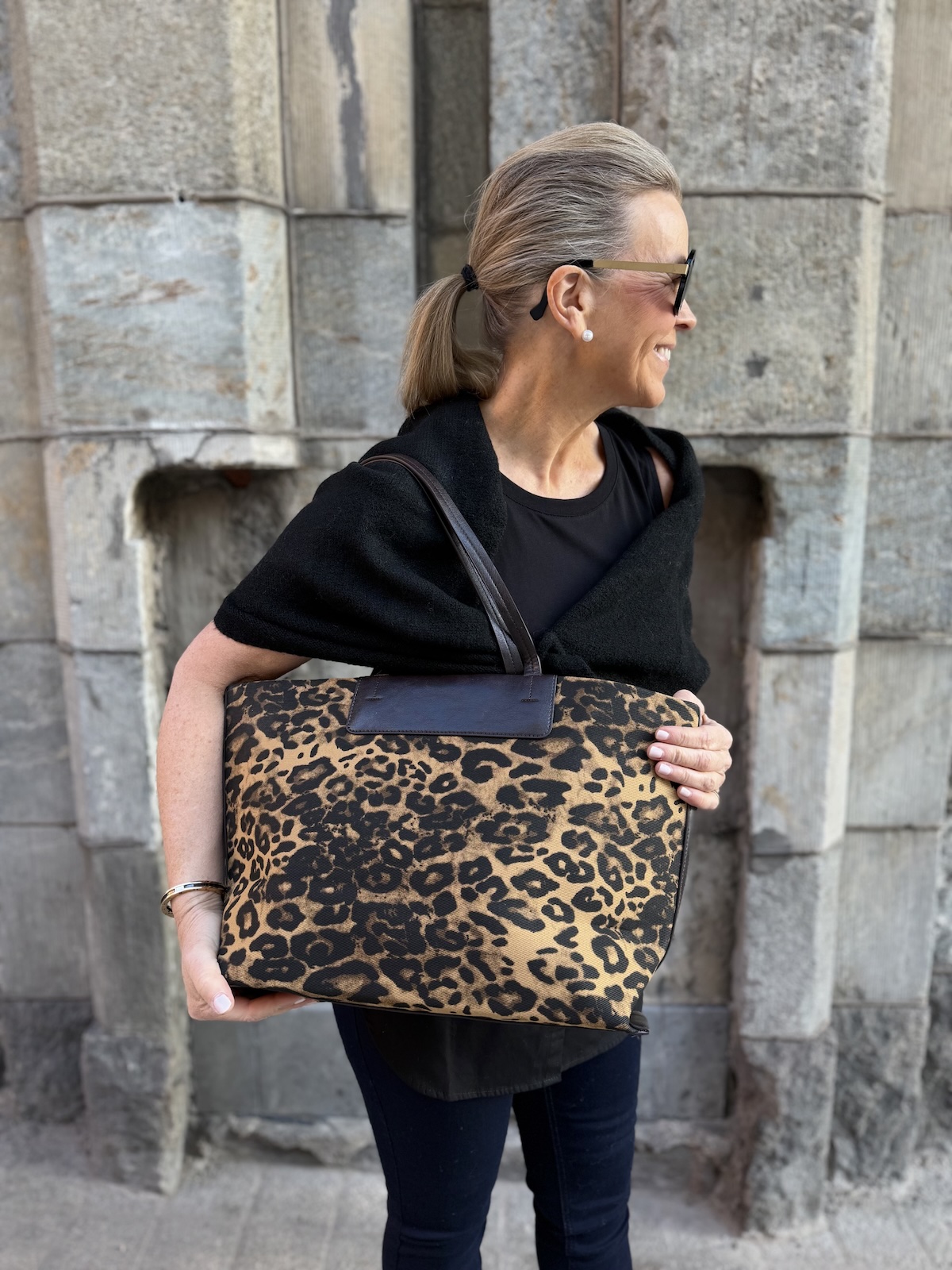 Leo kassi on juuri sopivan kokoinen kassi joka päiviseen käyttöön. Kassissa on kaunis musta/konjakki leo kuosi. Laukussa on vaalea vuori ja sisällä on yksi vetoketjullinen tasku ja yksi avotasku. Laukun saa mukavasti olalle. Laukun koko on n. 39 x 44 cm. Pohjan leveys on n. 14 cm. Olakhihnojen pituus on n. 60 cm.