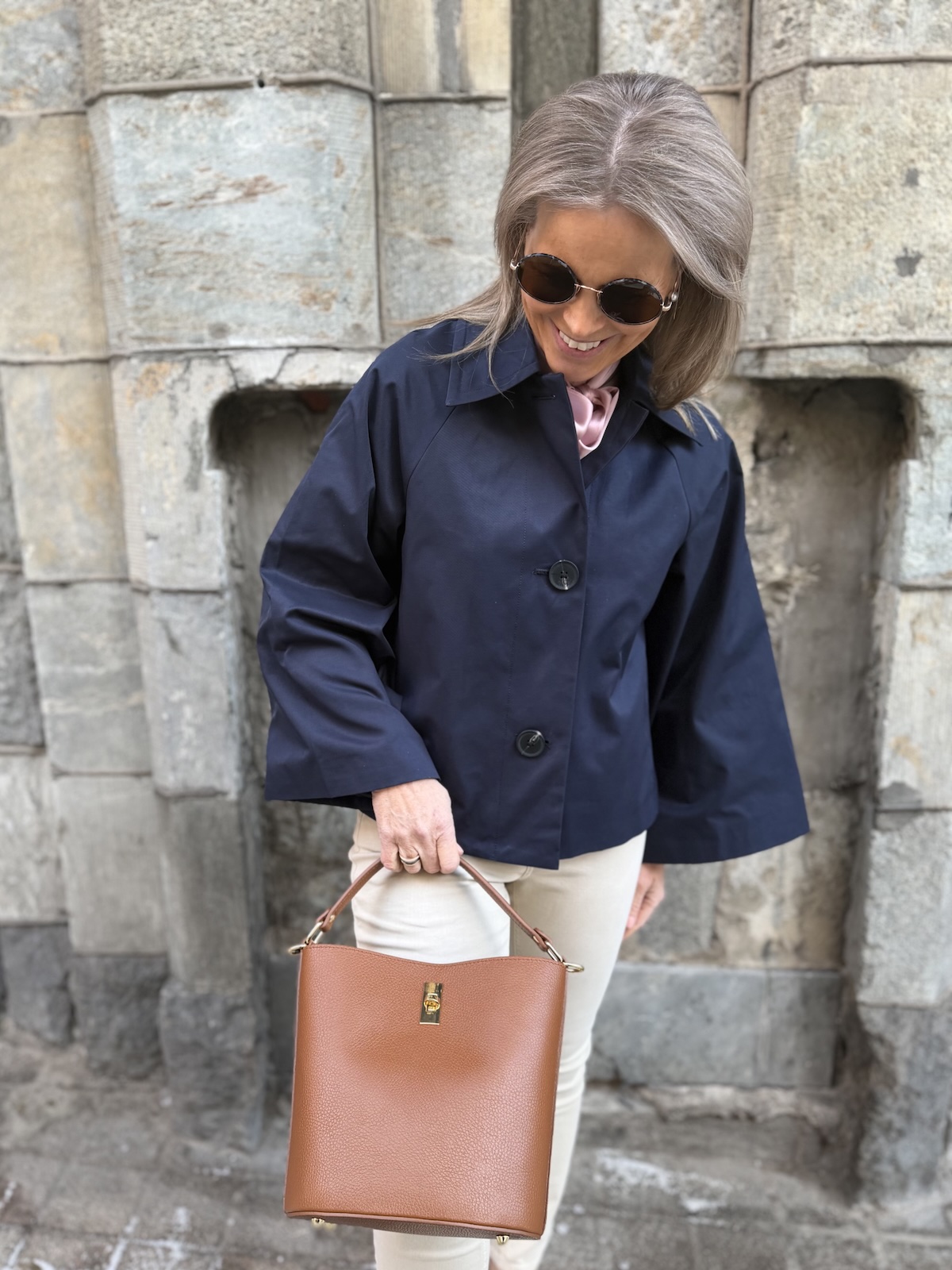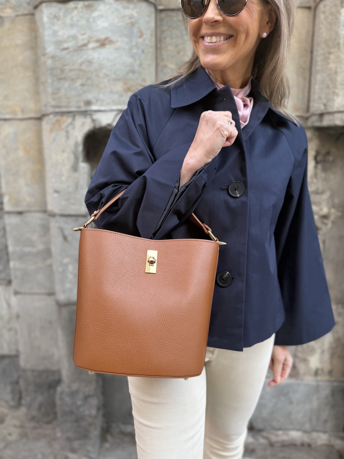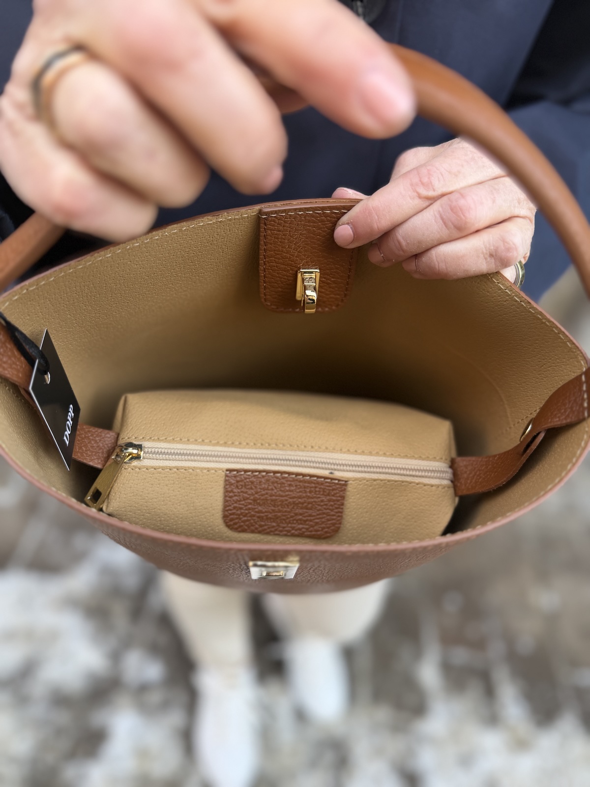 Elodie on tyylikäs ja eleetön nahkalaukku. Laukussa on kantokahva eli laukkua voi kantaa kädessä ja käsivarrella. Laukussa on kullanvärinen lukko. Laukun sisällä on kangaspussukkaa vetoketjulla, jonne saa tavarat turvaan. Laukun koko on n. 23 x 23 cm.