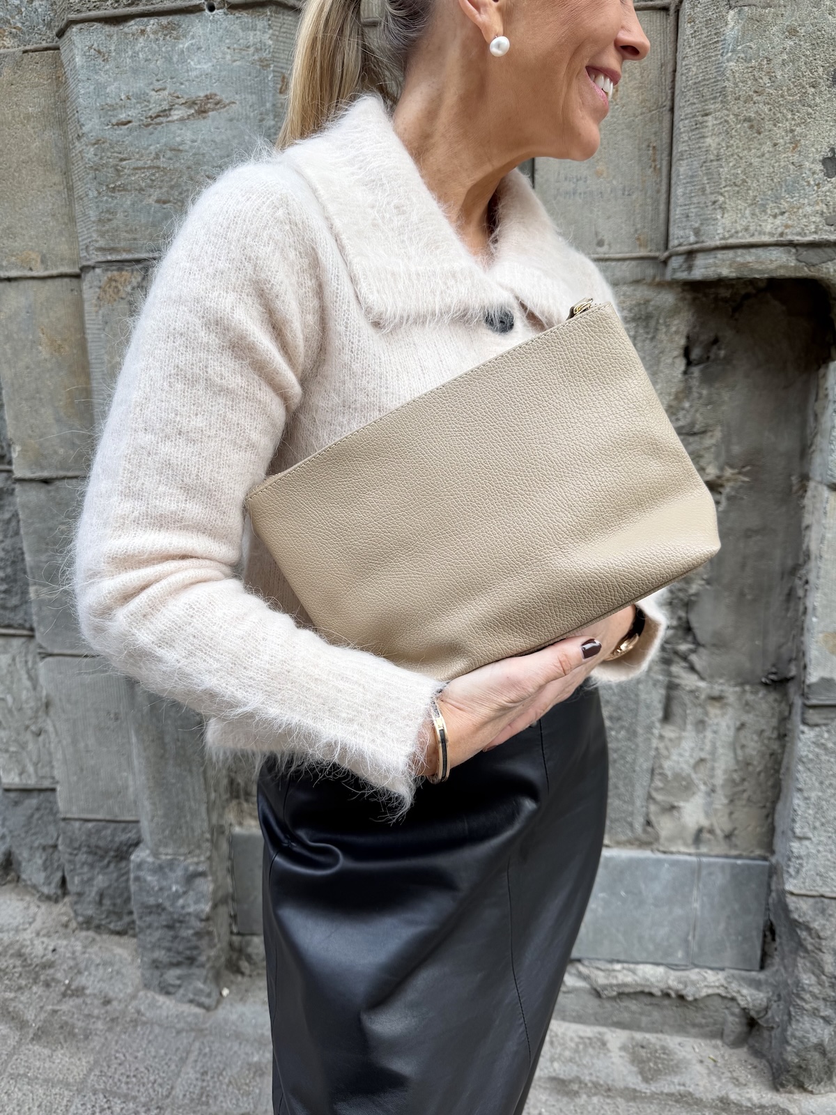Iso nahkapussukka on loistava pussukka monenlaiseen käyttöön. Pussukka soveltuu meikkipussiksi ja sekä clutchiksi. Pussukassa on musta tekstiilivuori. Pussukan päällä on kullanvärinen vetoketju ja nahkainen vedin. Pussukan koko on 20 x 30 cm ja pohjan leveys on n. 8 cm.