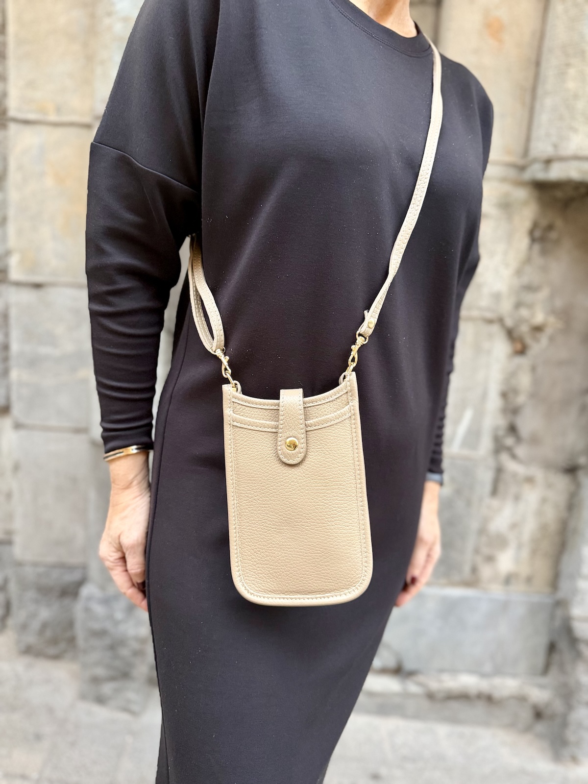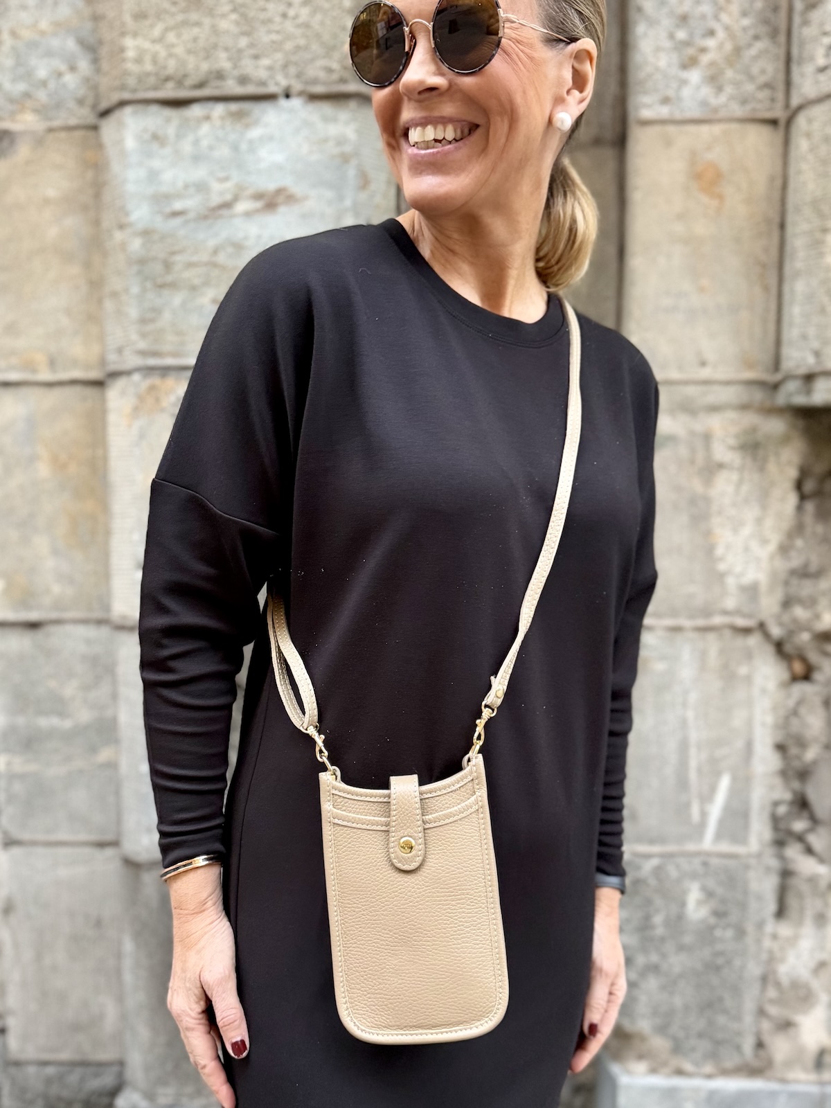 Kännykkälaukku on kätevä, koska pieneen laukkuun mahtuu isokin kännykkä ja etulokerikkoon mm. maksukortit ja jotain pientä. Kännykkälaukun saa kiinni nepparilla. Olkahihna on säädettävä. Kännykkälaukun koko on 13 x 20 cm ja pohjan leveys on 4 cm.