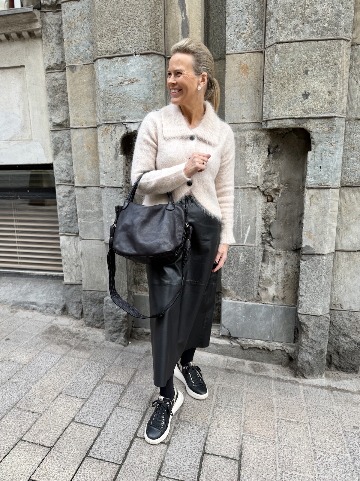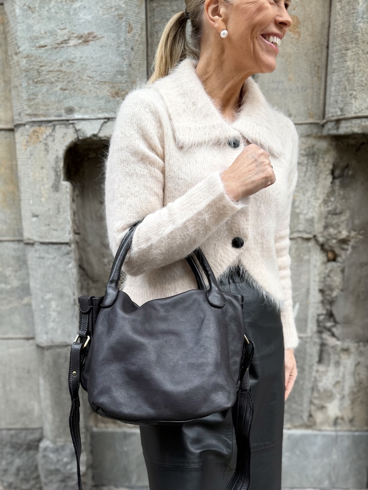 Merzina laukku on pehmoista ja upeaa nahkaa. Laukussa on lyhkäiset kantohinat sekä pidempi olkahihna joka on n. 100-110 cm pitkä. Laukun päällä on nipsu, millä laukun saa kiinni. Nipsun alla on myös vetoketju eli laukussa tavarat pysyvät turvassa. Laukussa on musta vuori ja laukun sisällä on vetoketjulinen tasku sekä kaksi avotaskua. Laukun koko on n. 25 x 30 cm ja pohjan leveys on 17 cm