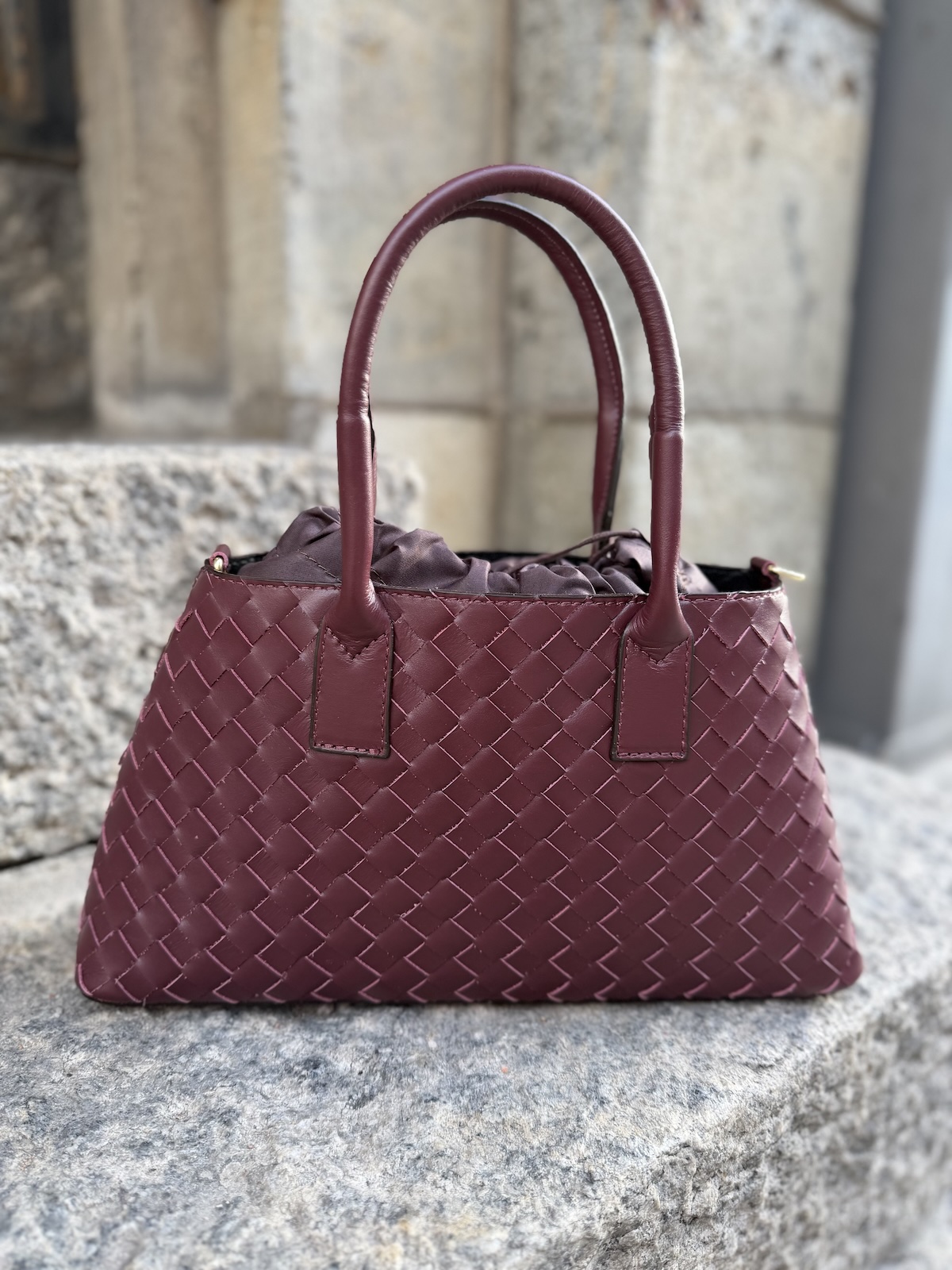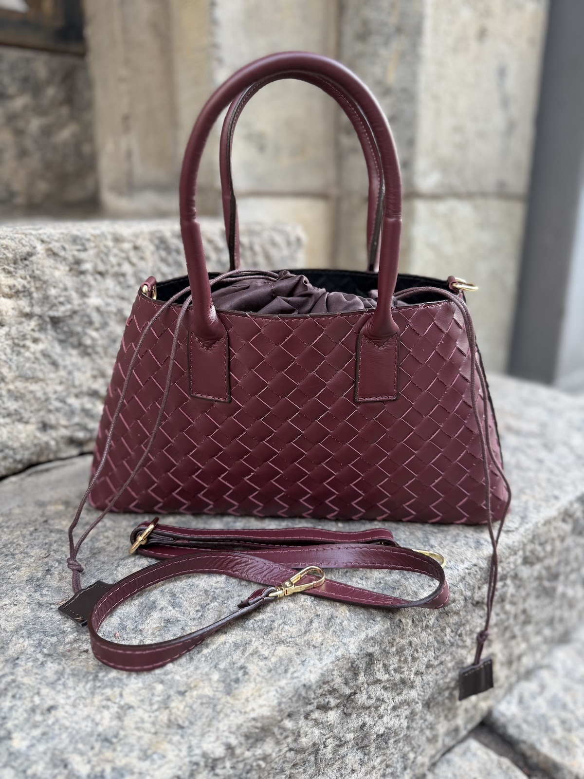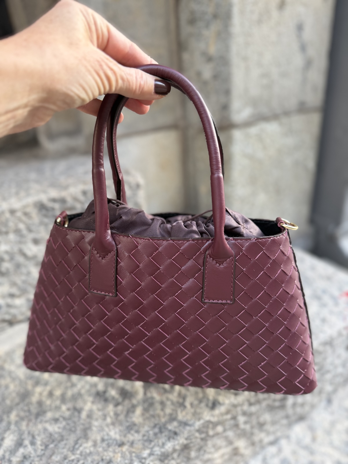 Punottu nahkalaukku on kaunis ja ajaton laukku. Laukussa on kantokahvat sekä pidempi olkahihna. Laukun sisällä on kangaspussukka, jonka saa nauhoilla kiinni. Laukun sisällä ei ole lokerikkoja. Laukun koko on n. 32 cm (pohjan leveys) x 17 cm x 8 cm pohjan leveys.