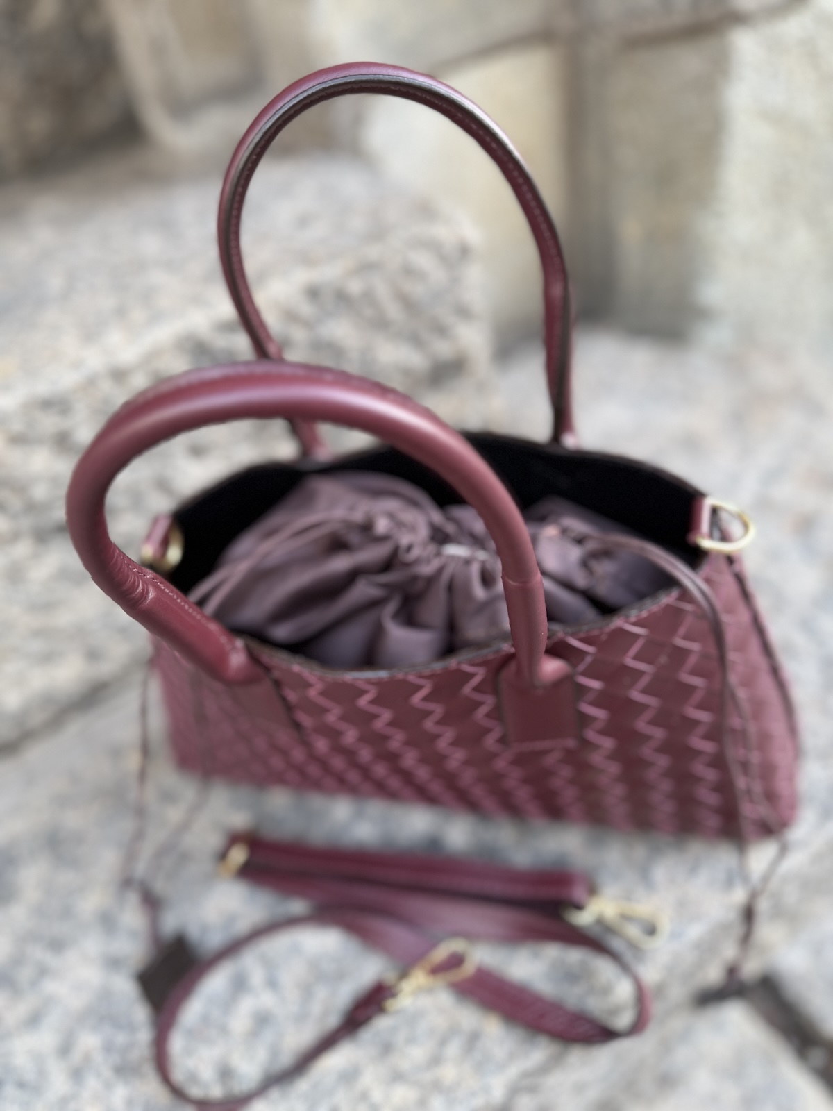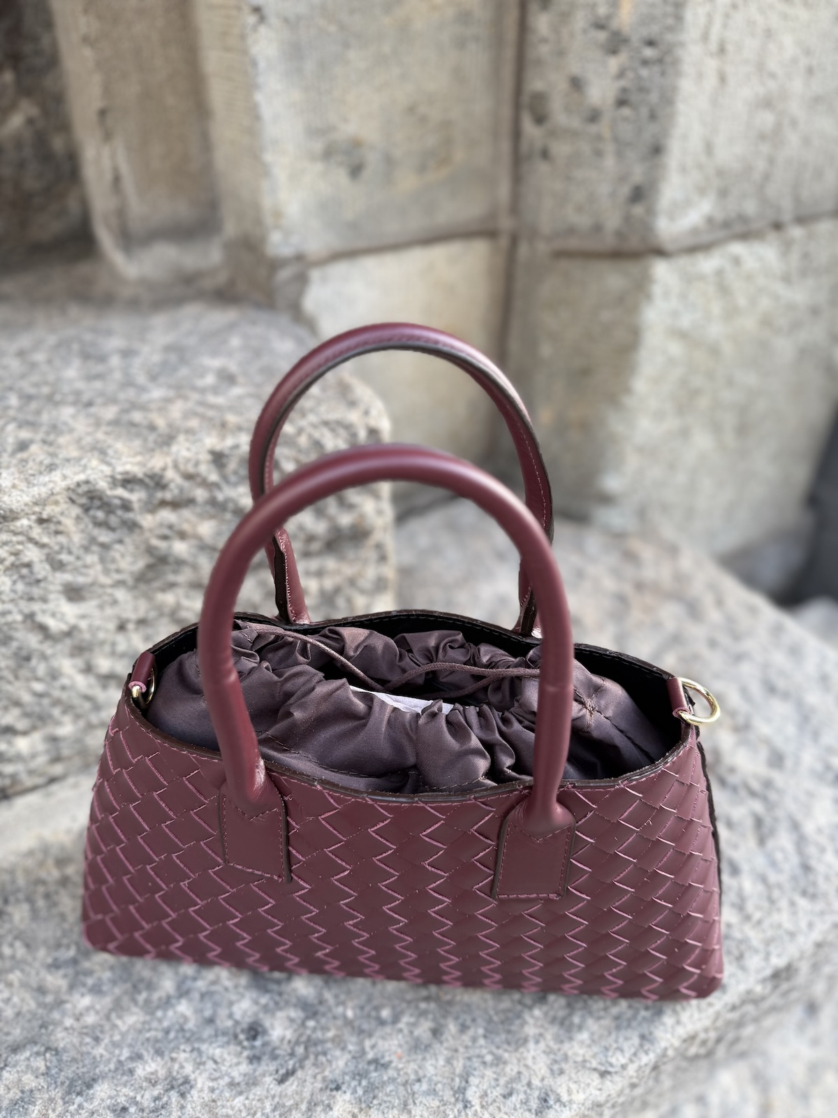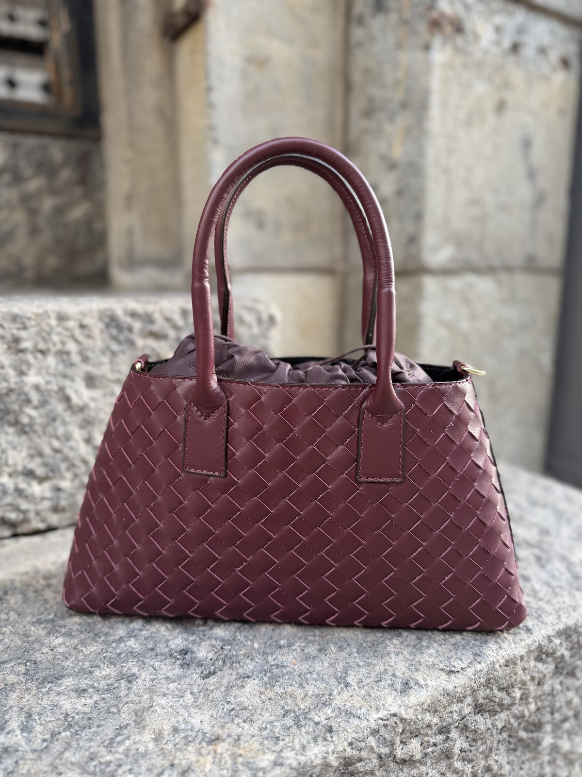 Punottu nahkalaukku on kaunis ja ajaton laukku. Laukussa on kantokahvat sekä pidempi olkahihna. Laukun sisällä on kangaspussukka, jonka saa nauhoilla kiinni. Laukun sisällä ei ole lokerikkoja. Laukun koko on n. 32 cm (pohjan leveys) x 17 cm x 8 cm pohjan leveys.