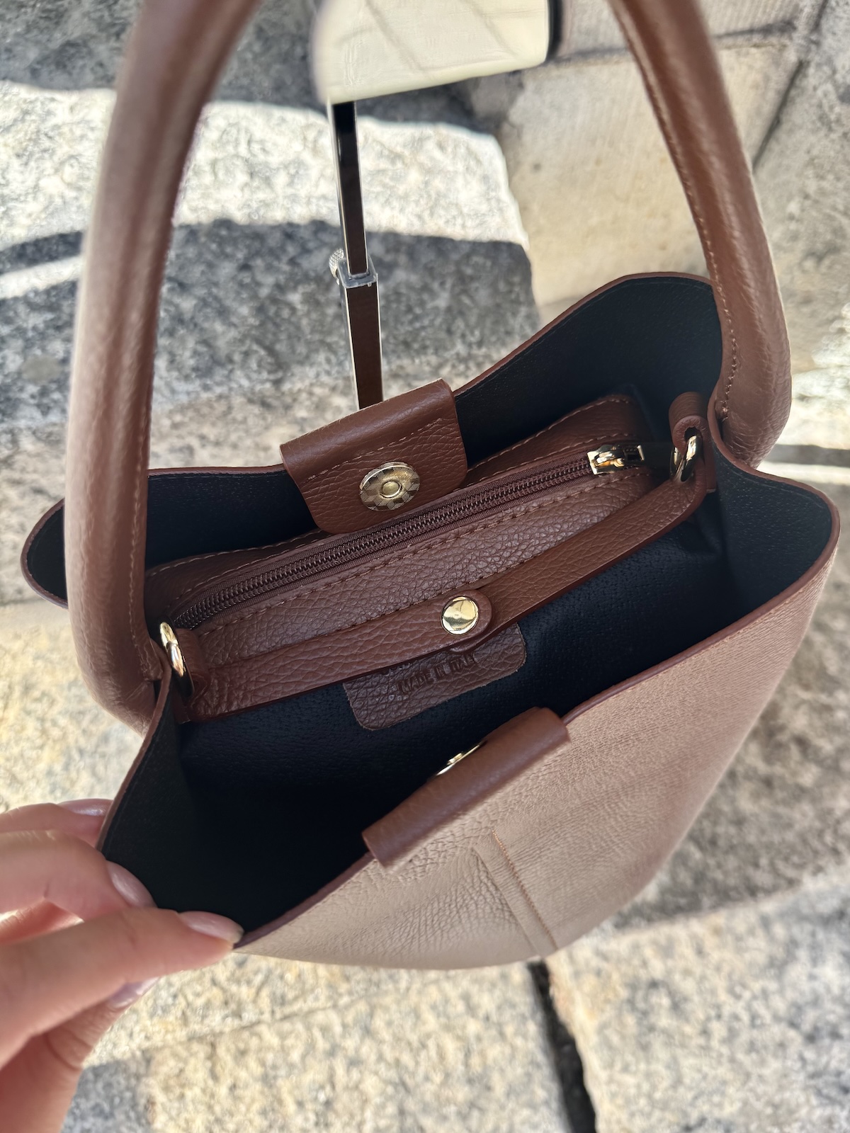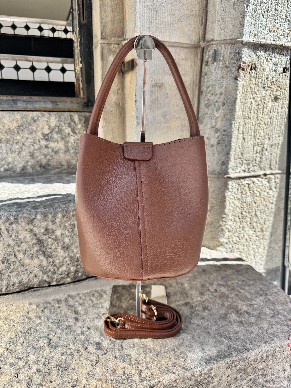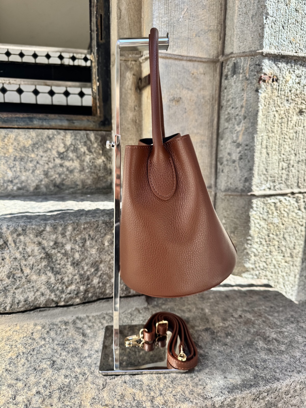 Rosalia iso nahkalaukku on upea. Laukussa on pyöreä pohja. Laukkua voi kantaa kädessä, käsivarrella sekä olalla. Laukkuun kuuluu pidempi hihna, joka on säädettävä. Hihnan pituus on max. 110 cm. Laukun koko on n. 21 x 23 cm ja pohjan halkaisija on n. 20 cm. Laukun pohjassa on kullanväriset nastat ja laukun sisällä on looppi neppareilla, jolla laukun saa kiinni. Laukun suussa on myös kullanvärinen magneetti neppari, millä laukun saa ihan kiinni. Laukun sisällä on irrallinen pussukka, jossa on vetoketju.