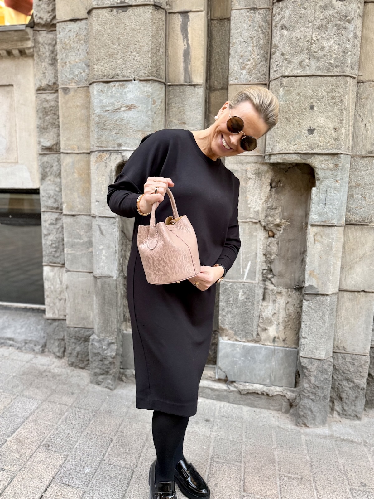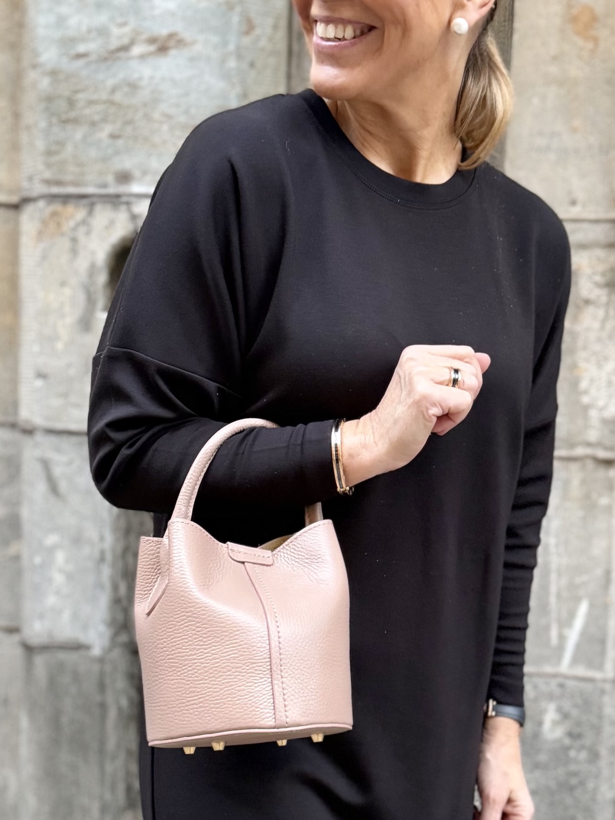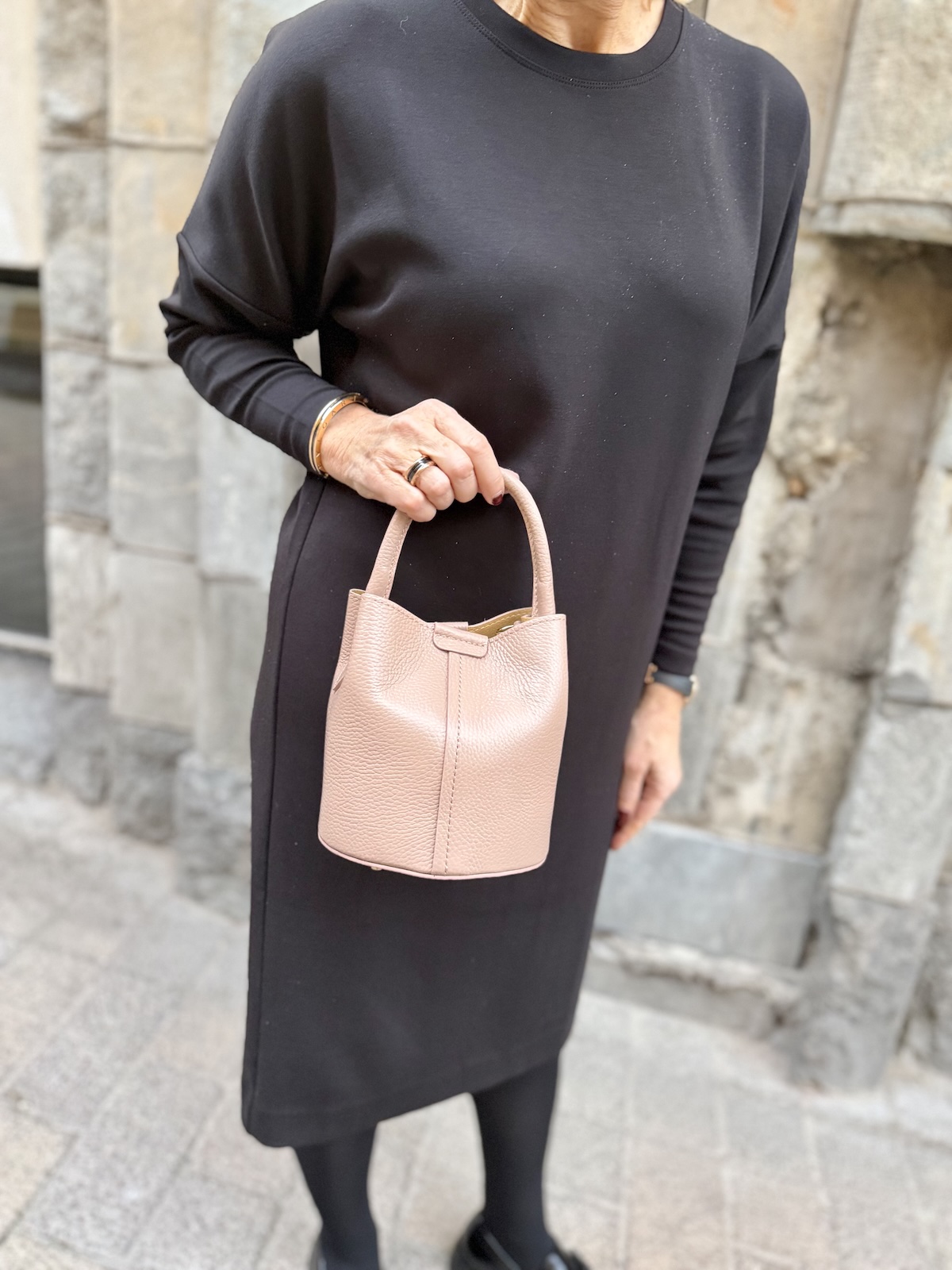 Rosalia nahkalaukku on super söpö. Laukussa on pyöreä pohja. Laukkua voi kantaa kädessä, käsivarrella, olalla tai olan yli. Laukkuun kuuluu pidempi hihna, joka on säädettävä. Hihnan pituus on max. 120 cm. Laukun koko on n. 17 x 18 cm ja pohjan halkaisija on n. 16 cm. Laukun pohjassa on kullanväriset nastat ja laukun sisällä on looppi neppareilla, jolla laukun saa kiinni. Laukun suussa on myös kullanvärinen magneetti neppari, millä laukun saa ihan kiinni.