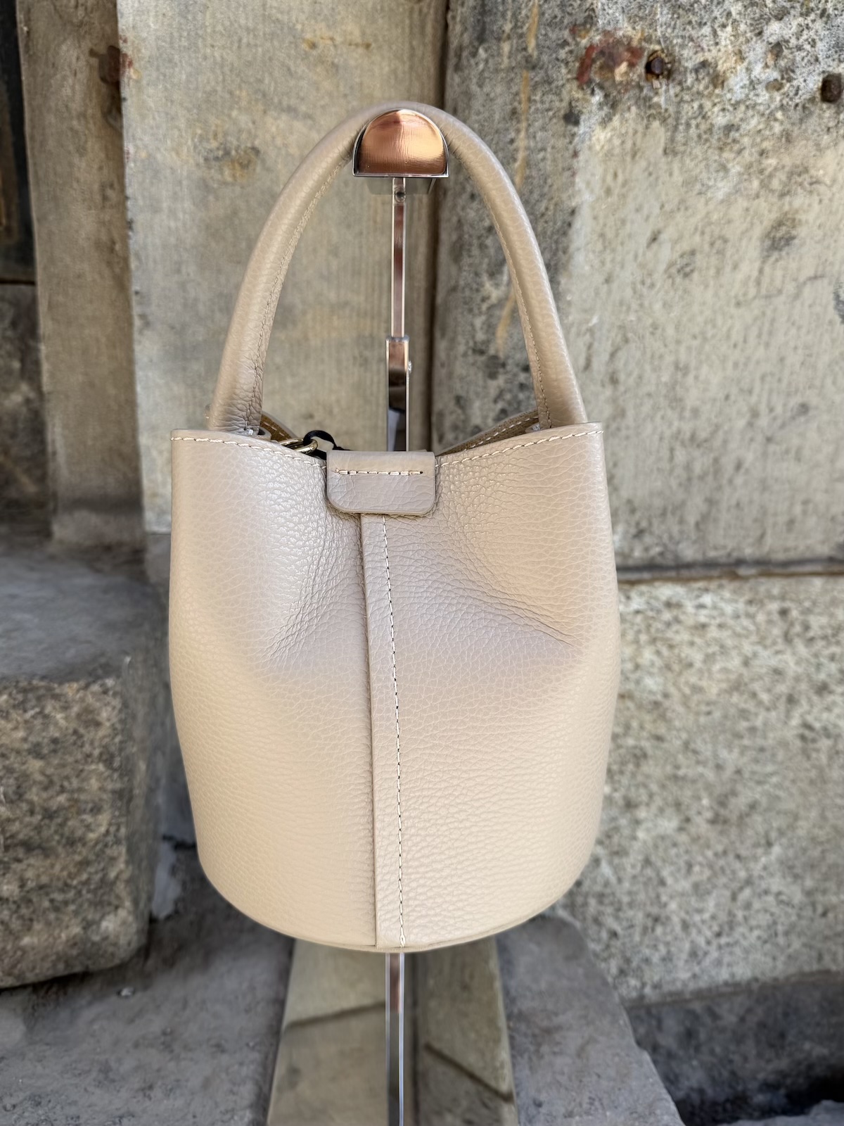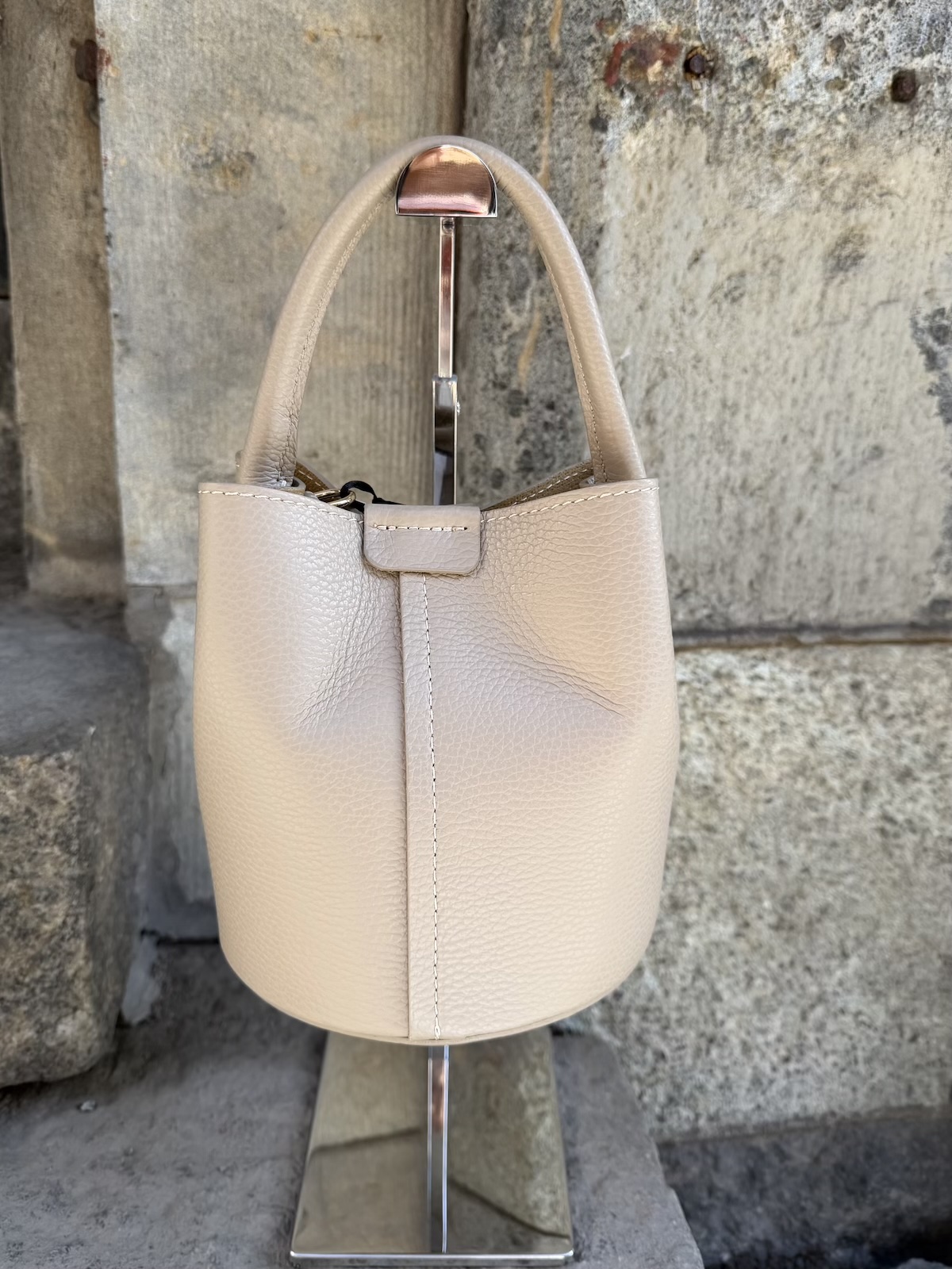Rosalia nahkalaukku on super söpö. Laukussa on pyöreä pohja. Laukkua voi kantaa kädessä, käsivarrella, olalla tai olan yli. Laukkuun kuuluu pidempi hihna, joka on säädettävä. Hihnan pituus on max. 120 cm. Laukun koko on n. 17 x 18 cm ja pohjan halkaisija on n. 16 cm. Laukun pohjassa on kullanväriset nastat ja laukun sisällä on looppi neppareilla, jolla laukun saa kiinni. Laukun suussa on myös kullanvärinen magneetti neppari, millä laukun saa ihan kiinni.