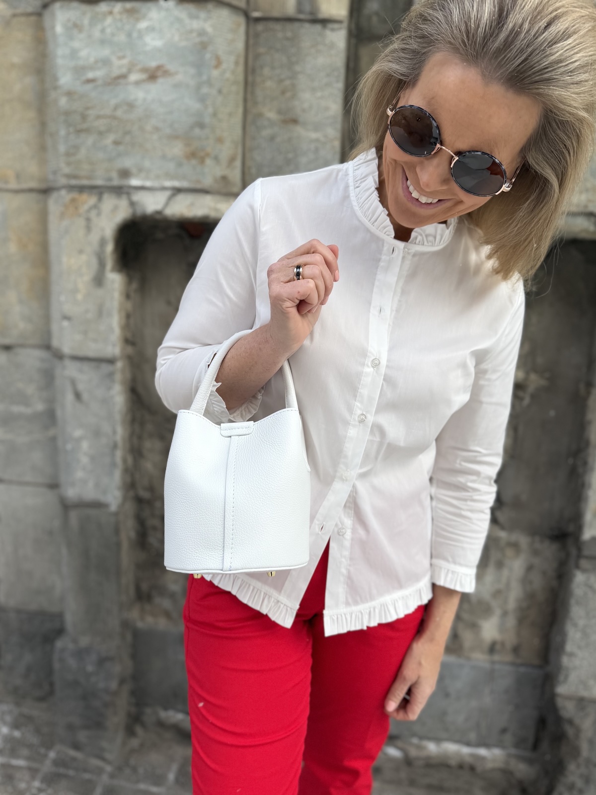 Rosalia nahkalaukku on super söpö. Laukussa on pyöreä pohja. Laukkua voi kantaa kädessä, käsivarrella, olalla tai olan yli. Laukkuun kuuluu pidempi hihna, joka on säädettävä. Hihnan pituus on max. 120 cm. Laukun koko on n. 17 x 18 cm ja pohjan halkaisija on n. 16 cm. Laukun pohjassa on kullanväriset nastat ja laukun sisällä on looppi neppareilla, jolla laukun saa kiinni. Laukun suussa on myös kullanvärinen magneetti neppari, millä laukun saa ihan kiinni.